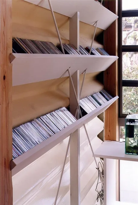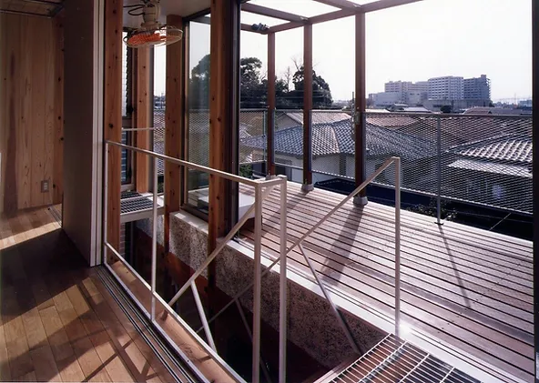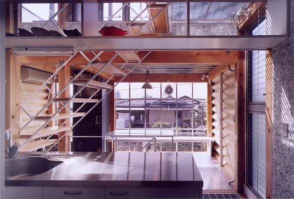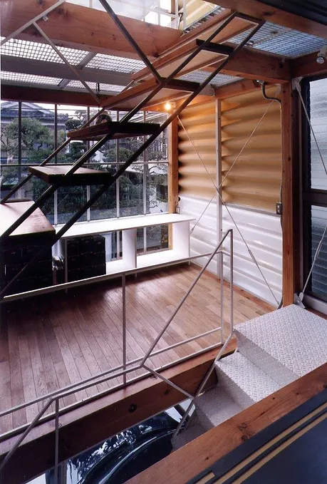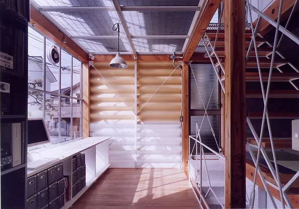 ジャムズ初期の作品で、敷地が12坪道路斜線を逃げると、建坪が7坪程度です。中心に階段を排して、道路側をパブリック、奥をプライベートにして、パブリックスペースと、廊下を兼寝ることによって、14畳の4層の空間を実現しました。プライベートな客間と寝室は引き戸で仕切られるようになっています。