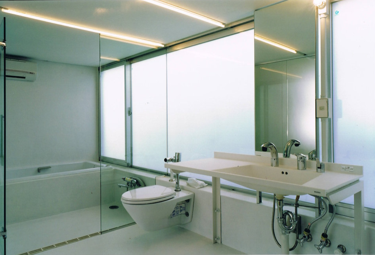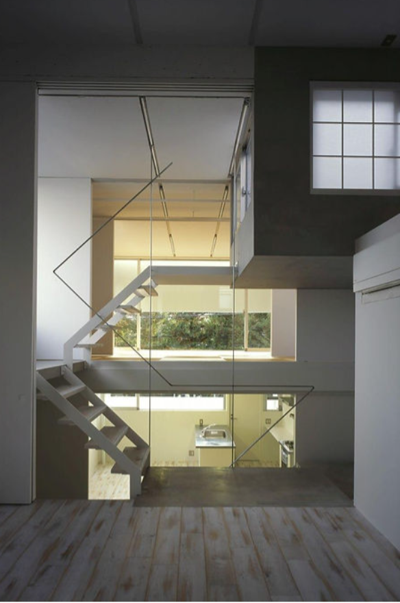 第一種低層住居地域のため、3階は日影規制が厳しいので、地下を設けて3層としました。アプローチは敷地内通路をスロープにして玄関を中間階の1階まで上ました。これは内部通路を最小限にし、生活の上下移動を、少なくするためです。みなが集う場所をこの1階に集めて、地階がアトリエ、上階が個室となっています。