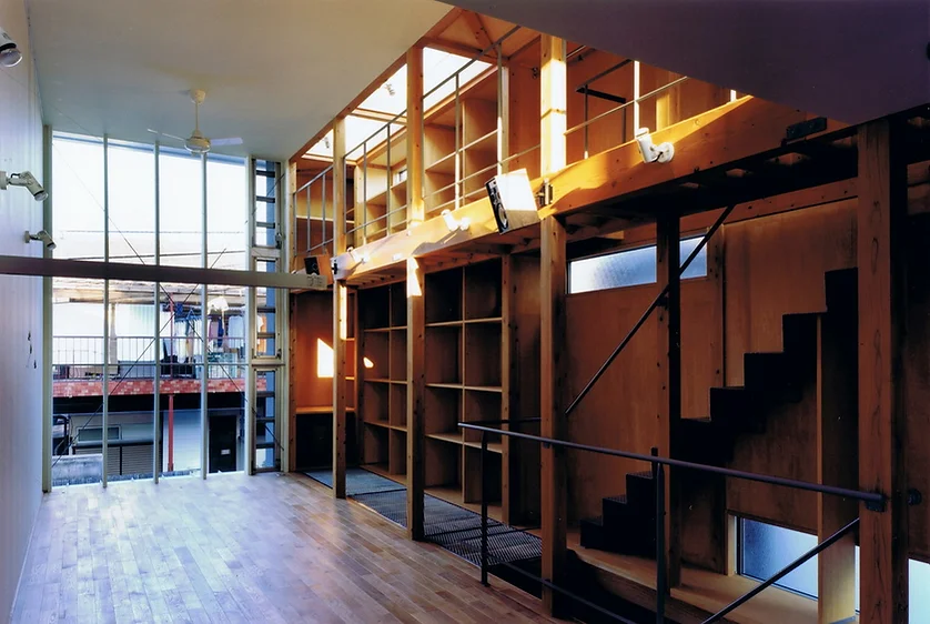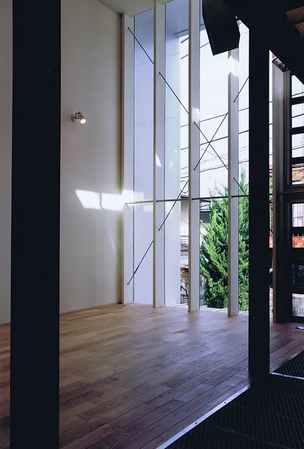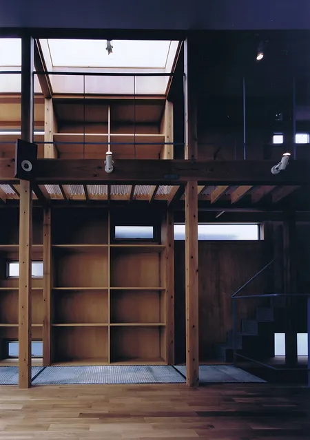 コンセプト上 建物は木を仕上げとした部分と 白い壁の部分にエリアを分け、木の部分は上下導線と収納を集約、残った大空間を白い壁の開放的な共用部としました。木の部分の床はメッシュ状になっていて トップライトの明りを1階の玄関まで落とす光井戸の役割を兼ねます。また、玄関ホールから2階へ上る壁面はすべて壁面収納となっていますが、ローコスト化を実現するために扉を設けませんでした。これは持ち物にこだわりがありディスプレイしたい希望を持つこの建て主に合った減額案といえます。