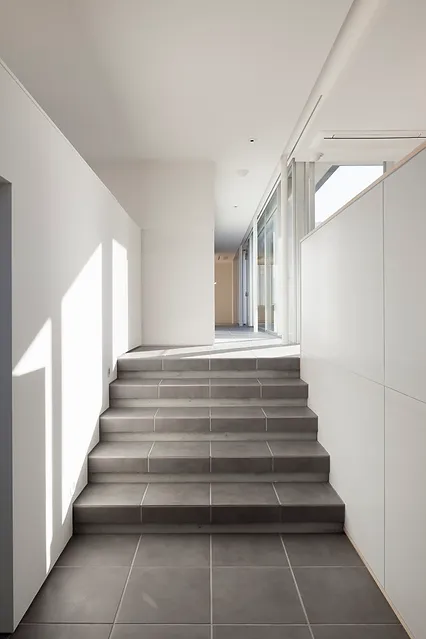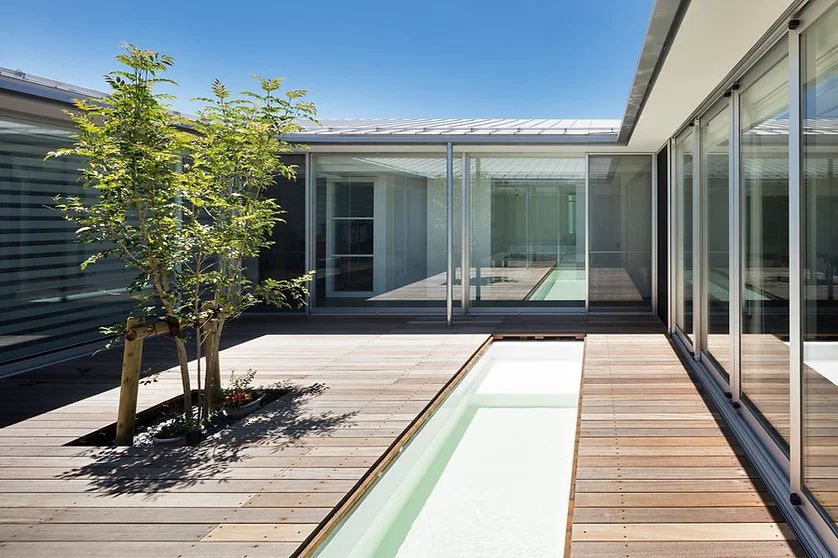 この計画では中庭にプールを設けています。水猟犬のルーツをもつラブラドールにとってはプールは最高の遊び場。日差しの強い時でも子供たちと水遊びをし大きな軒下で涼むことができます。この他にも大型犬でも楽に洗えるケアルーム、毎日の散歩に配慮したガレージ、人と犬とのゾーニング、キズ・汚れに強い仕上げなど 一つ一つ考察を重ねながらアイデアを散りばめました。