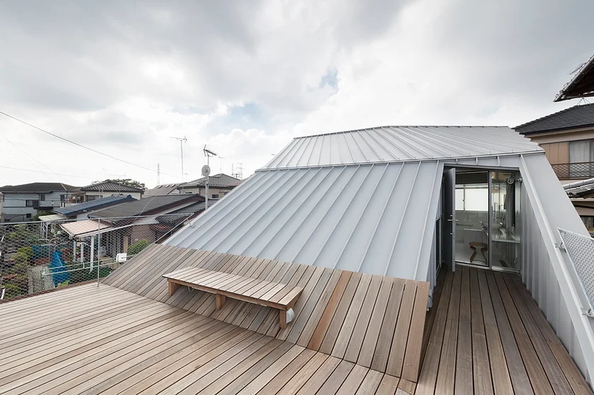 敷地は南西方向が三叉路で開けていたので西を道路につながるような路地上の庭とし、宅盤の高いご実家に沿うように南北に長く配置し、屋上デッキとご実家の庭を寄せました。手の届きそうな距離で交流を深め、採光を邪魔しないようにしています。建物が曲がっているのは、南の採光を得るためです。