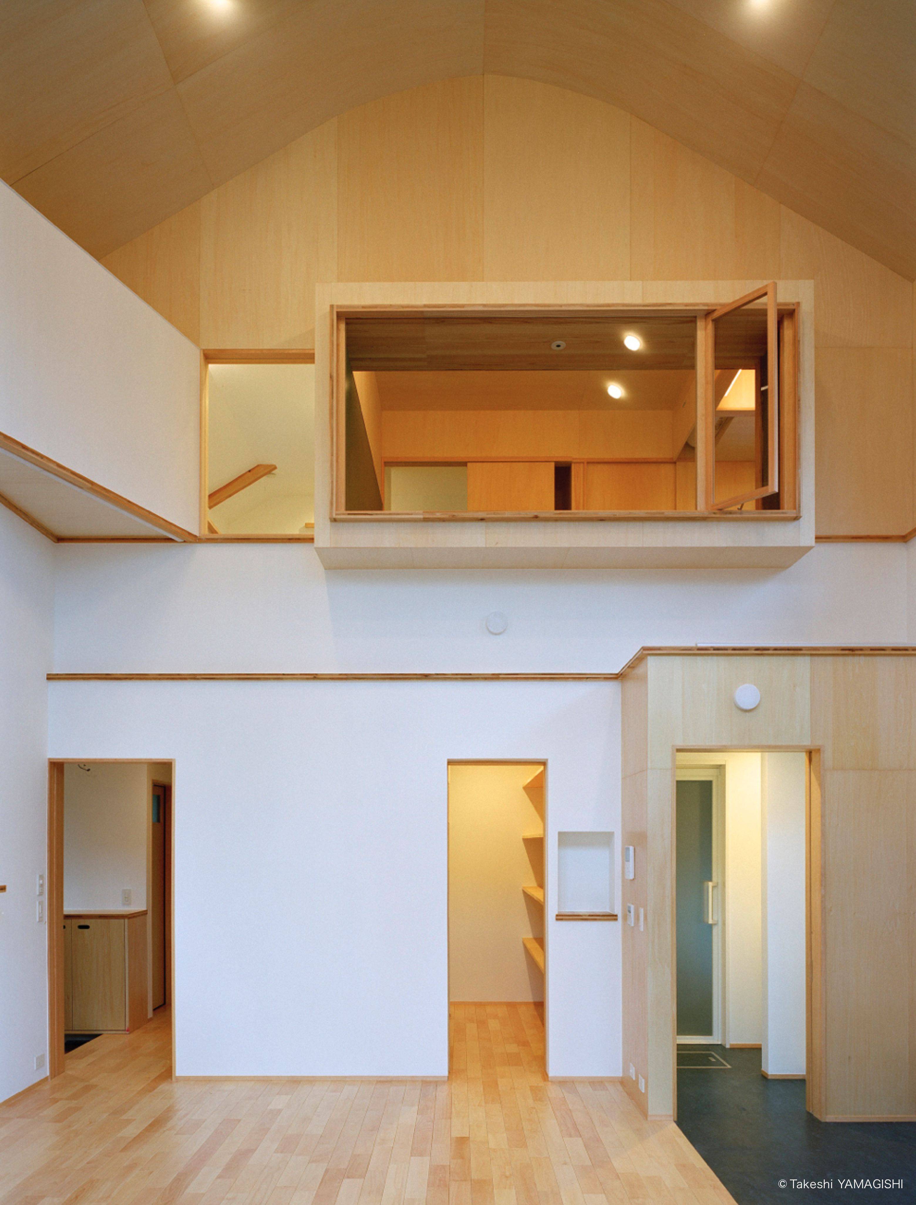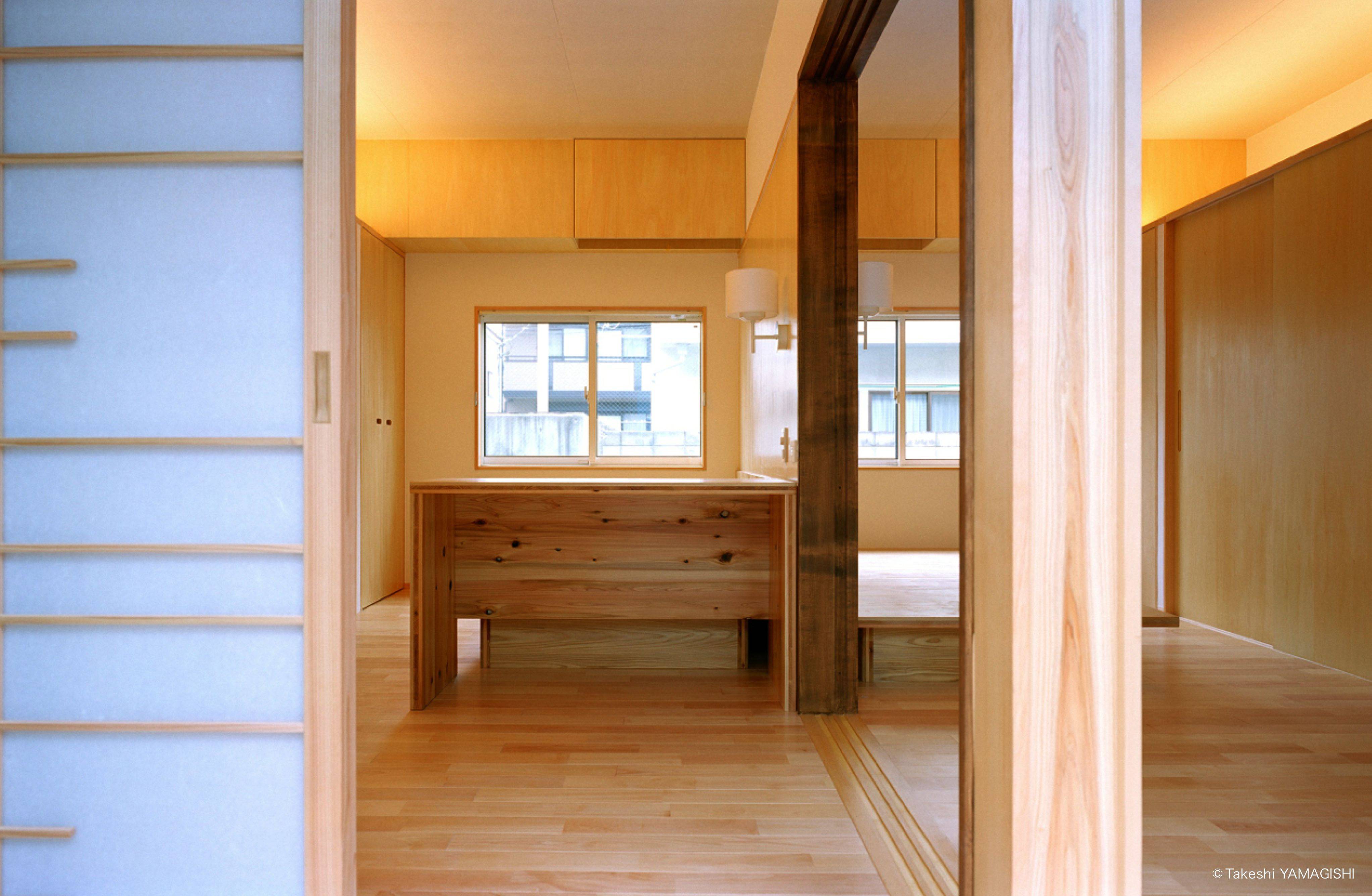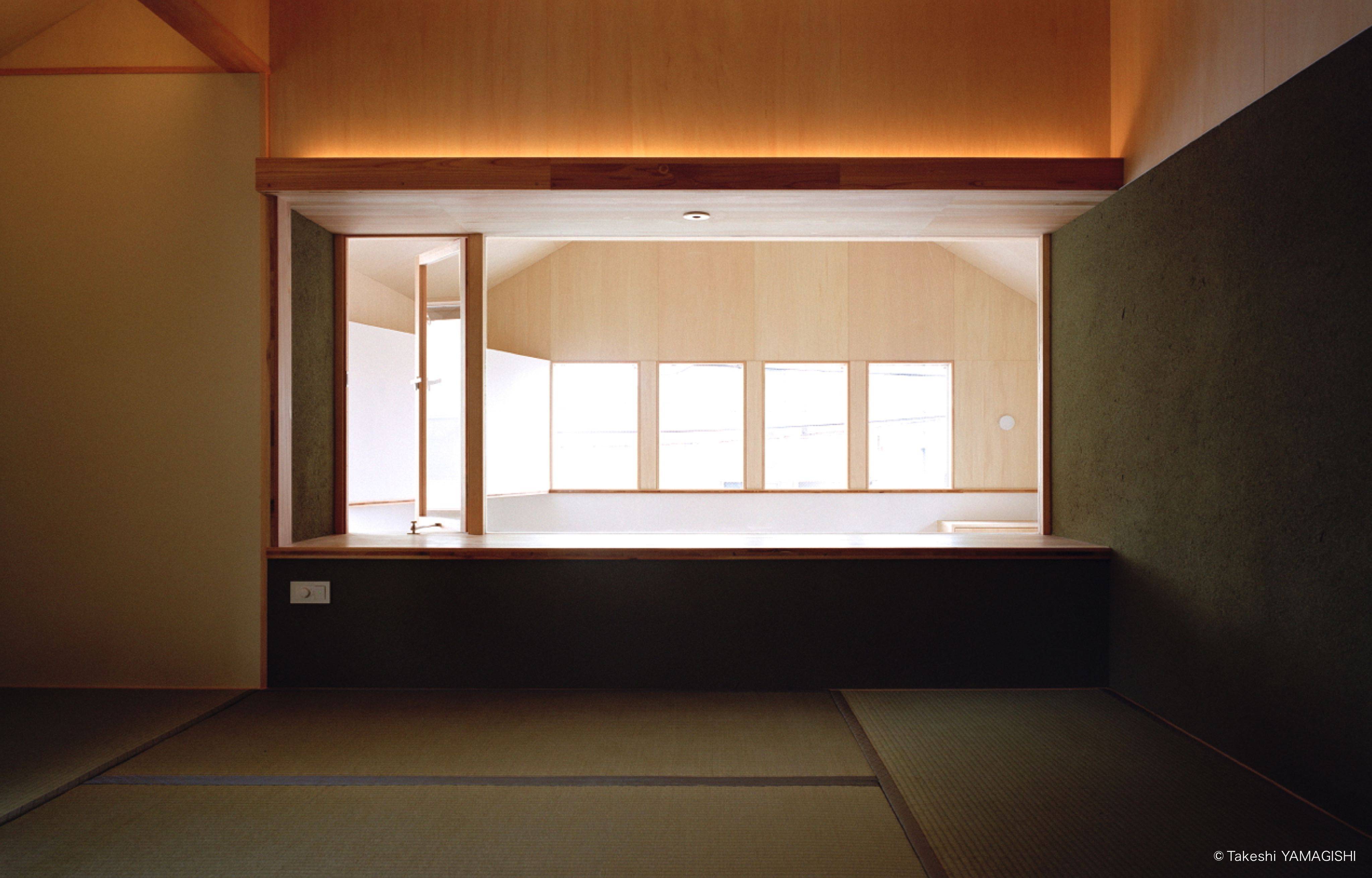 ゲストルームである和室は、ゲストがいないときは吹抜けを介してリビングの延長として使えるよう、釣床(つりどこ:床柱・床板を省略した床の間)に対する「付書院」の障子を取り払って大開口とし、リビングと一体的でコミュニティ・バルコニーまで見渡せる、浮遊間のある和室とした。