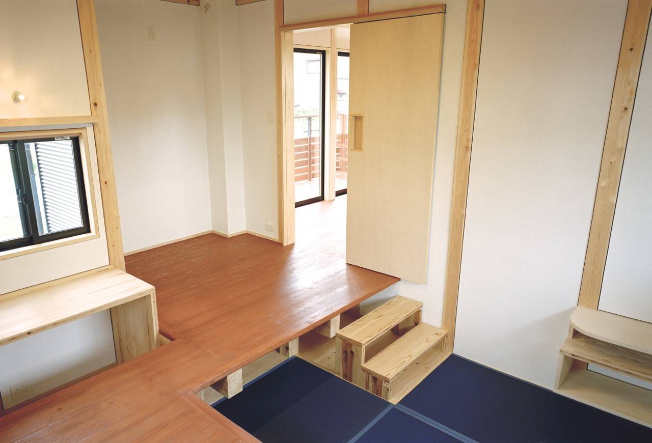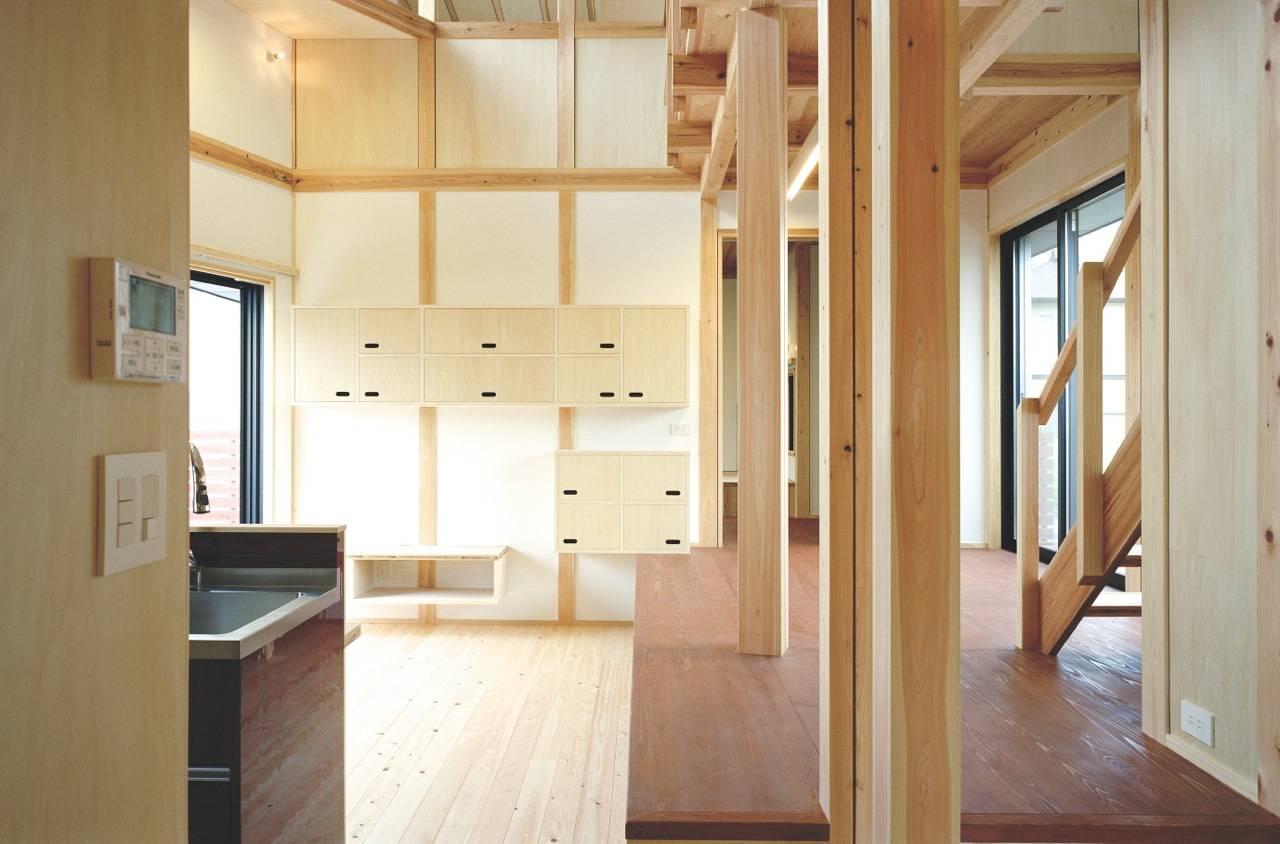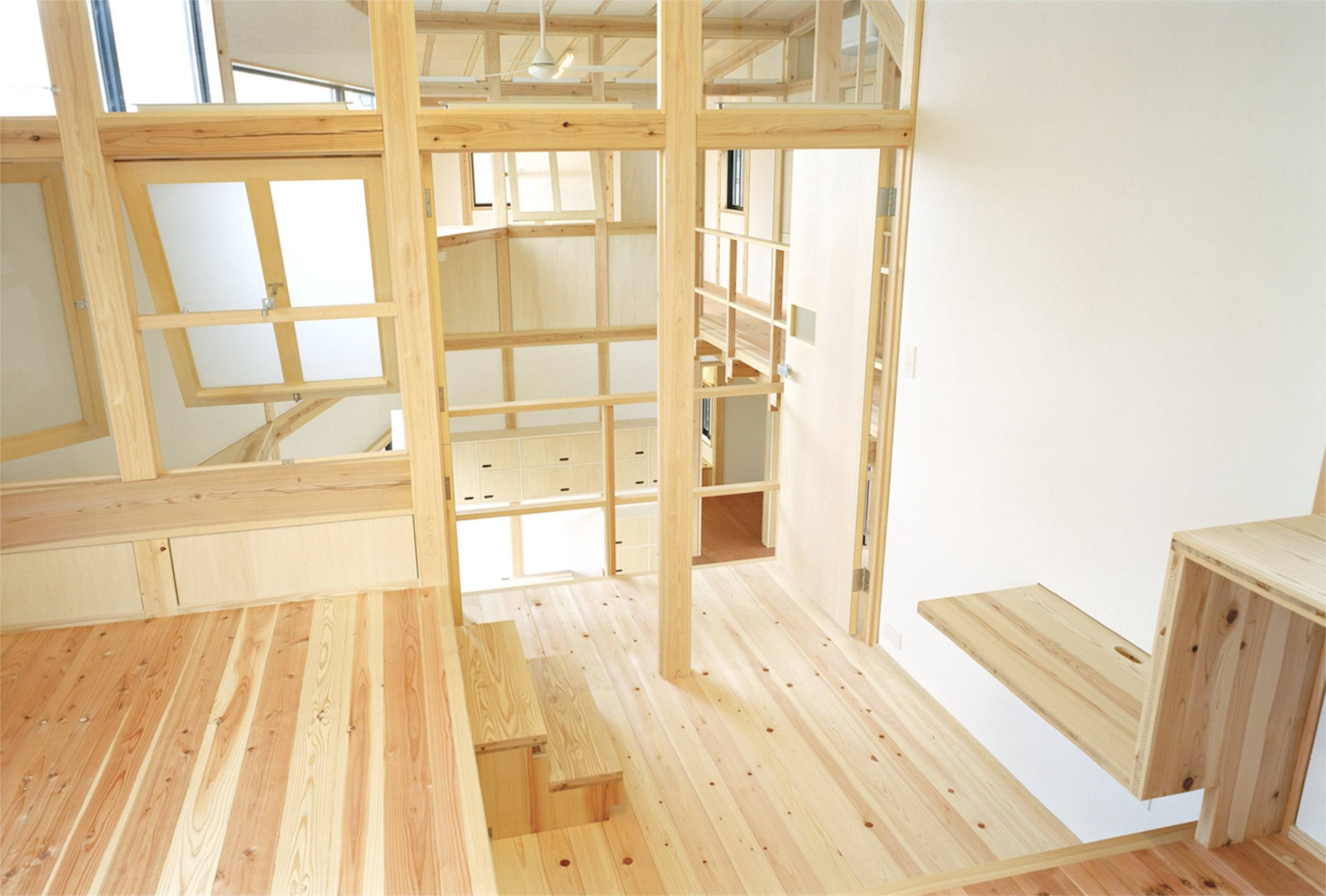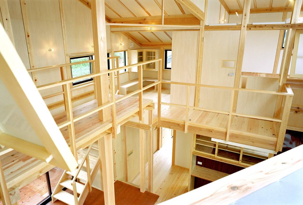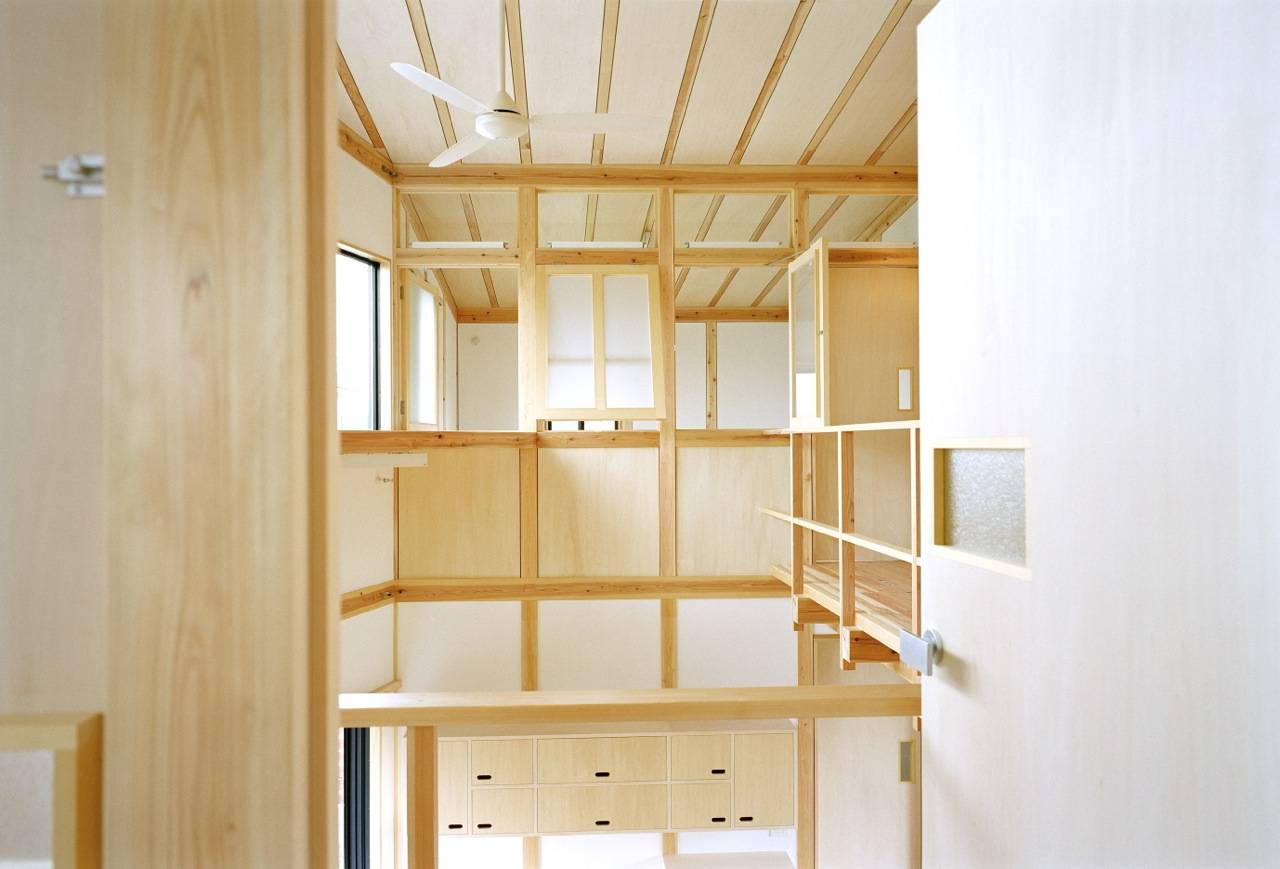そして、その4つの個室を結ぶ空間が単なるヴォイドではなくレベルの異なる「縁側」や「ロフト」という中間領域的なものを挿入することで、またその縁側やロフトに個室が浸食されることによって、大きな一つの「地形」を共有しているような、閉じた個室でありながら部分的には共用部の一部であるようなそんな緩やかな「場の共有感」を作り出すことを目指した。