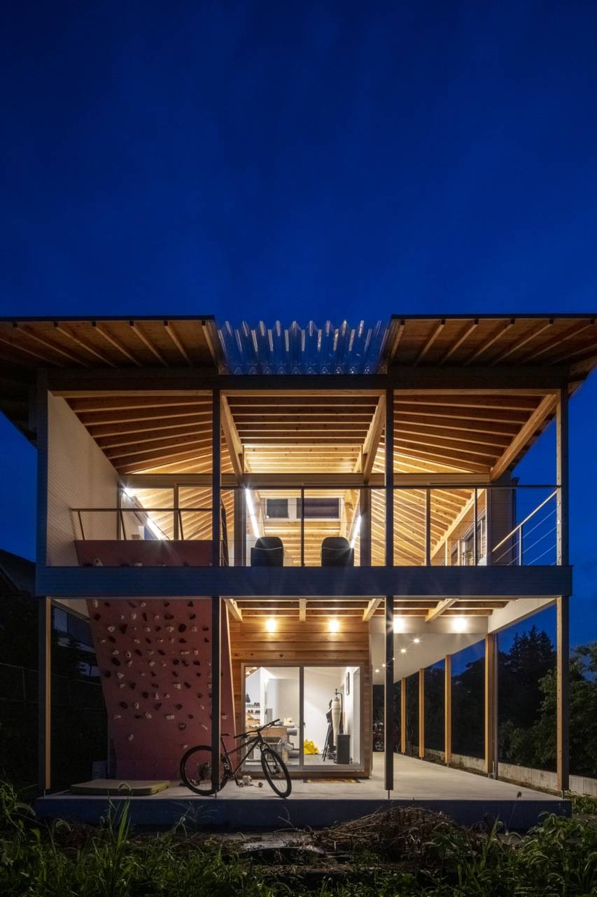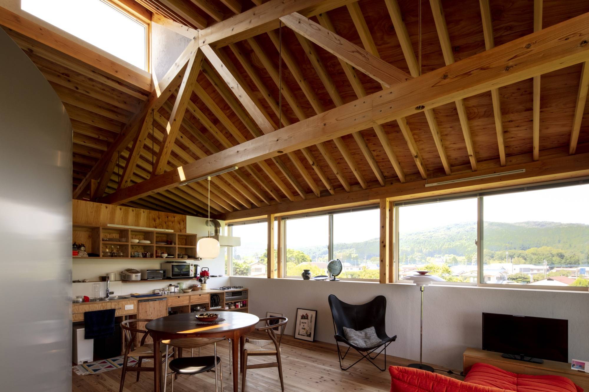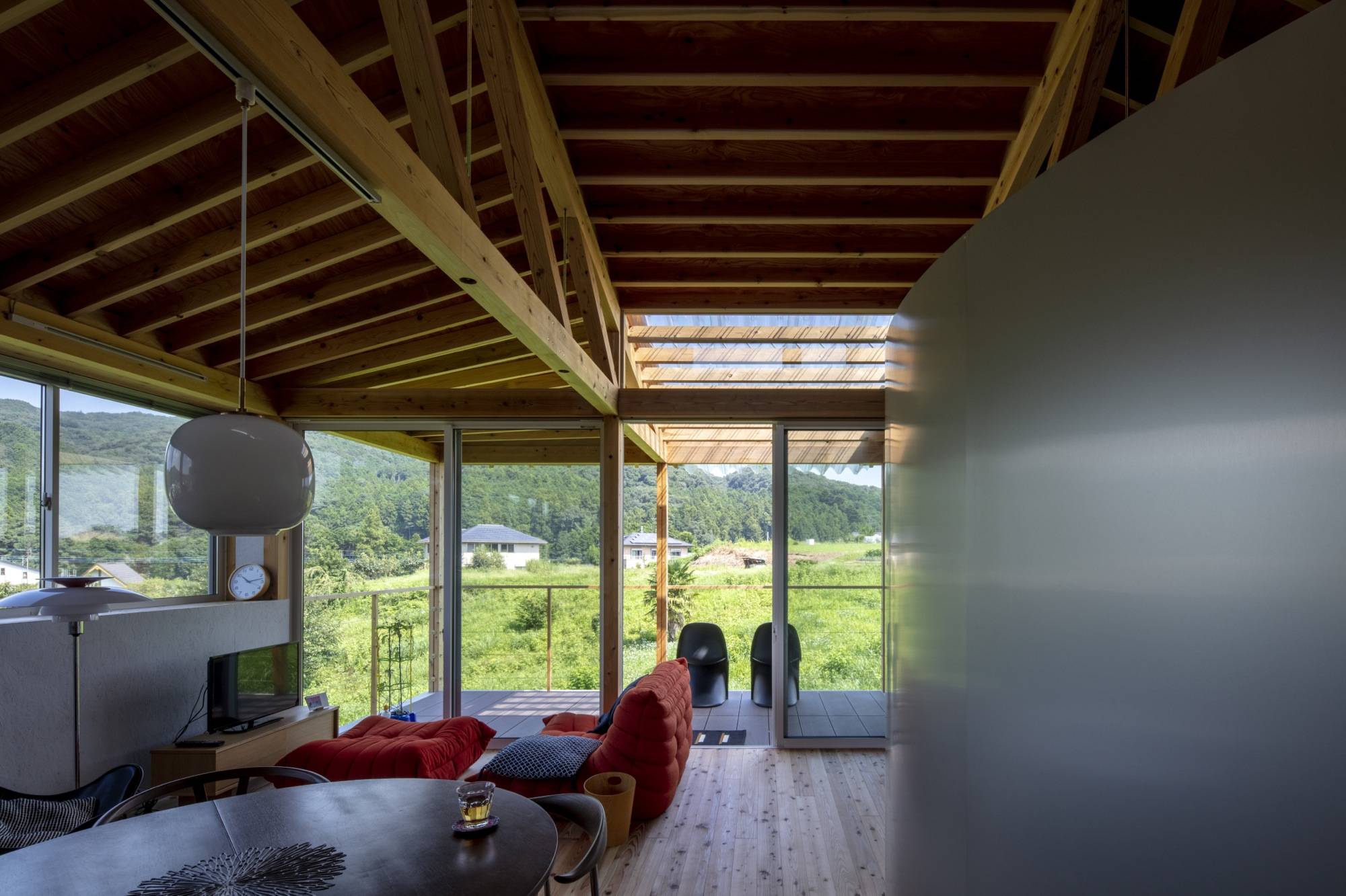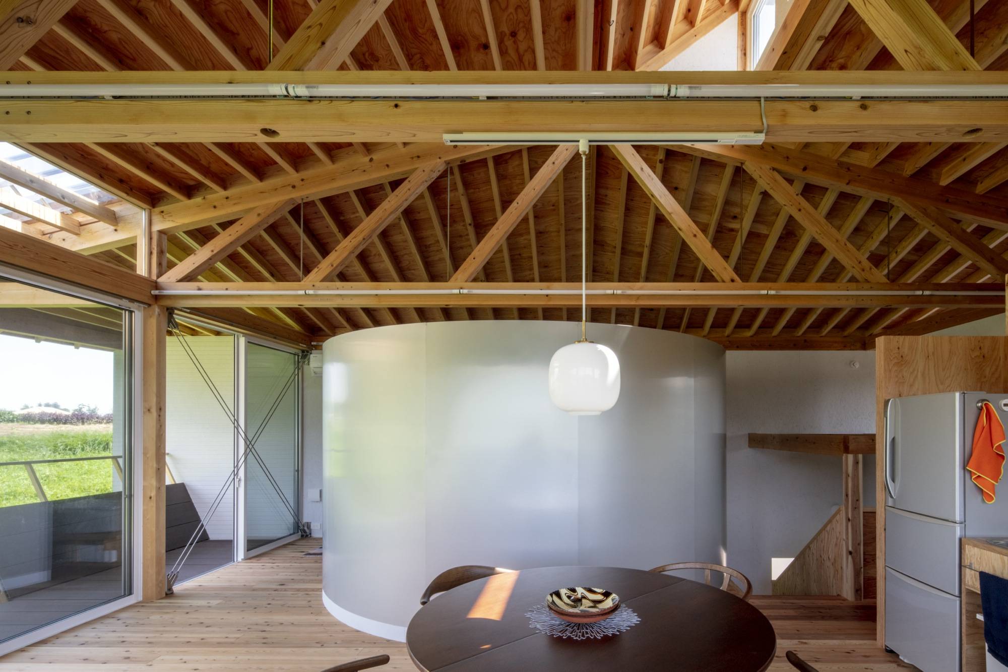 さまざまな開き方・間仕切り方のアイデアを提案する中で、全体として半屋外的な空間を1階・2階共に広く取り、また必要な間仕切り壁は木の収納としての壁や、柔らかく風景を反射する半円の壁として配置し、住宅内外の境界・住宅内部での境界共に、なるべく空間の連続性を途切れさせないようにしつつそれぞれの場が個性をもつ、連続性のある空間でありながらも均質ではない、という場のあり方を重視して設計した。