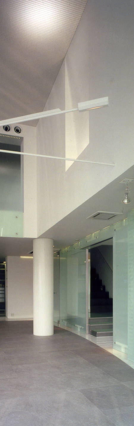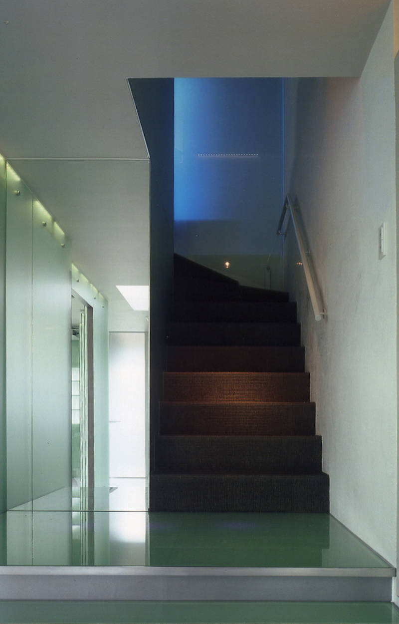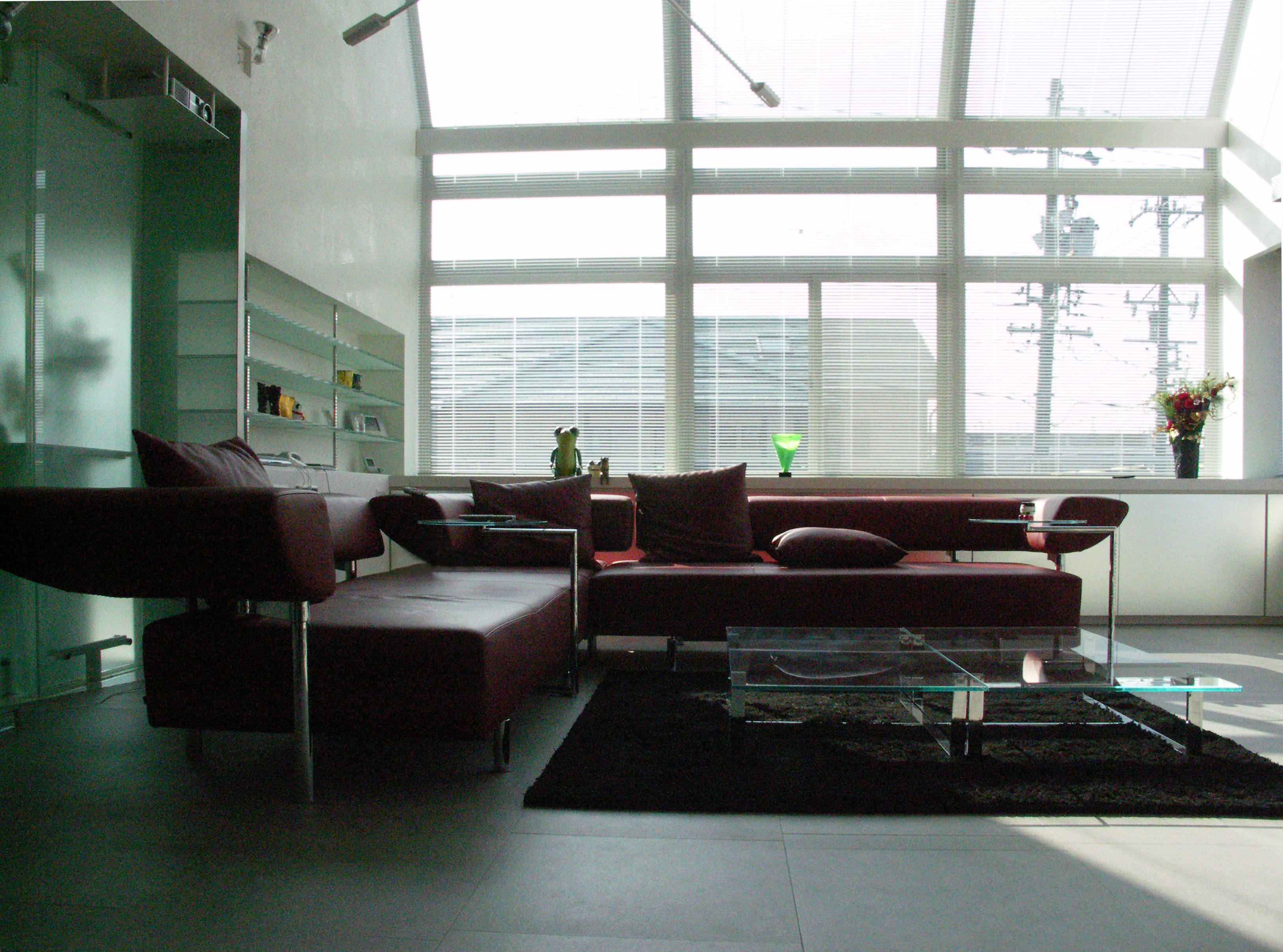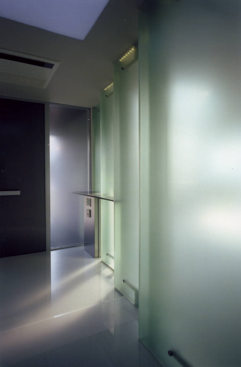 この改修は、もはや子育ての家ではない新たな住まい空間へと刷新したいとのことでスタートしました。会社経営者であるご主人により、レース仕様の車のイメージ(具体的にはフェラーリ)をインテリアの主モチーフとしてあたかも都心の外資系高級ホテルのようなややゴージャスな住まい空間を目指して欲しいと方向性が示されました。トップライトから自然光が指す玄関では、床は白磁器タイル壁はイタリアンスタッコ塗りとしています。