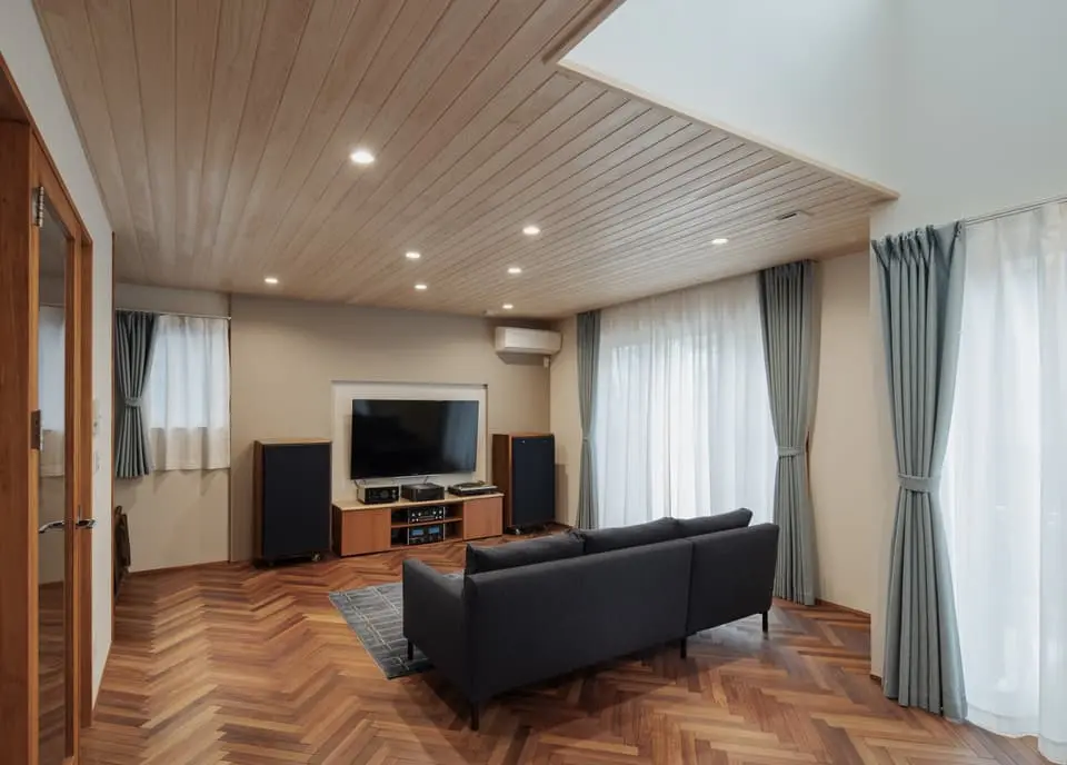 カリンのヘリンボーンを貼った広々としたLDKが家族の団らんの場所で、吹抜けで2階の各個室と空間的に繋がる構成となっています。