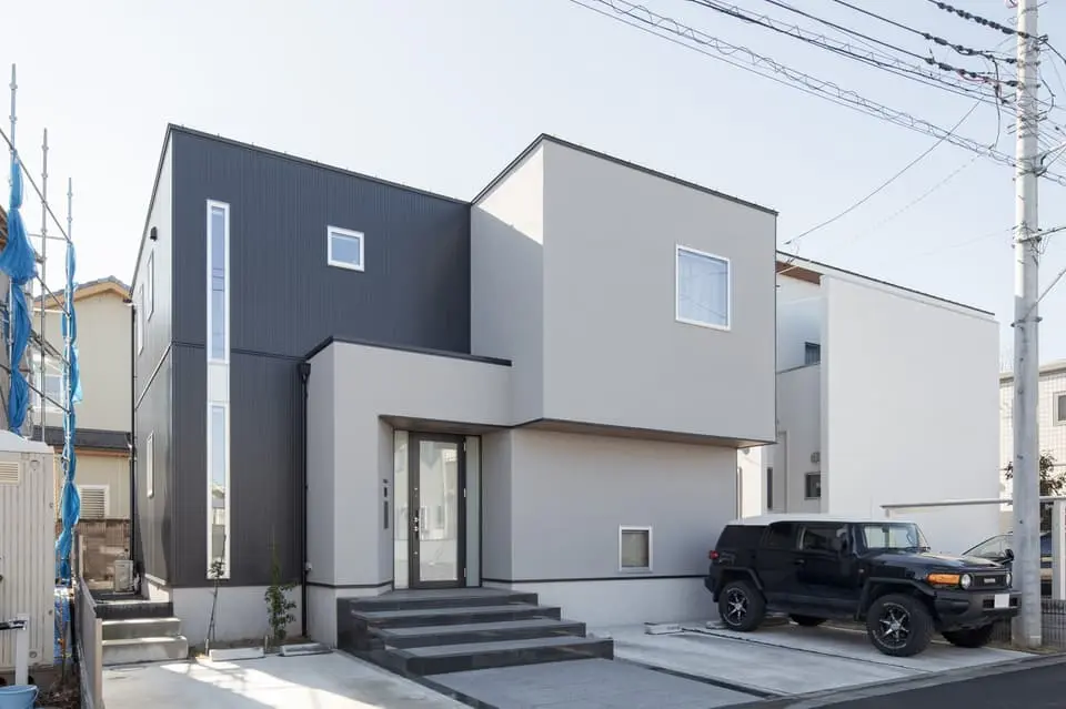 つくば市内の新しい住宅地に位置する北側道路の敷地で、建物はモノトーンの四角の箱を組み合わせたようなデザインとしました。