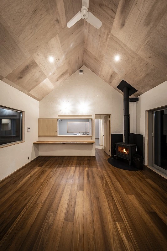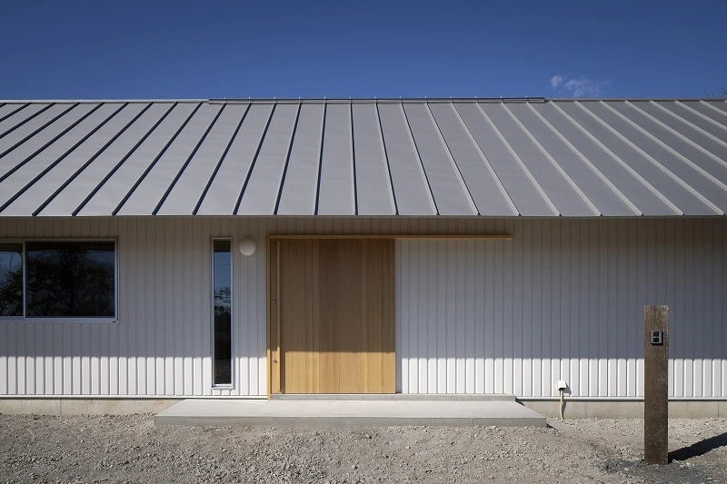 屋根は切妻の8/10勾配で軒は1,365mm出しています。整列して並ぶハゼや直線の軒先で屋根面を強調し、間口の広い建物のファサードバランスをとるように考えました。屋根の勾配を大きくする事で、部屋の天井高を確保しており、一部は小屋裏収納としても使えるようになっています。