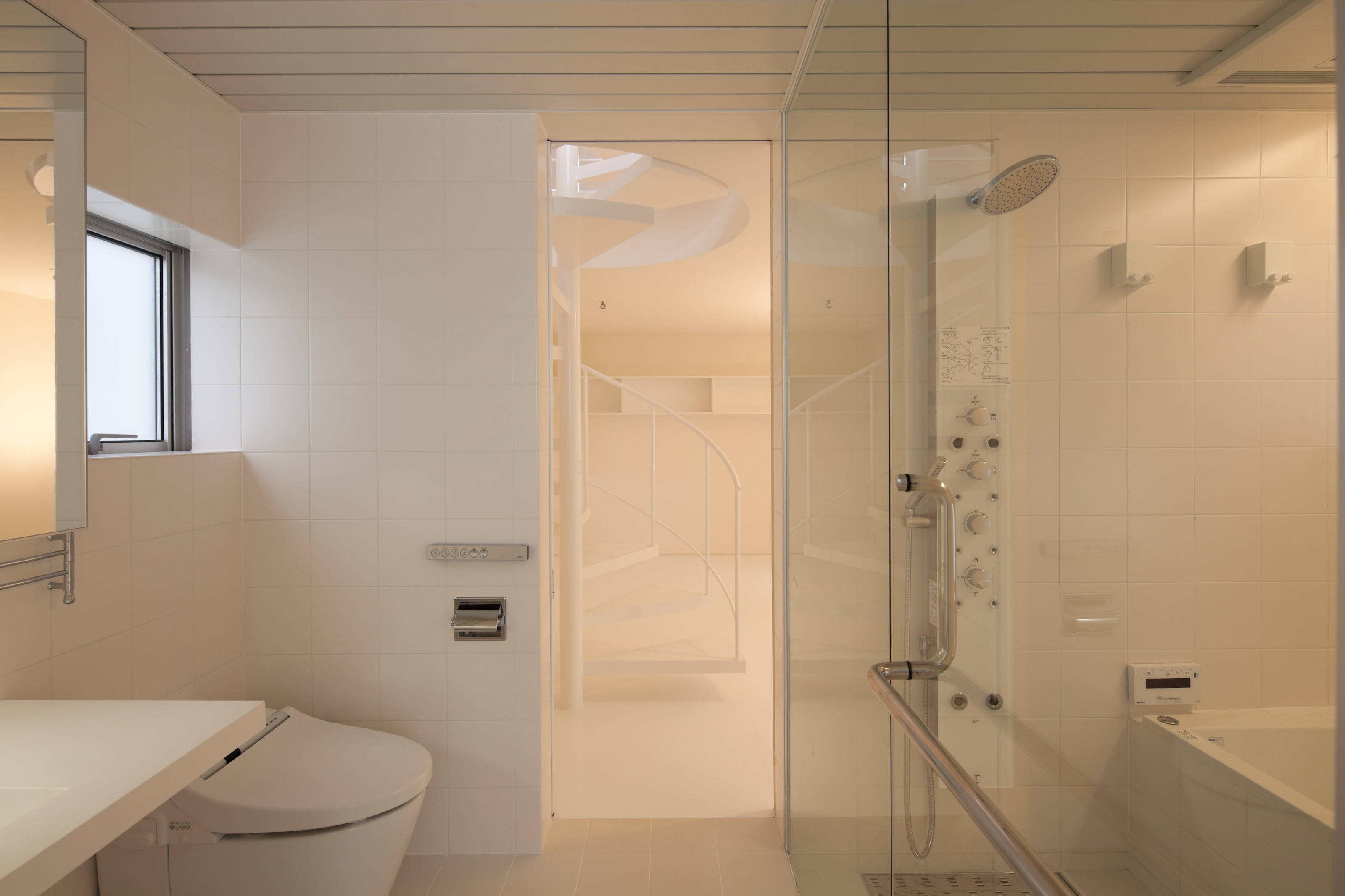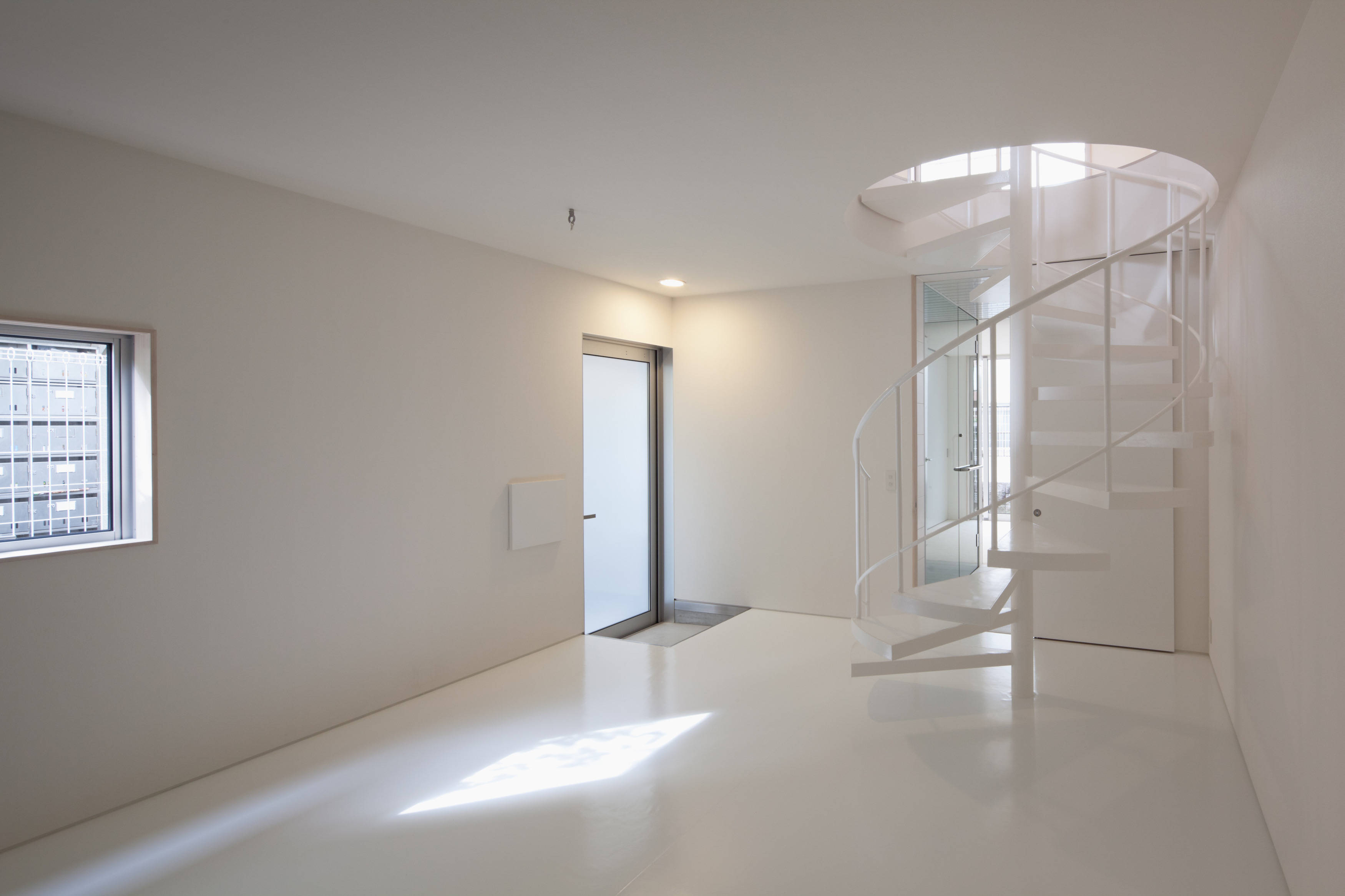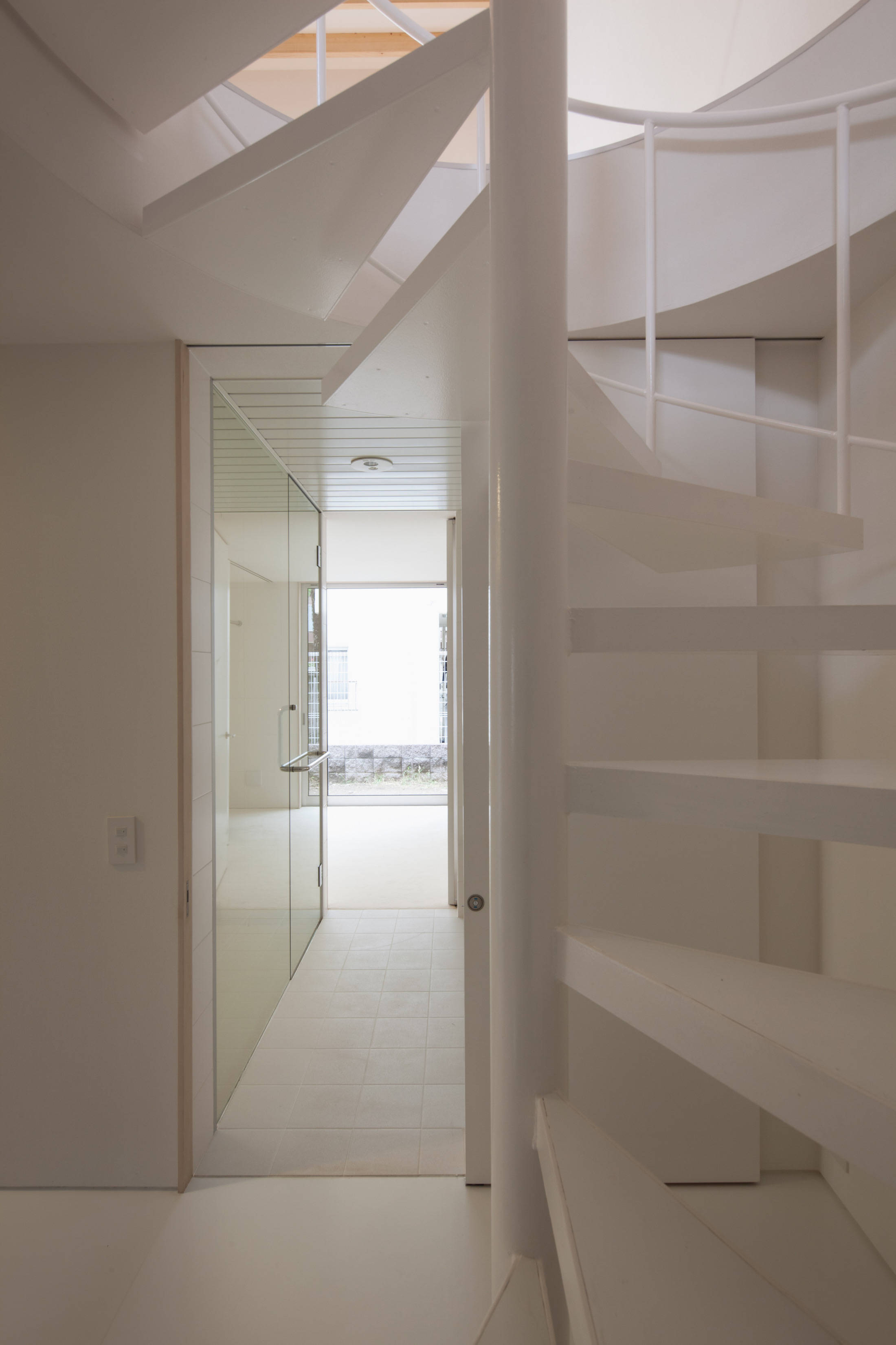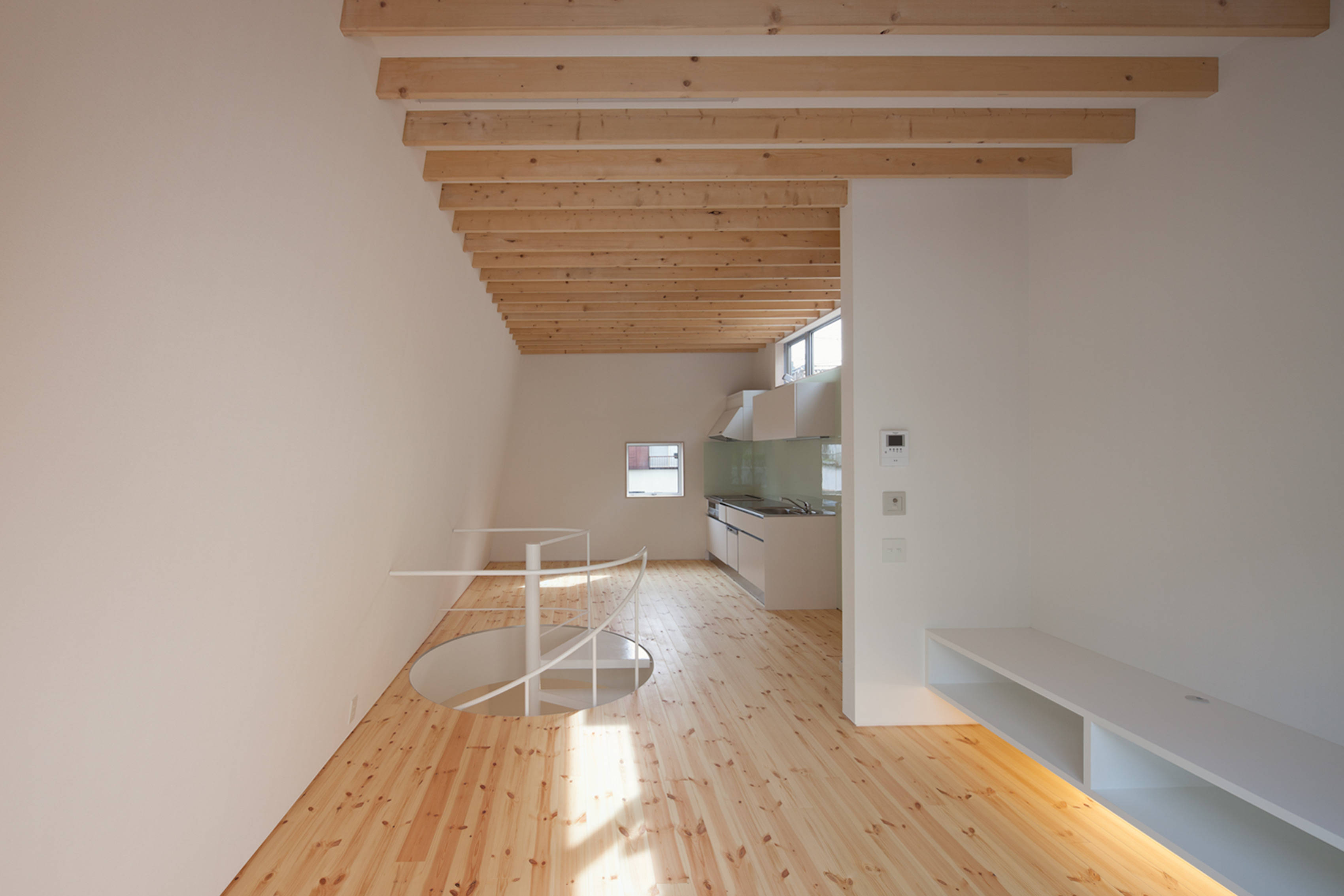 1階は長方形のプランの中央に玄関と2階への螺旋階段、それに浴室などの水周りを計画して、両側に子供部屋と寝室に分けました。