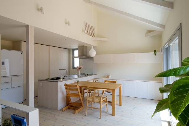 構造材は地元のさいたま県産材、断熱材・サッシ共に木材を使い、 子どもたちにしっかり地球のバトン渡せるよう考えて創りました。 間取りはゆるやかに繋がり、また可変性を考え、コンパクトに暮らせるよう設計して います。一部DIYした土壁を除き、壁仕上は持続可能性のあるペイント仕上です。
