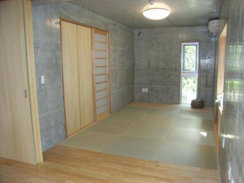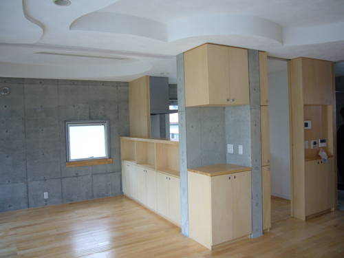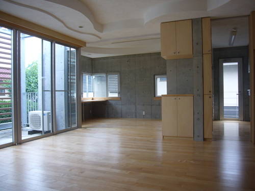 1階にギャラリースペースを併設したコンクリート打ち放しの2階建て二世帯住宅です。 1階部分の道路側にお母様の趣味である陶芸の作品を展示したり、あるいは一般の方にお貸しできるようにギャラリースペースになっています。 1階の南側をご高齢のお母様の住まいに、2階にはご夫婦と小さなお子様の3人の住まいとなっています。