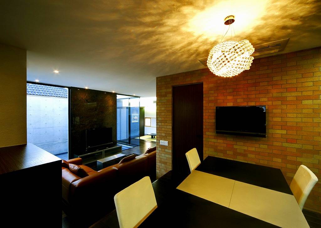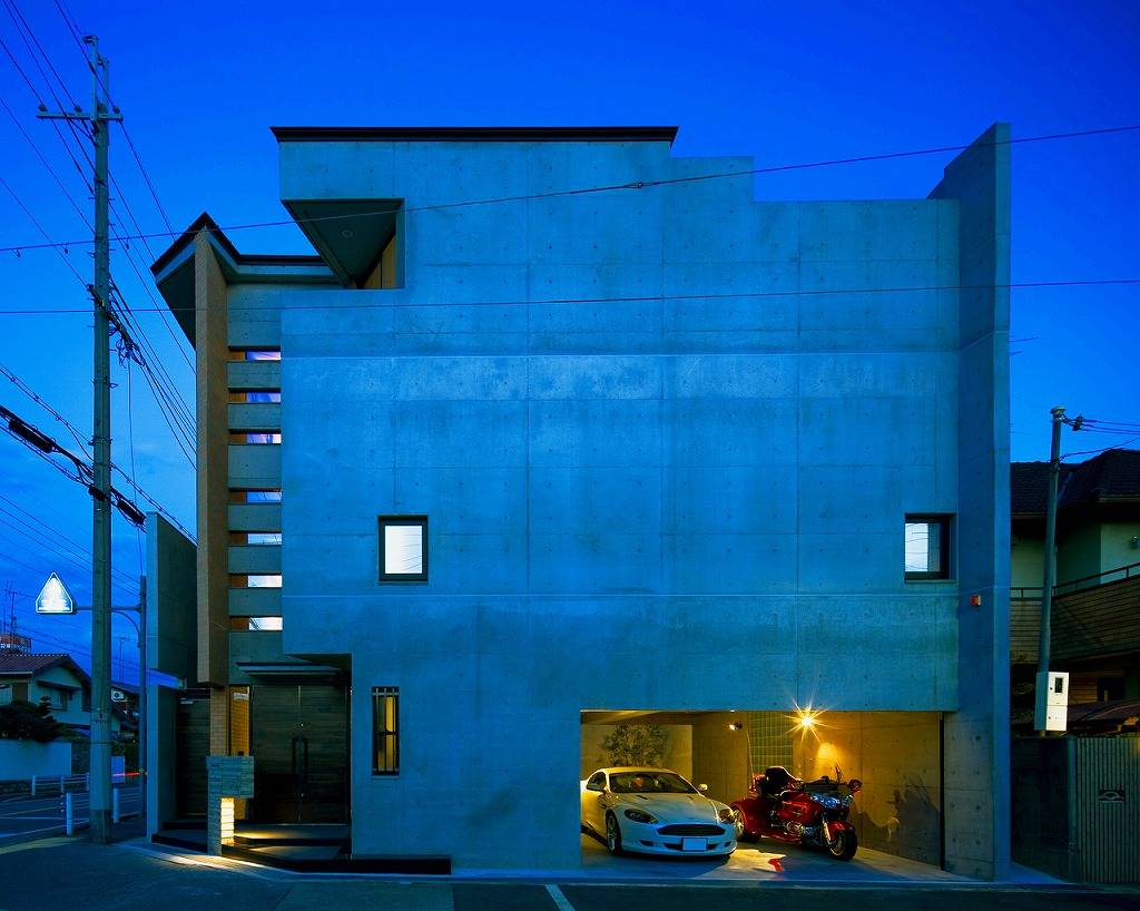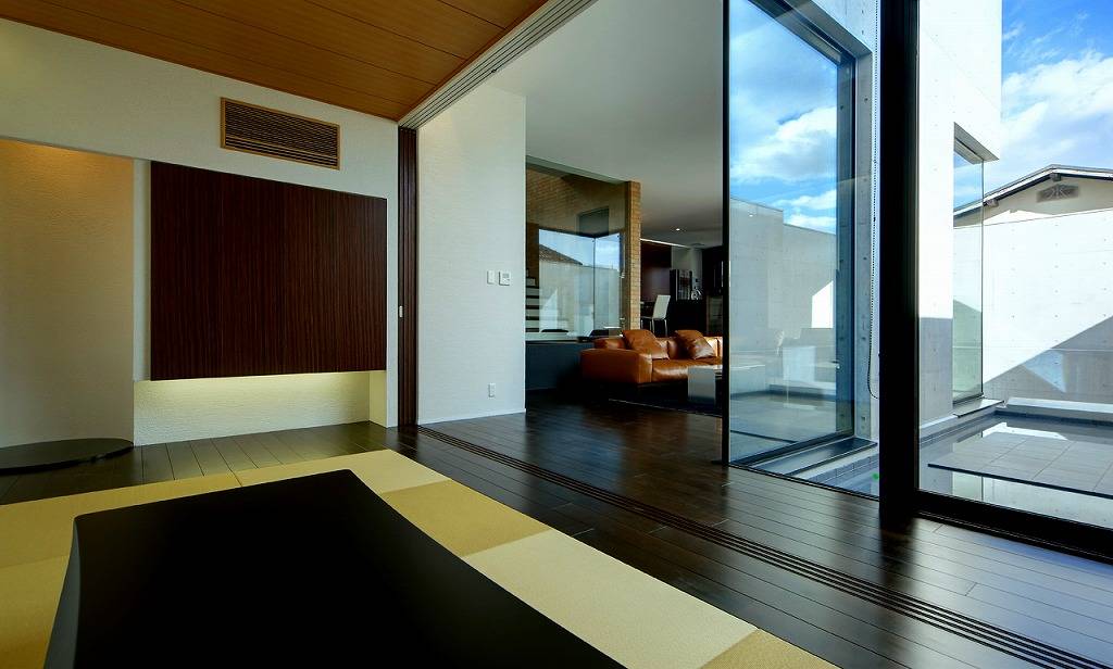 カーマニアでもある施主の要望で車6台を止めることの出来るカーポートを1階に設けたために、約60坪の敷地では必然的にリビングなどパブリックスペースは2階になる平面計画になりました。ただし2階の室外テラス空間に水盤のある塀で閉ざされた光庭があり、周囲の目線を気にすることなく連続性のある外部空間と内部空間を楽しむことが出来ます。