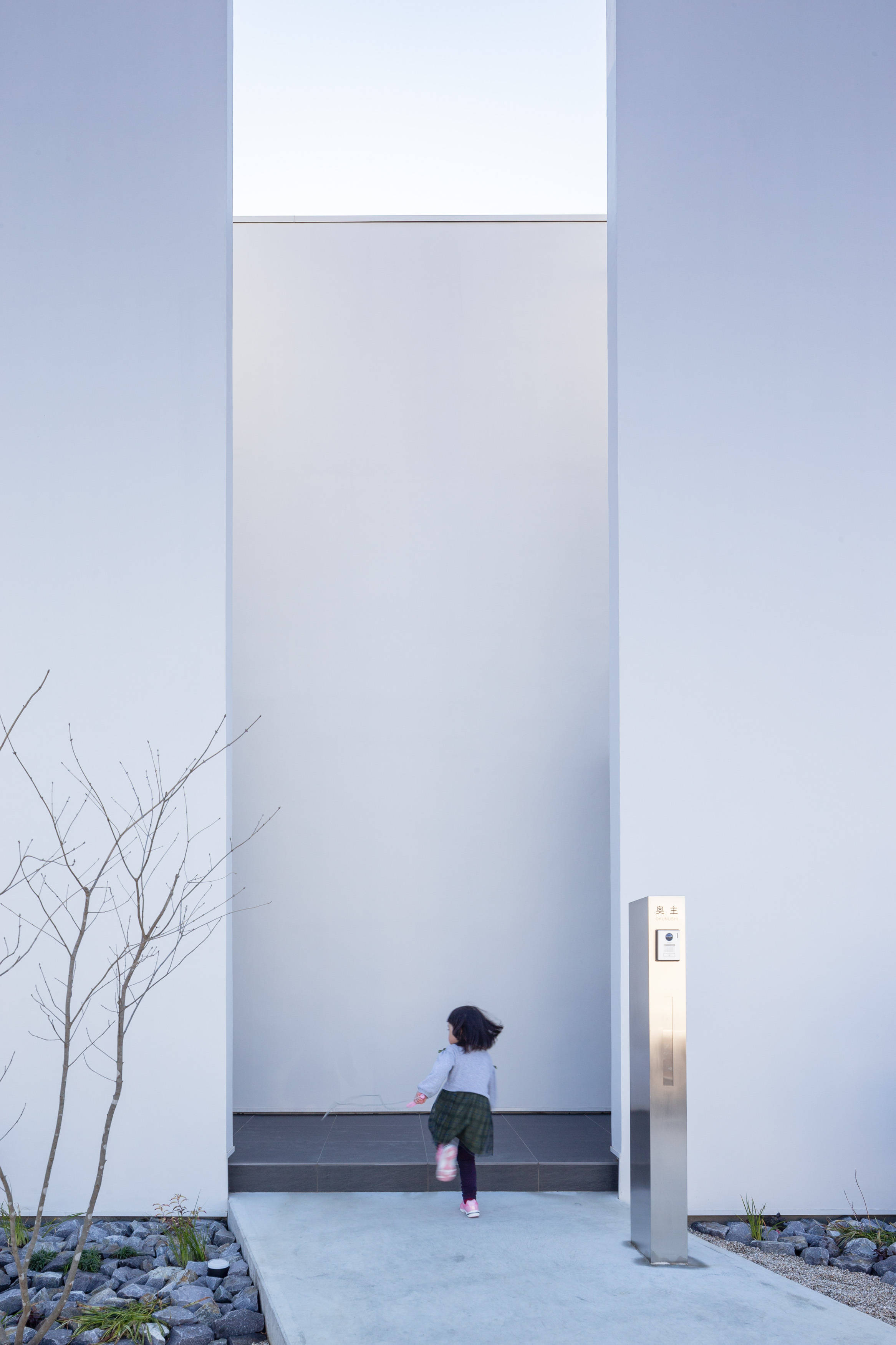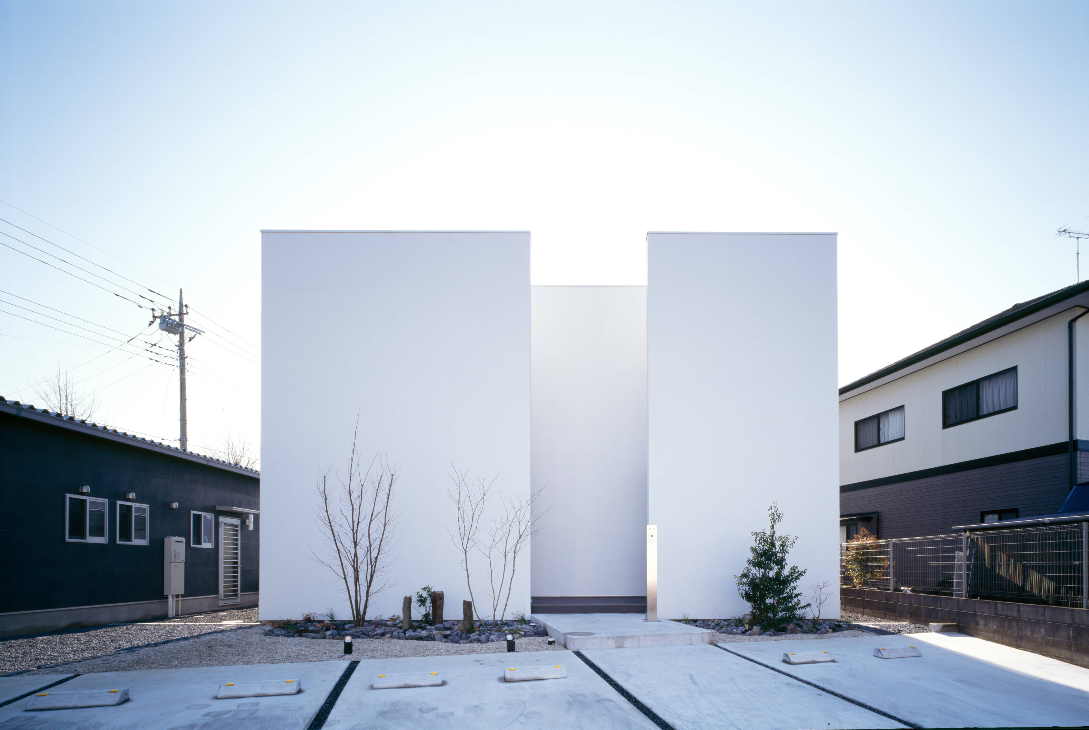 白く塗りひろげた(spread)壁が前後に重なったファサード。