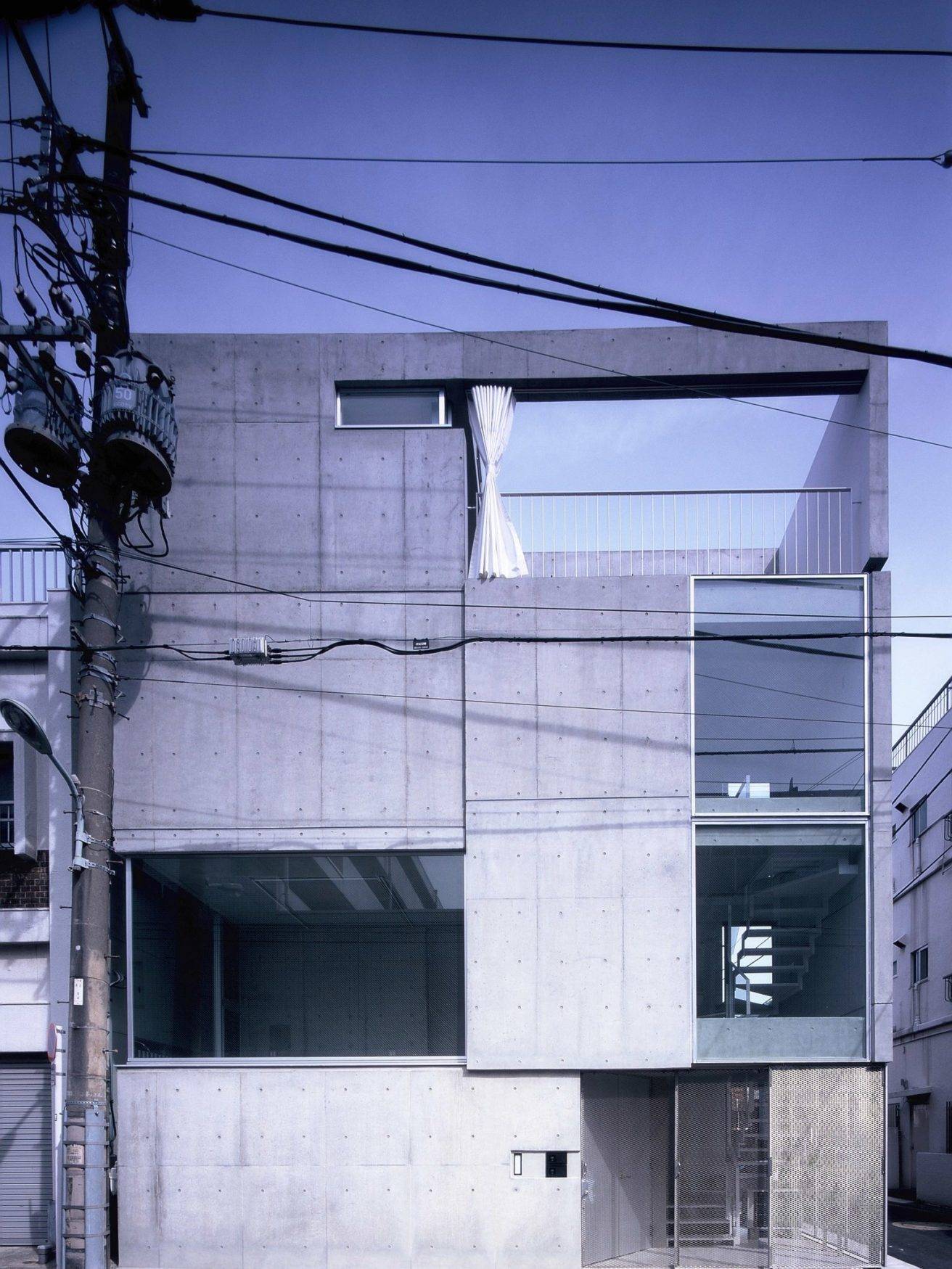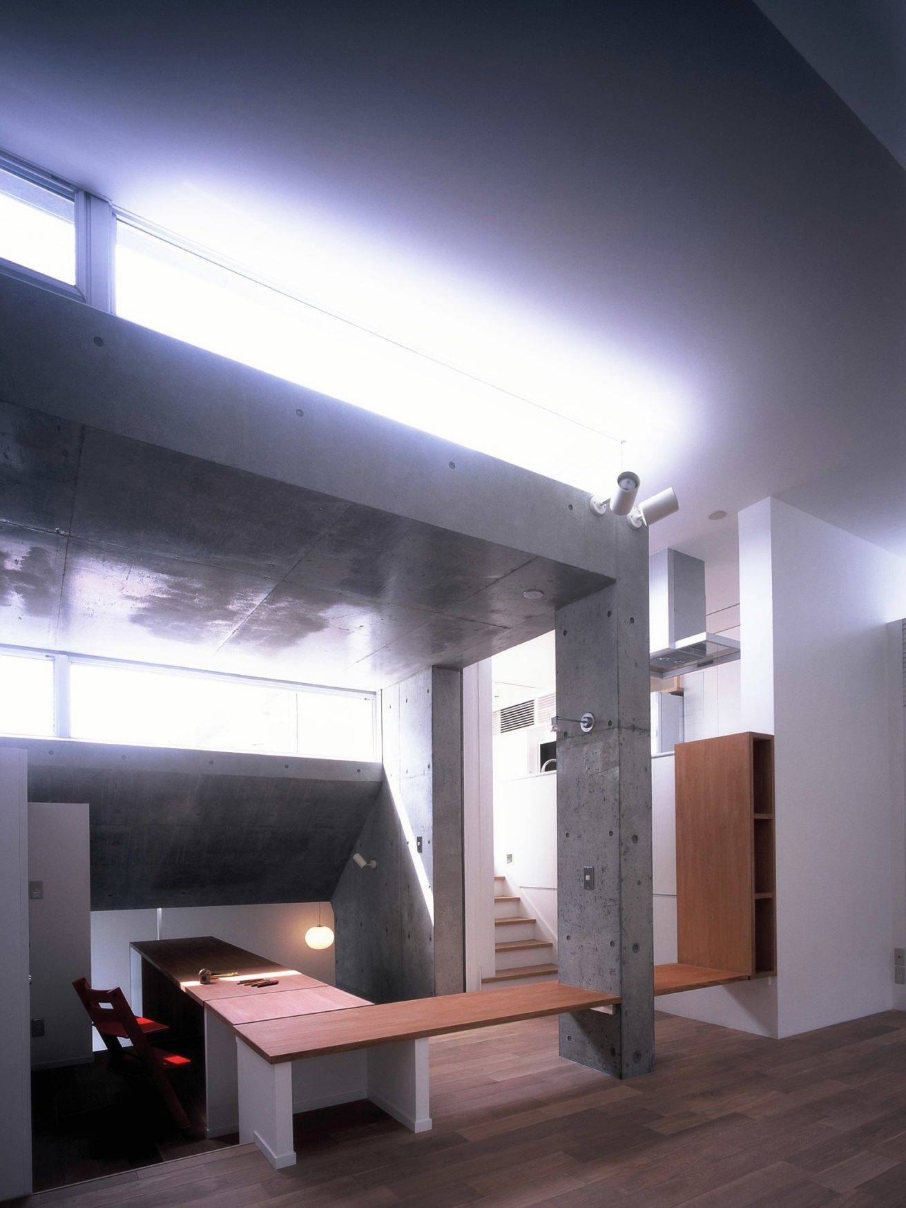 一見するととてもクールな表情を持つ建物、でもその裏にはとても熱い想いを込めて丹念に創り上げた住宅とオフィス2つの機能を兼ねた建築です。外壁は見ての通りのコンクリート剥き出しの建物ですが、住宅部分にはお施主様の家族への熱いメッセージを込めて造り上げていった建物となっています。