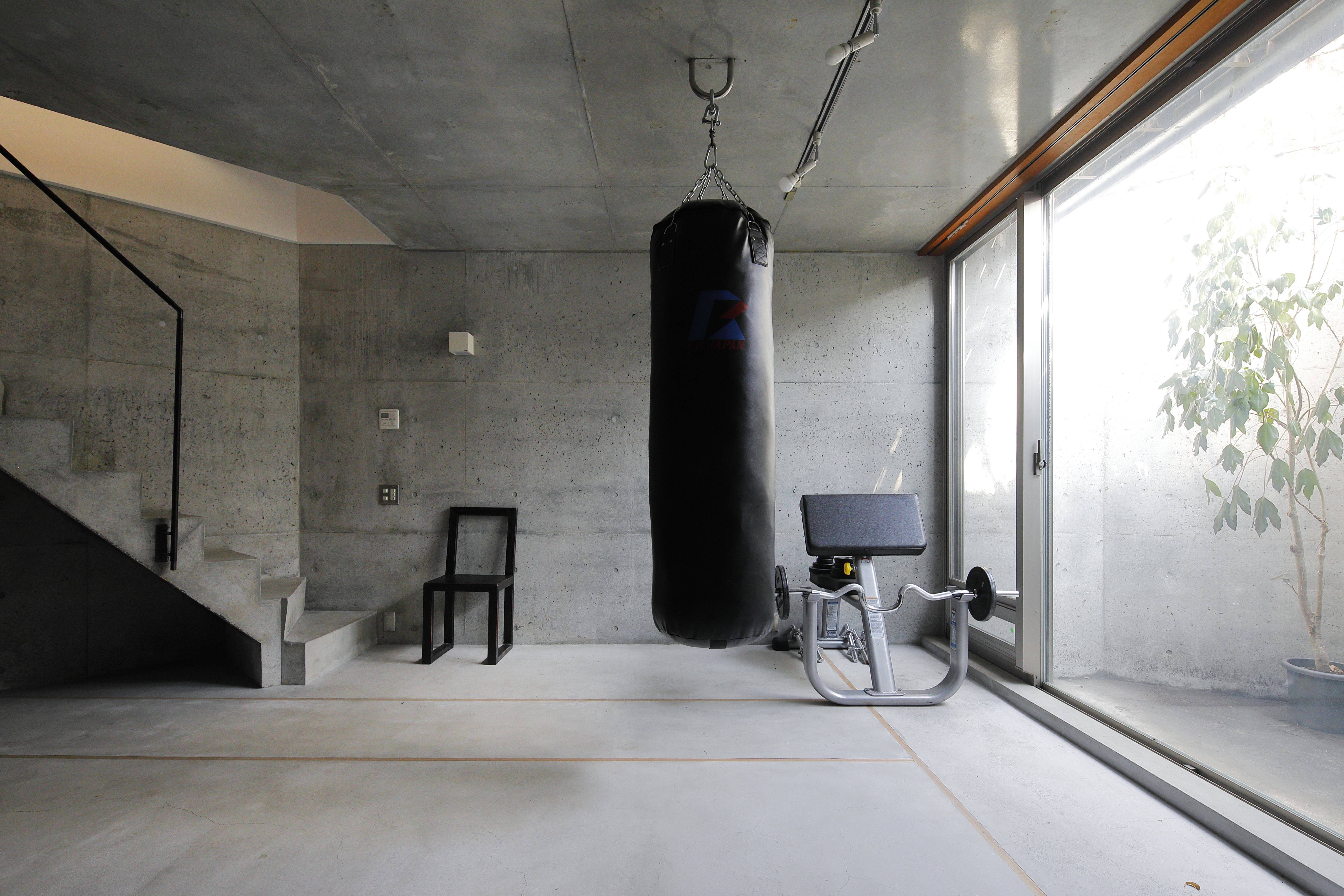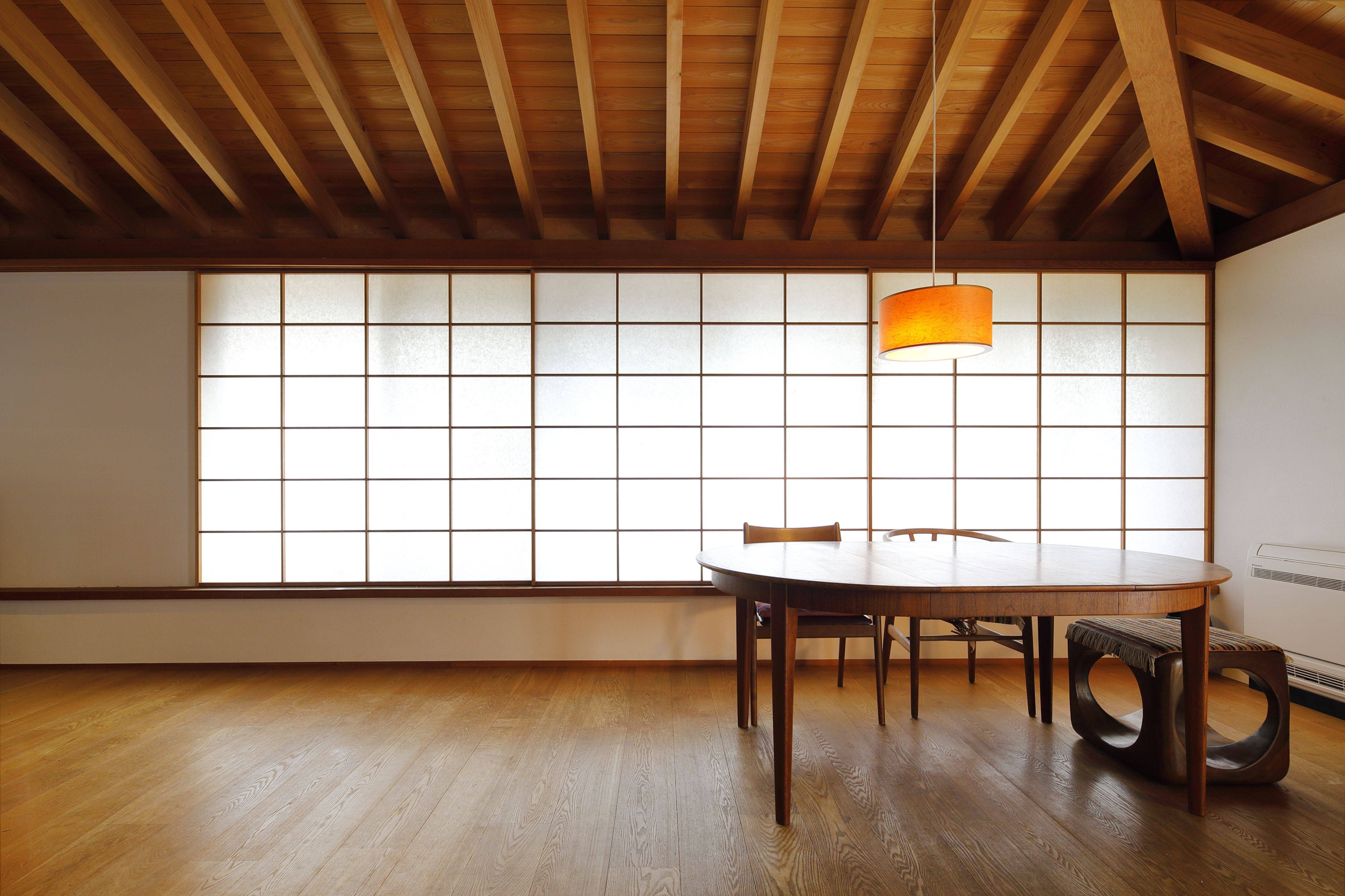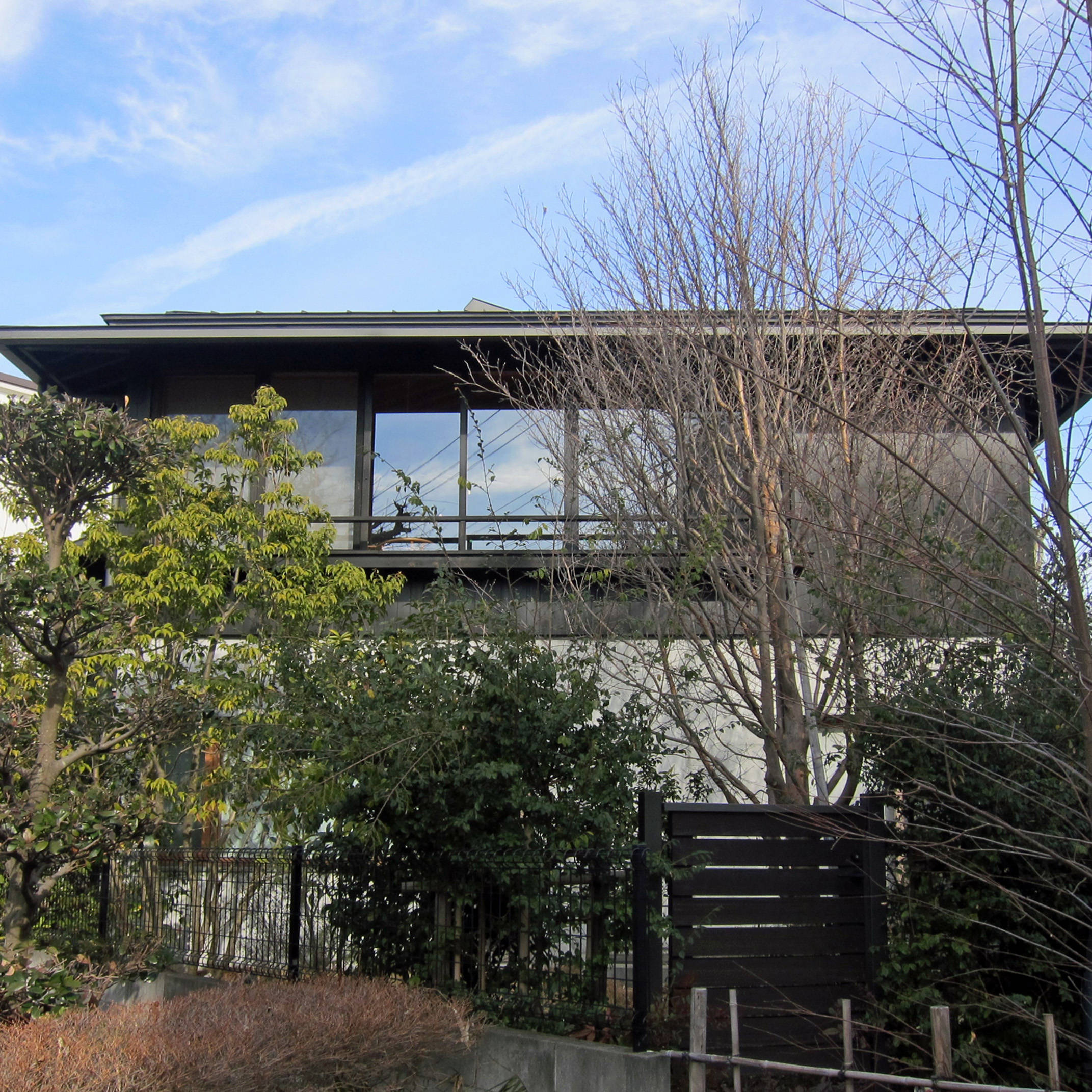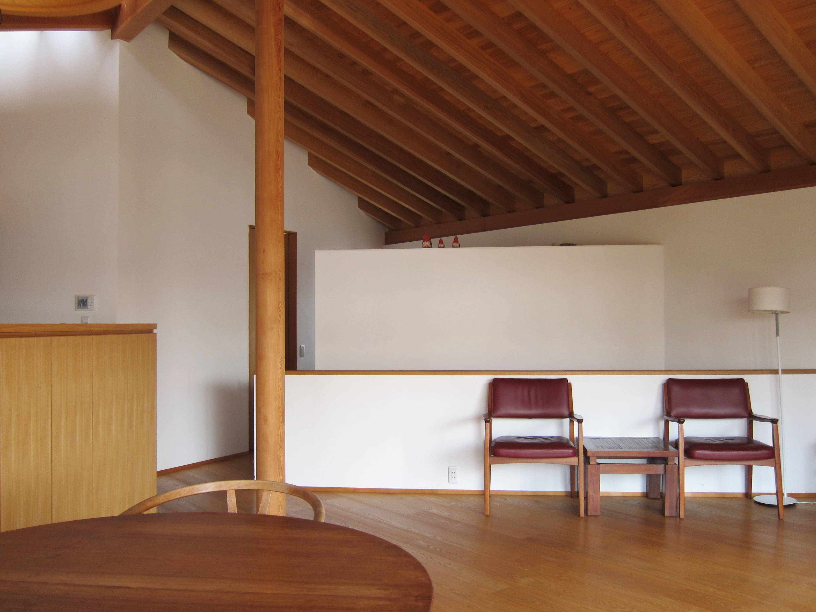 三方が開けた住宅地の一角に位置することから、街並みに馴染むように軒の高さをできるだけ低く抑えています。一方で室内は、丸柱に持ち上げられた棟が空間の広がりを生んでいます。1階は鉄筋コンクリート造とし、外部は打ち放し仕上げ、2階は木造で外部は杉板張りです。
