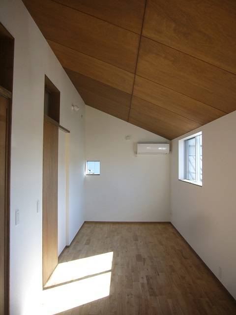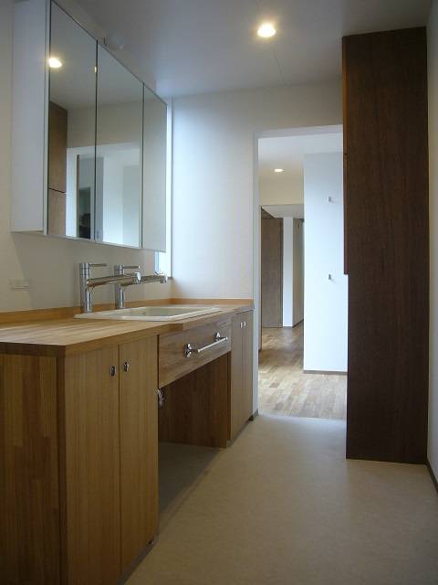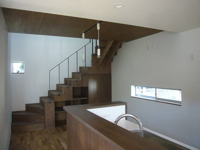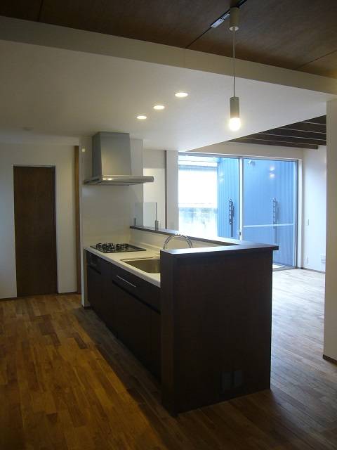 閑静な住宅地に建つご夫婦とお子さん二人のための木造二階建て住宅です。 旗竿地でしかも建ぺい率が40%、容積率が80%という厳しい条件において、東南に中庭を設けてそれを囲むように片流れ屋根の平屋建てと切妻屋根の二階建てを組み合わせたL字型のコートハウスとし、採光と風通しを確保しつつセキュリティを考慮して道路から玄関ドアが見えないようにあえて玄関アプローチ正面には玄関ドアや窓を設けませんでした。