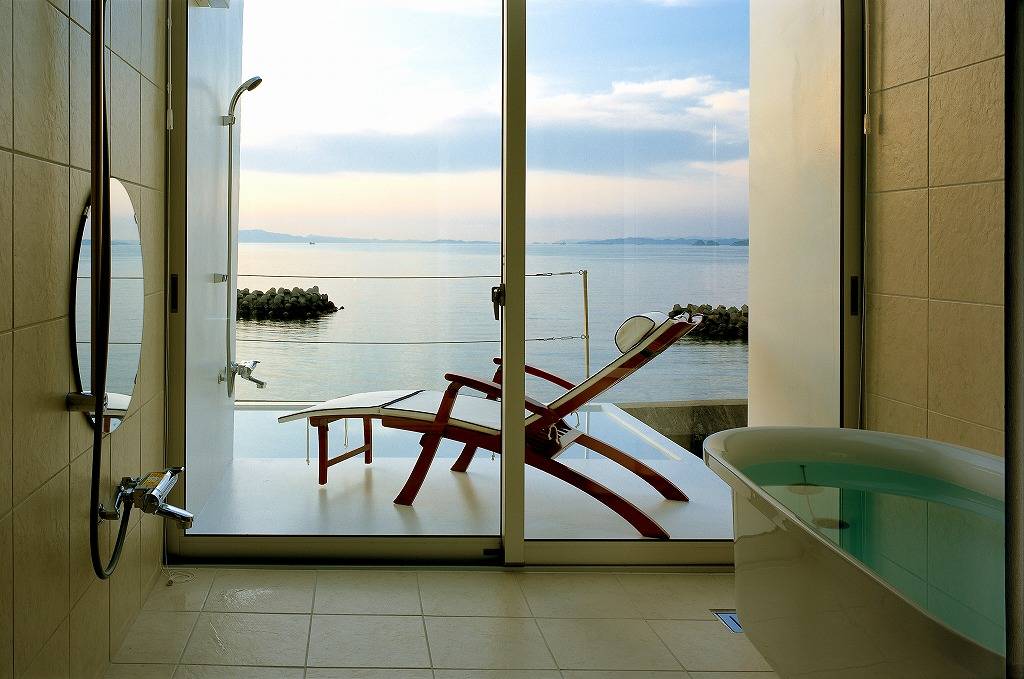 浴室も海に向かってガラス張りオープンですが、お二人とも躊躇されることなく長時間入浴を楽しんでいられるとのことです。