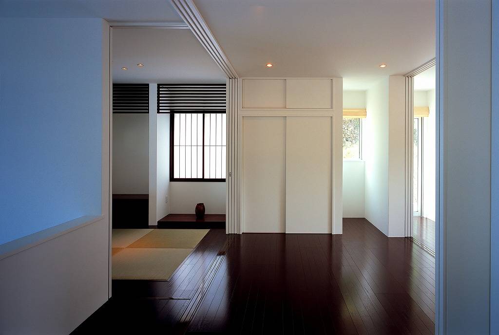 上階の部屋割りは、寝室、来客用の個室2室、それと仏間です。常時はご夫婦二人で生活されるため、建具を引き込んだ広いワンルームの状態での生活を提案しました。
