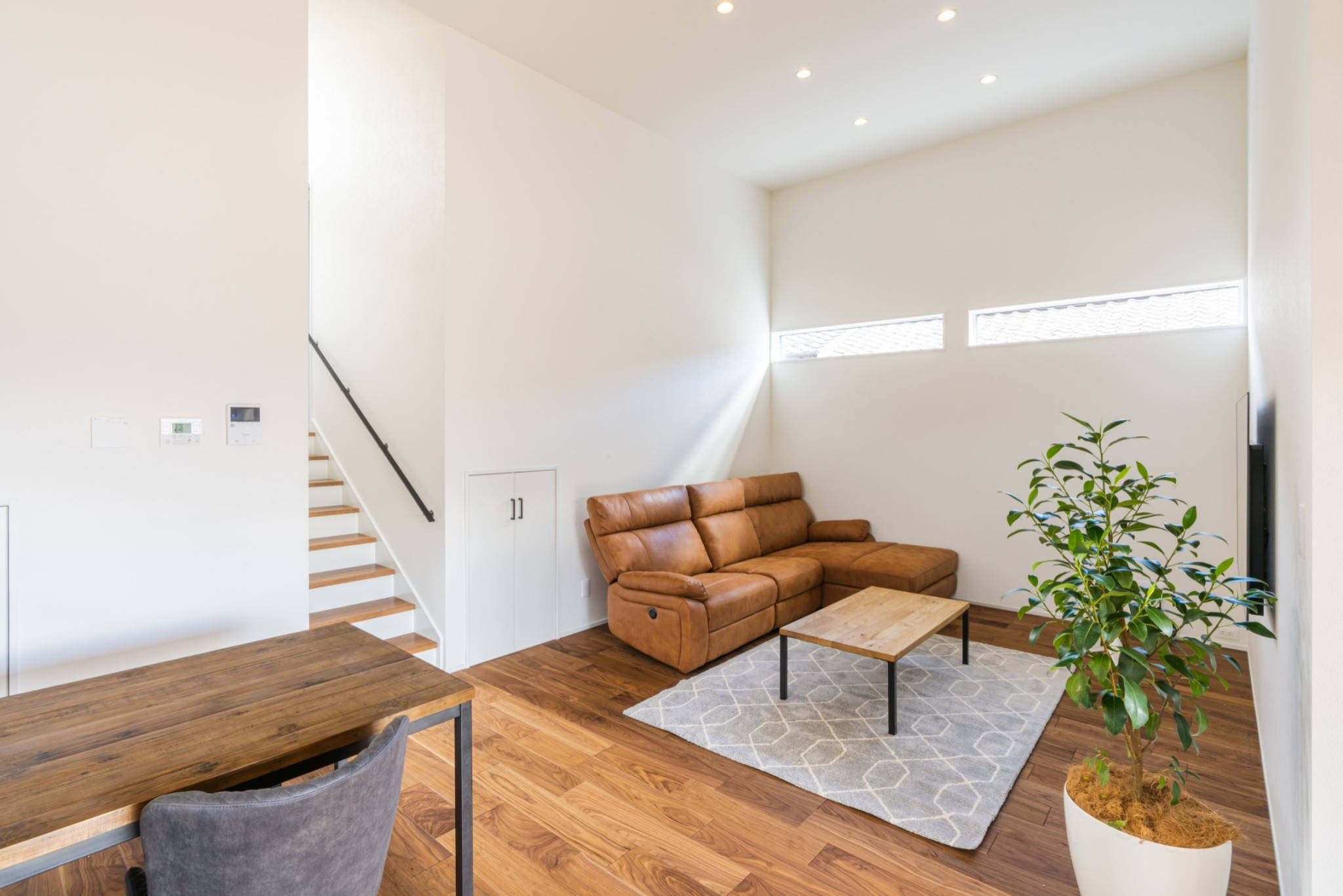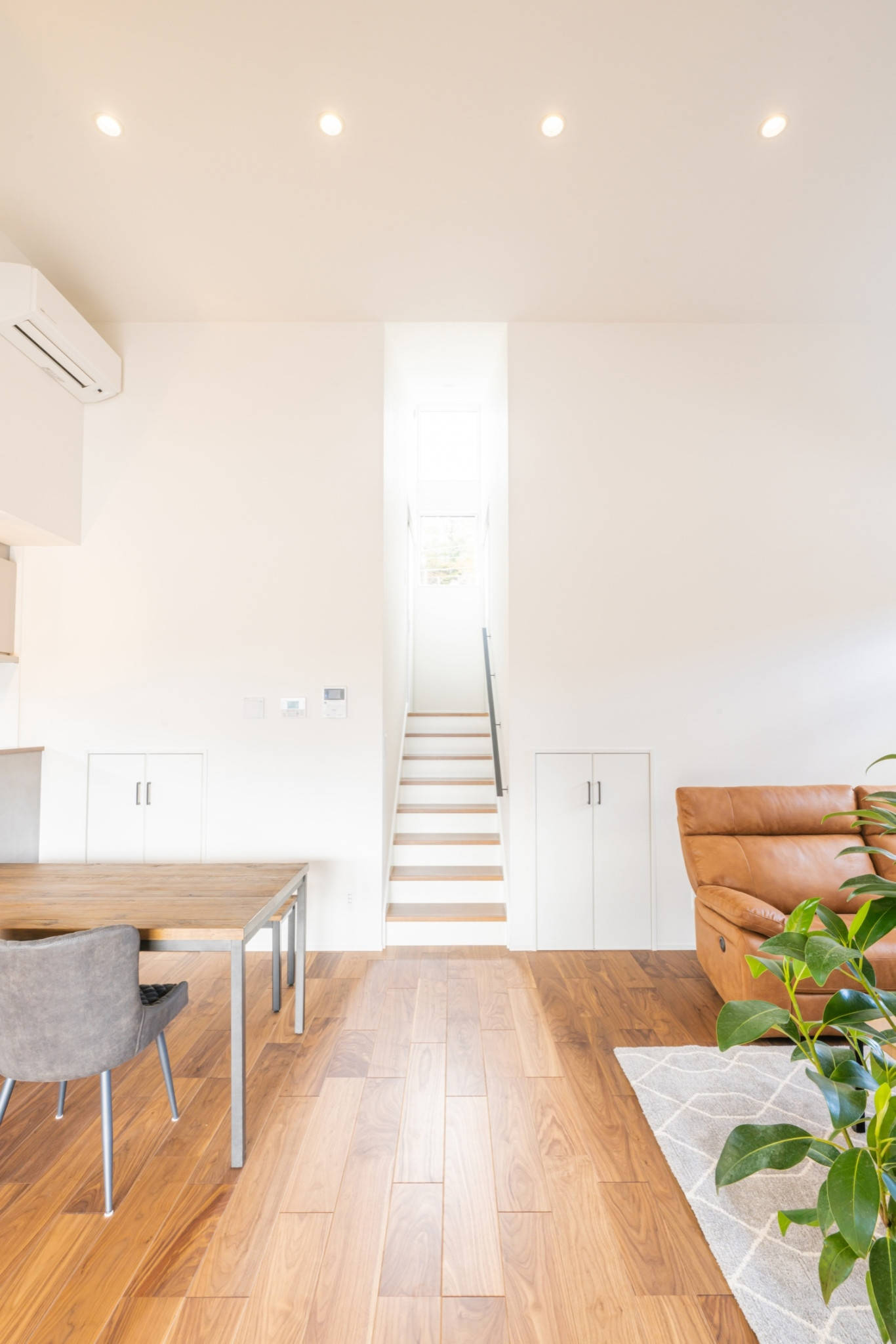 片流れなので水上側はかなりの高さが確保できる為その高さを有効利用した蔵収納や小屋裏を計画し、大容量の収納を確保し面積効率のいい空間としています。