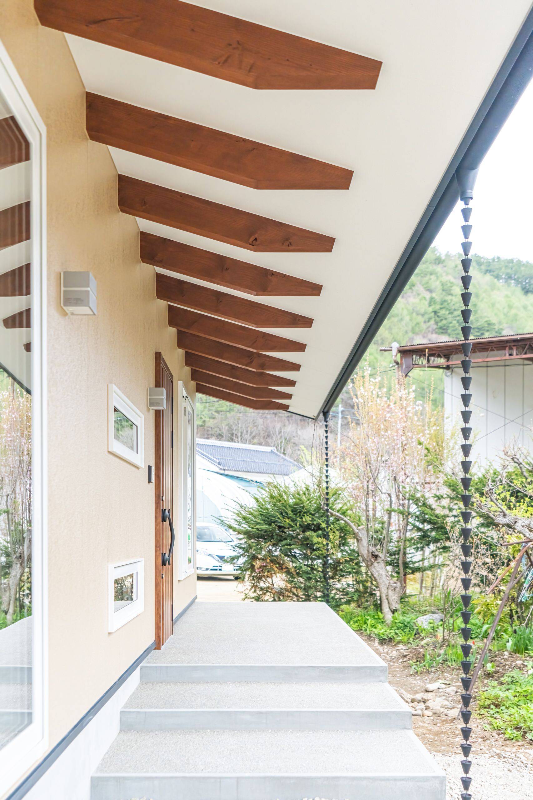 また、軒の出を1800確保する為に構造的に入れた登り梁を意匠としても活かしてアクセントとしました。