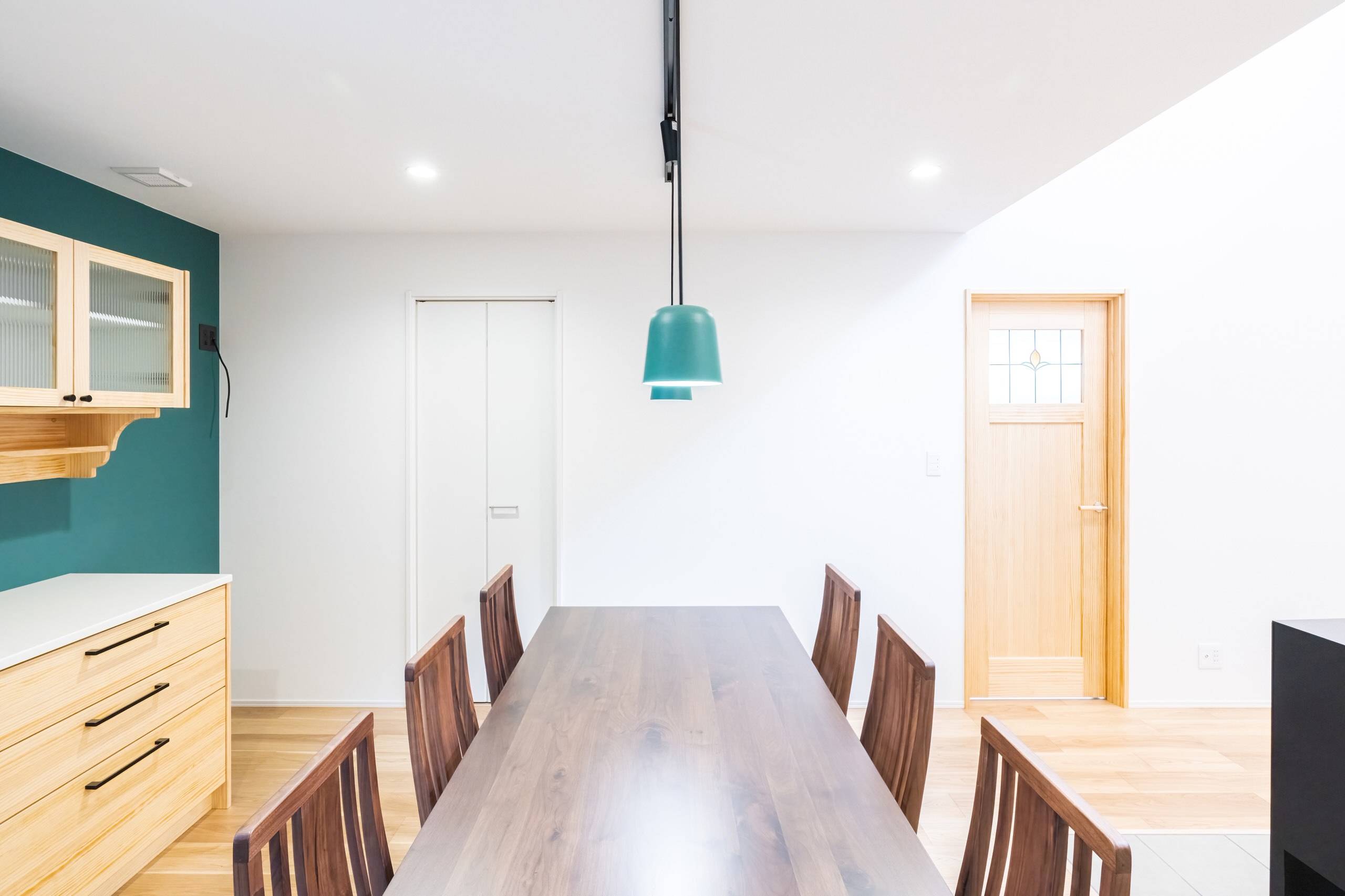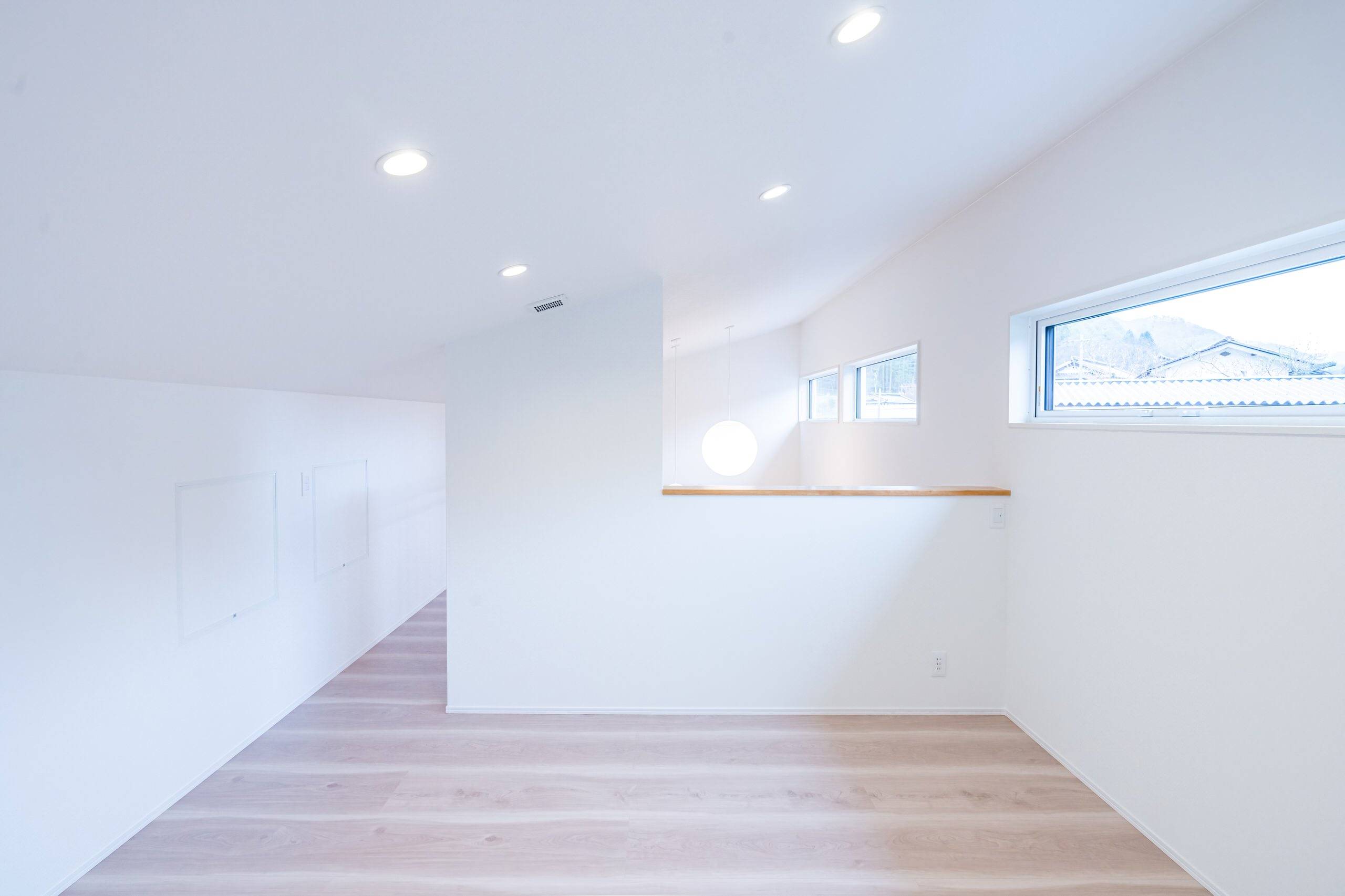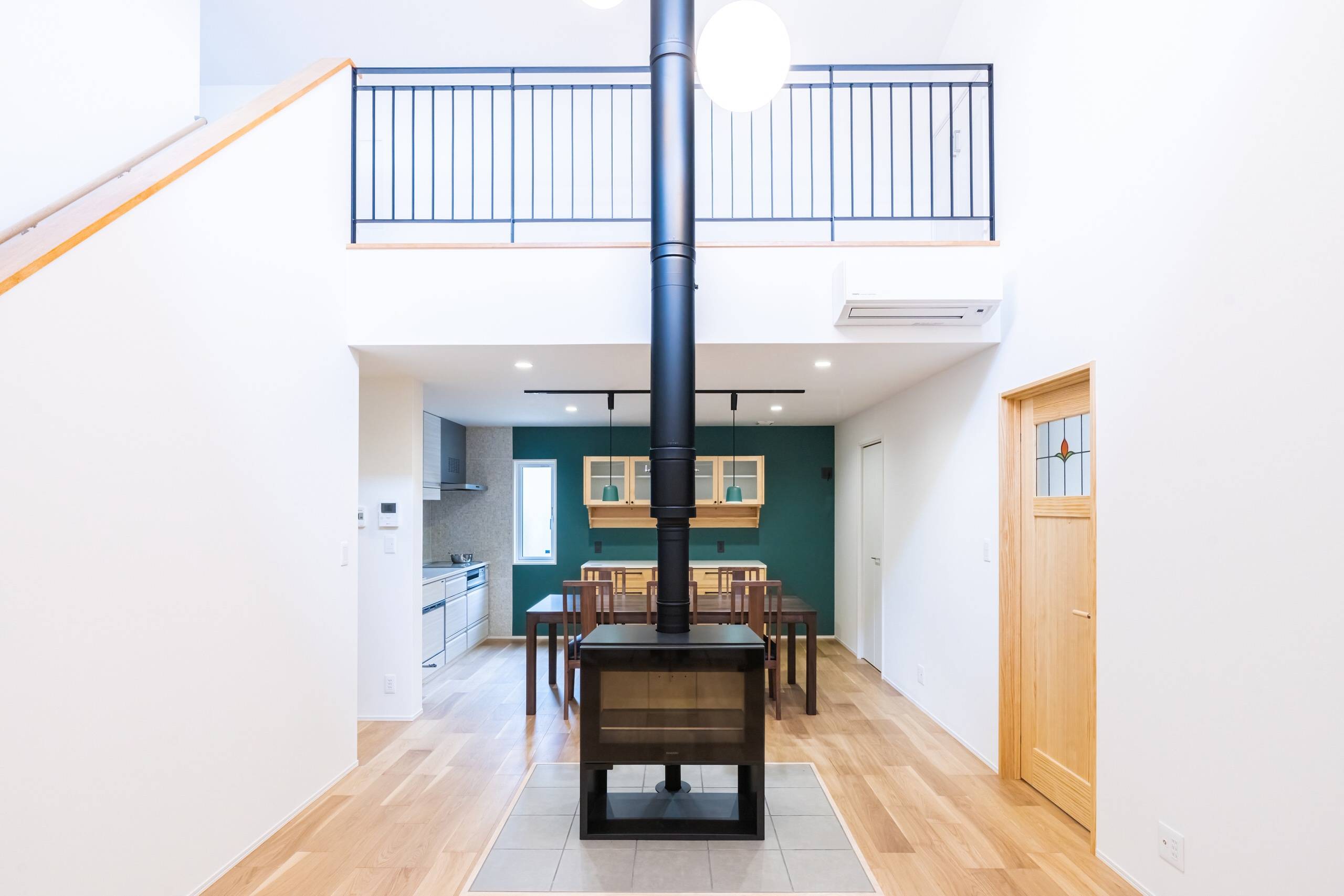 立地的に日中の日当たりがのぞめず、日中も薄暗くなりがちであったので、リビングに吹抜けを設け、ハイサイドライトをとることで、日中の太陽光を北側のキッチンやダイニングまで届ける事を目指しました。