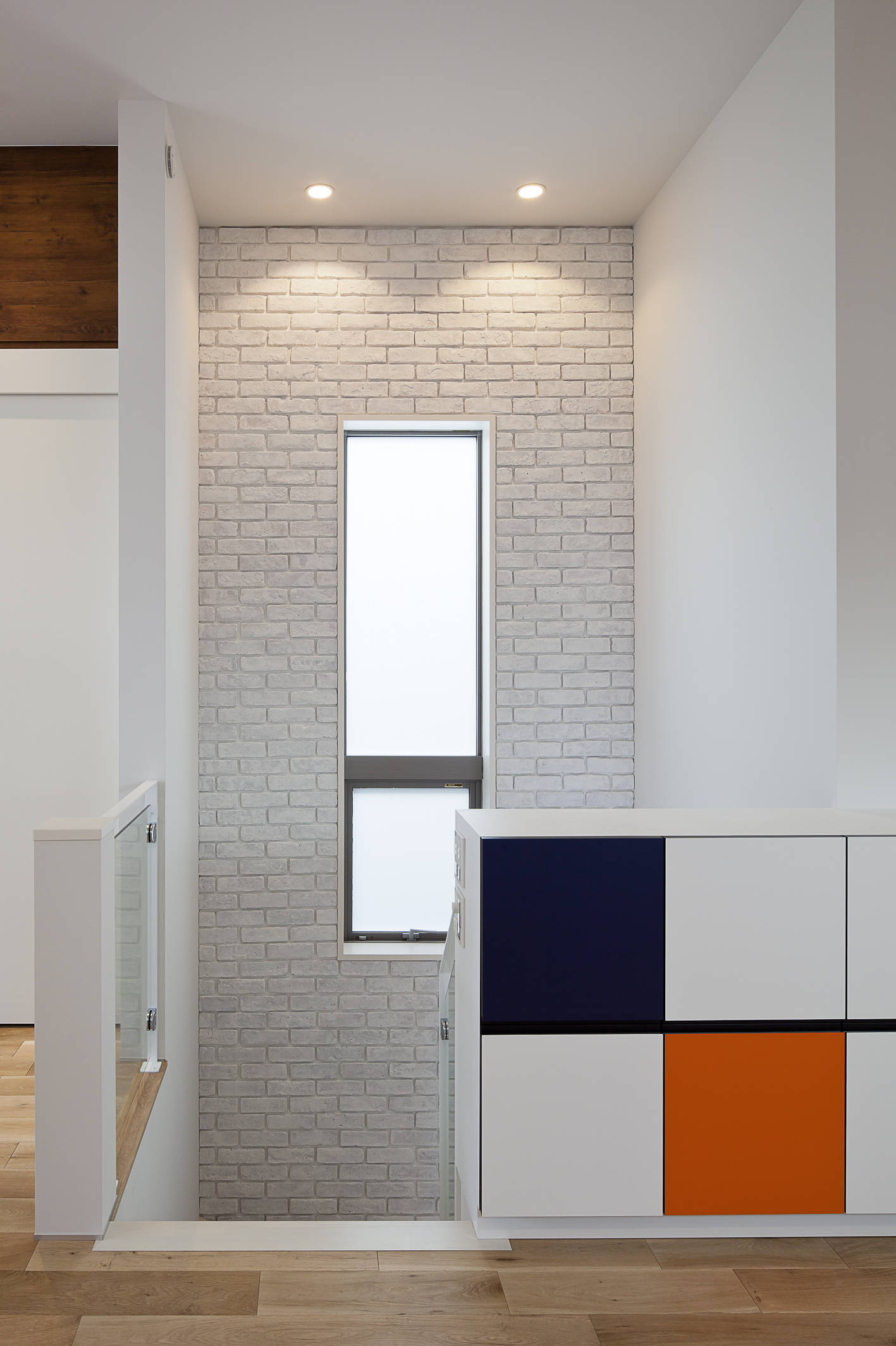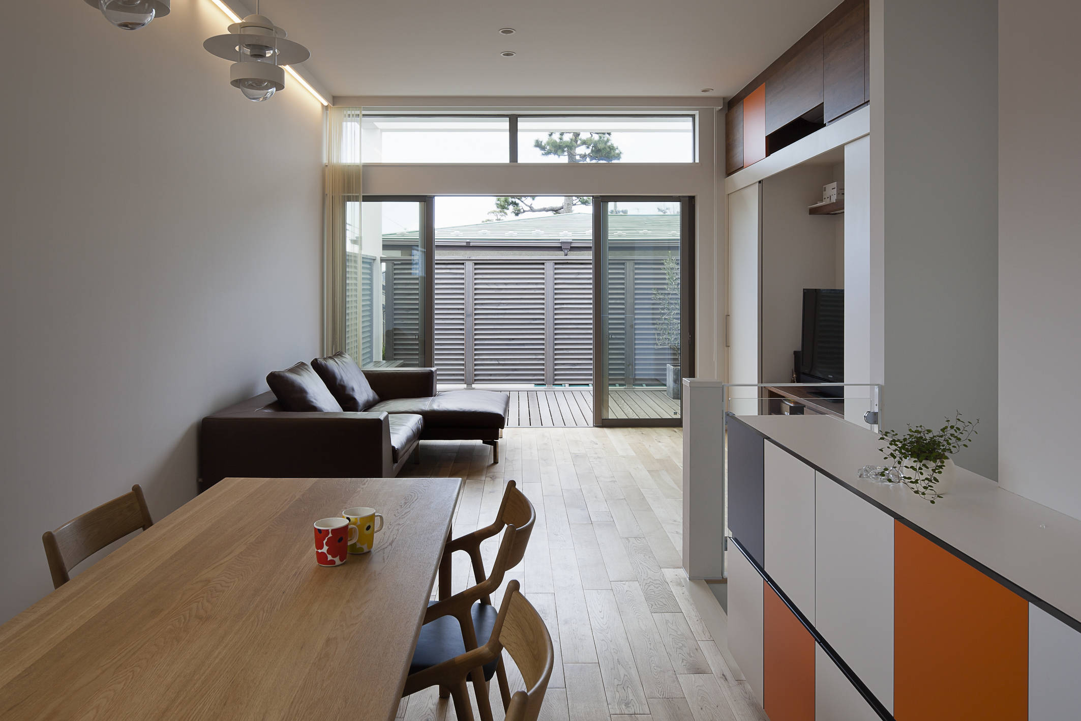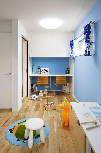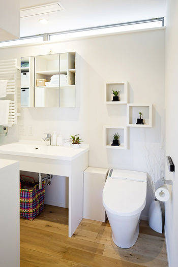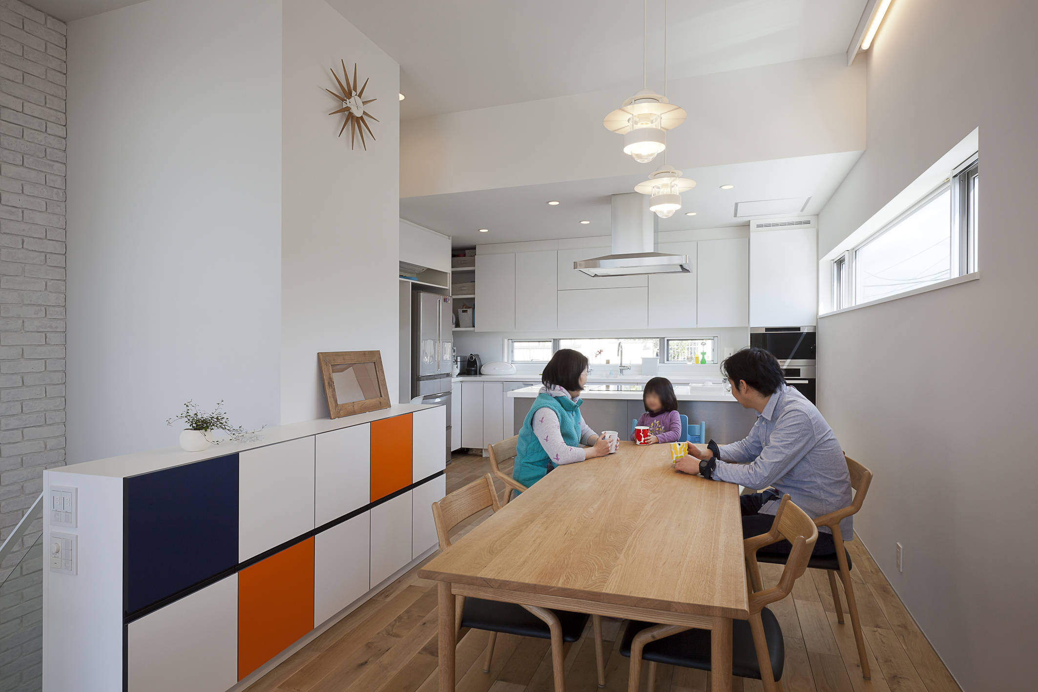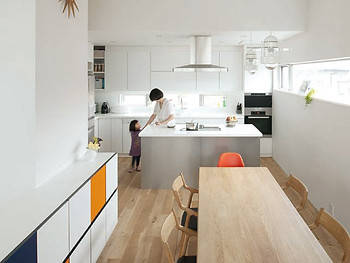 忙しいご夫婦とお子さんのための住宅です。敷地は海にほど近い丘の上の住宅地のためプライバシー確保が慎重に検討されました。一方で休日に仲間が集い楽しめるスペースを希望されましたので大きなバルコニーを設定しています。ここにミッドセンチュリーテイストによるホワイトキューブをつくりました。1階はプレイベートな寝室・子供室と水回りをまとめ、造付け収納や階段下スペースの有効利用など工夫をしています。また、2階は広々としたワンルームのリビング・ダイニング・キッチンと大きなバルコニー。アイランド型キッチンは、調理中の家族とのコミュニケーションを可能にします。