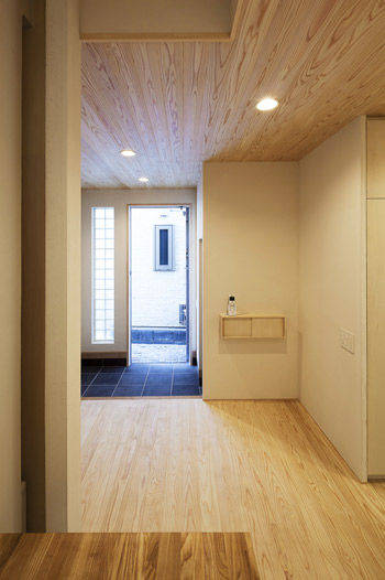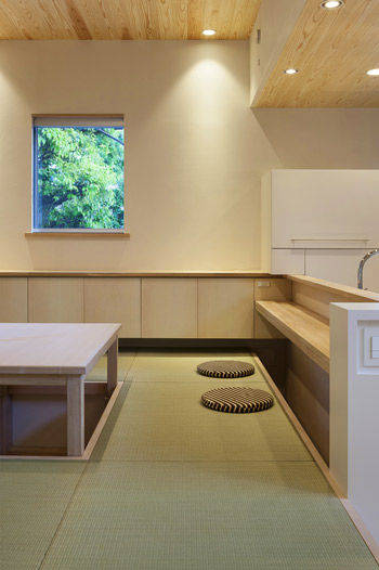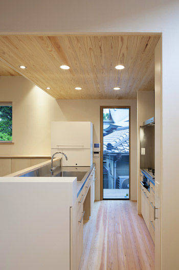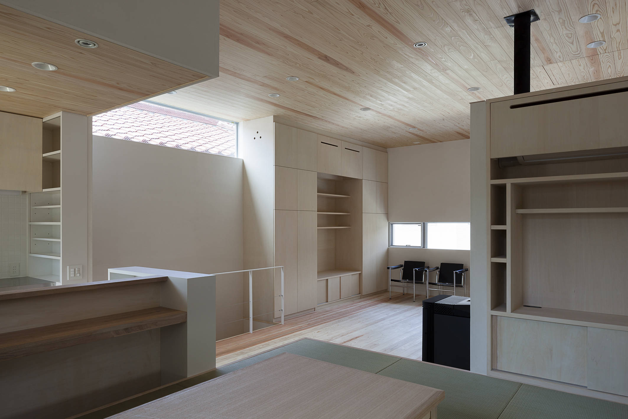 仲間や親族が多く暮らすエリアでの土地探しからご一緒したプロジェクトです。この辺りは、軟弱な地盤の上に、支持地盤が深いため、構造的な工夫が必要でした。 日中の多くの時間を過ごす家人のために2階にキッチンを設え、そこにダイングとリビングが続きます。家族は個室にこもるのではなく2階に集います。その仕掛けとしてペレットストーブを導入しました。シンプルでコンパクトですが、そこには思い思いの居場所があります。ダイニングからはバッチリ東京スカイツリーが拝めます。