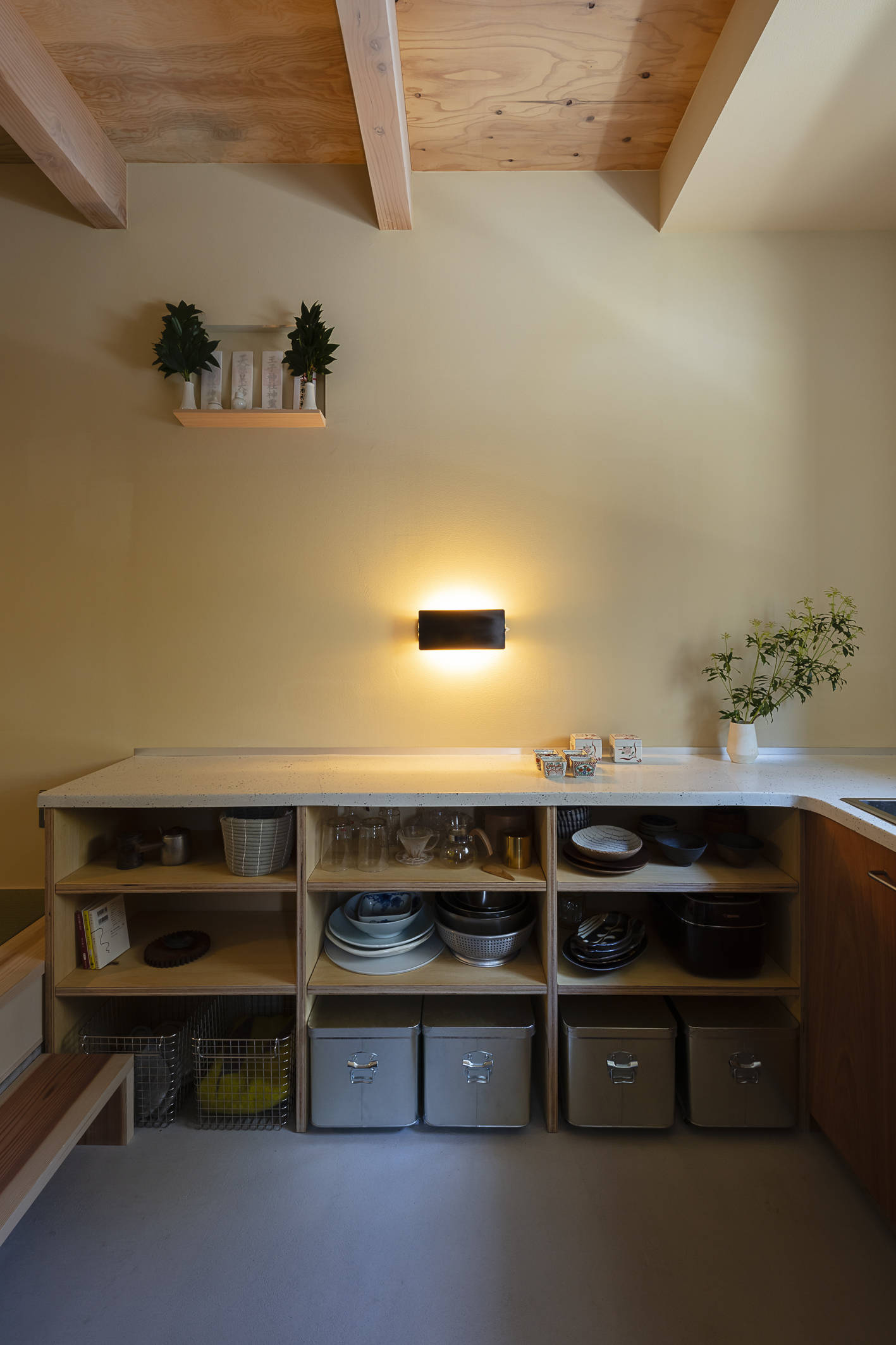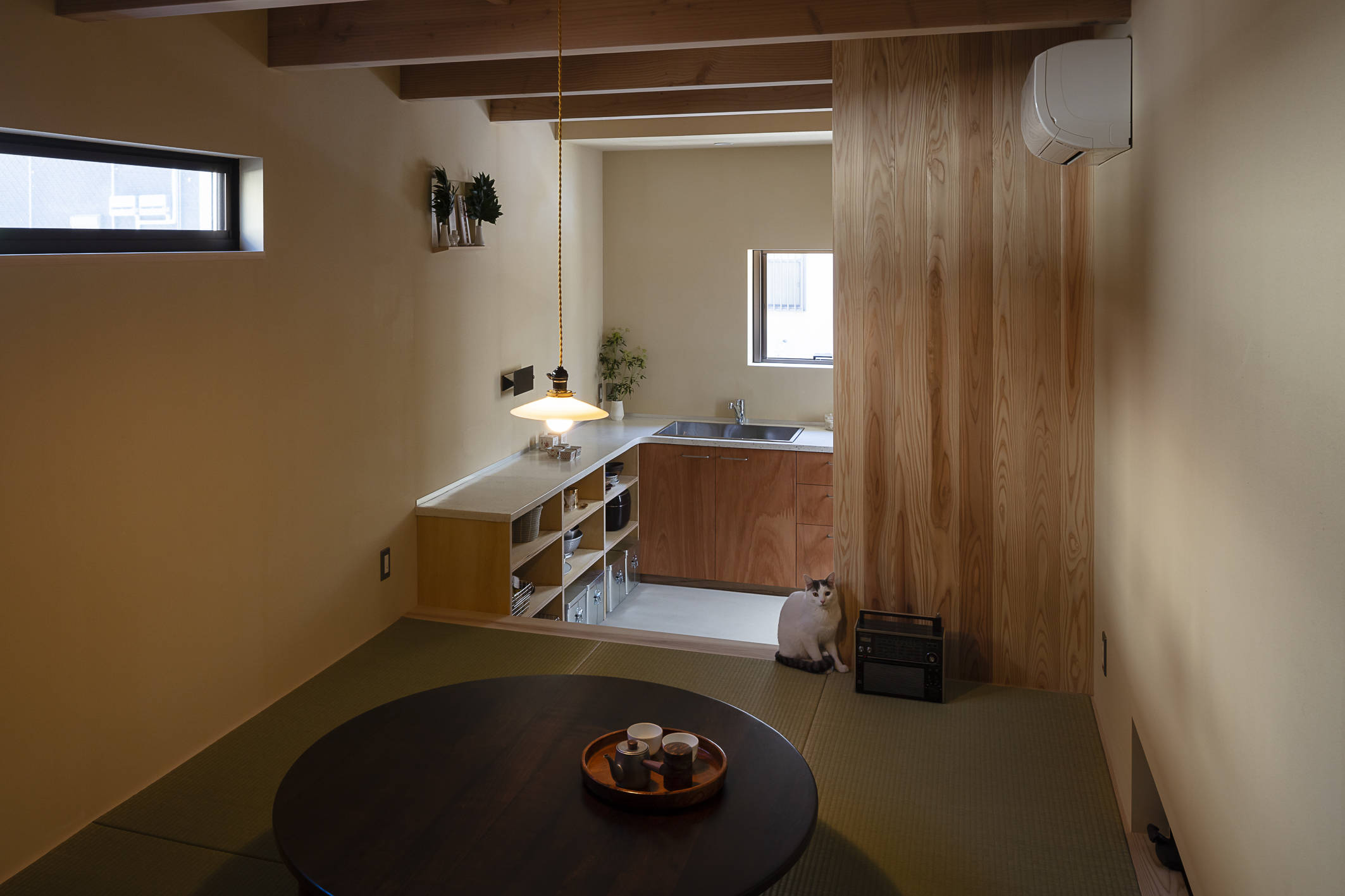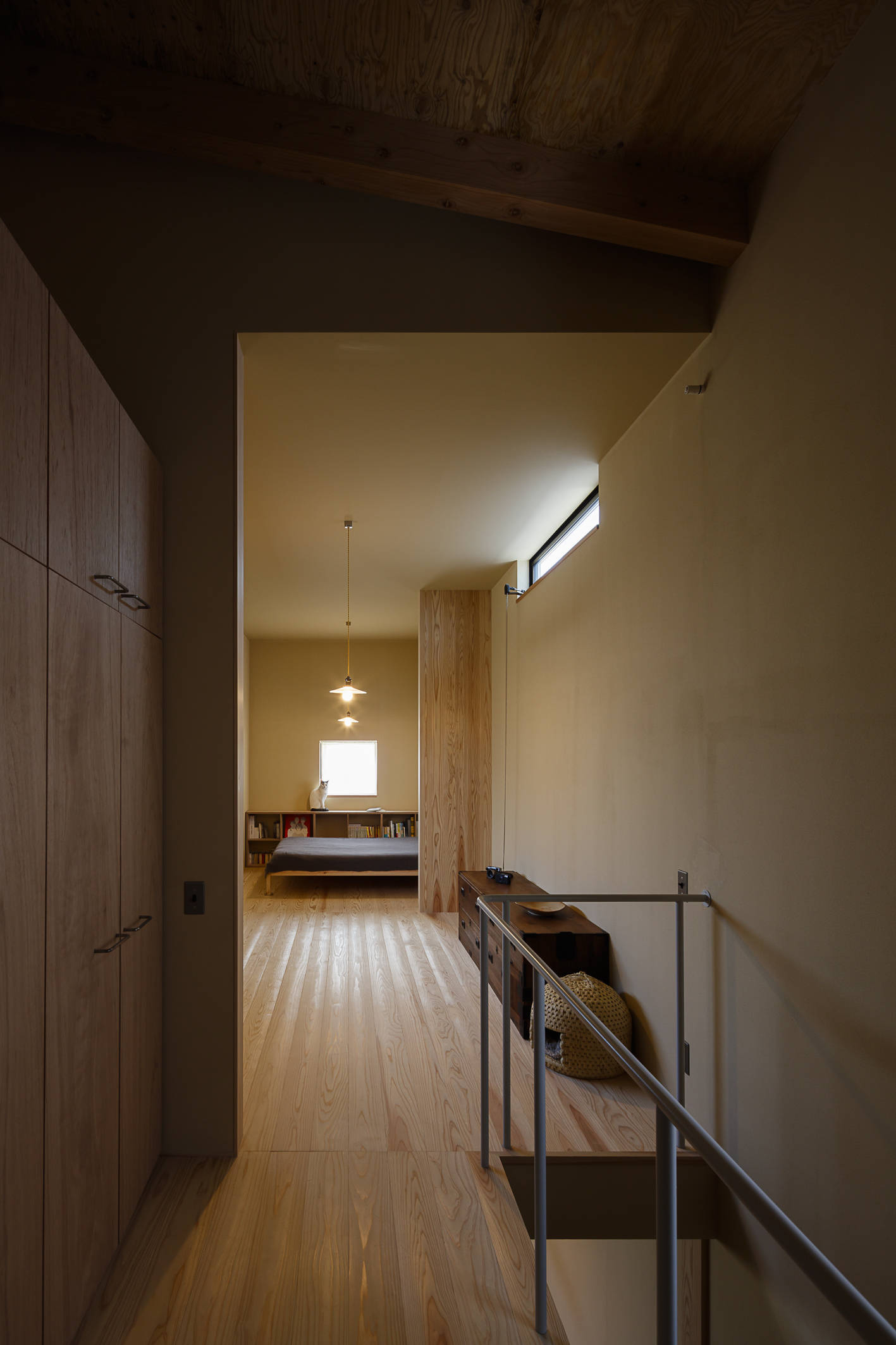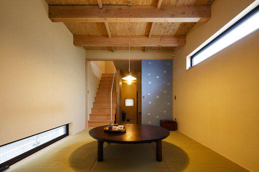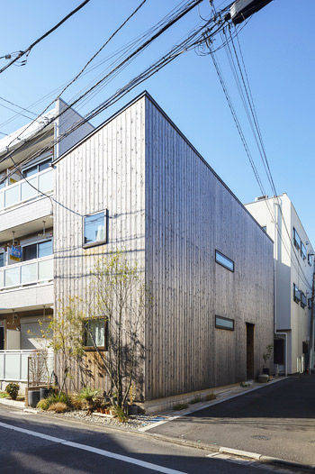 外壁に荒磨きの焼杉を張り巡らせた2.73m×11.22mの細長い箱状の住宅です。 妻の実家近くの良好な住環境の中に土地を見つけ、狭いながらもそこに住む覚悟をもって設計の依頼をされました。 建主は大手メーカーのプロダクトデザイナー。要望のイメージ(立原道造のヒヤシンスハウスや茨木のり子の家)とはっきりとした好み(モダンデザインと素材感など)がありました。 敷地は細長く、建物の間口は一間半しか取れず、そこに廊下をとると人が寝られる居室が取れません。その状況でいかに個と家族の居場所をつくるかを検討しました。また、空間やプライバシーなどに大小、高低、明暗など多様なシーンを与え、筒状の空間が単調にならないことを心がけています。 耐力壁の配置を左右に振り分け、緩やかに各階の空間を三等分し、中央のスペースを1階は居間、2階は板の間とし、落ち着いた留まれるスペースとしました。そこから見えるスペースでは袖壁に隠れた位置に開口を配置し、光の入り具合を調整し、性格の違うスペースを目論んでいます。