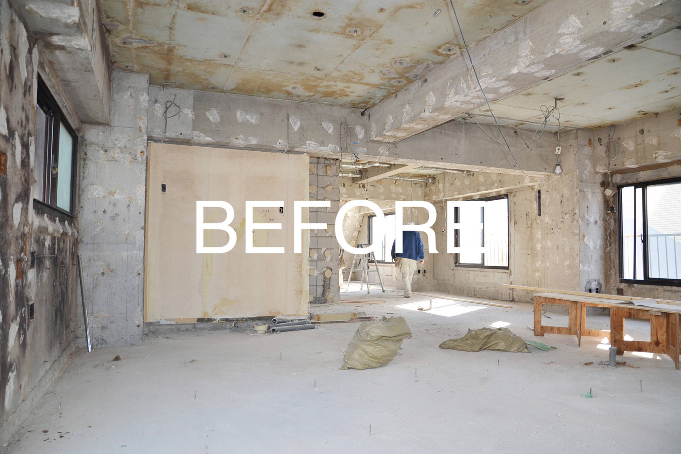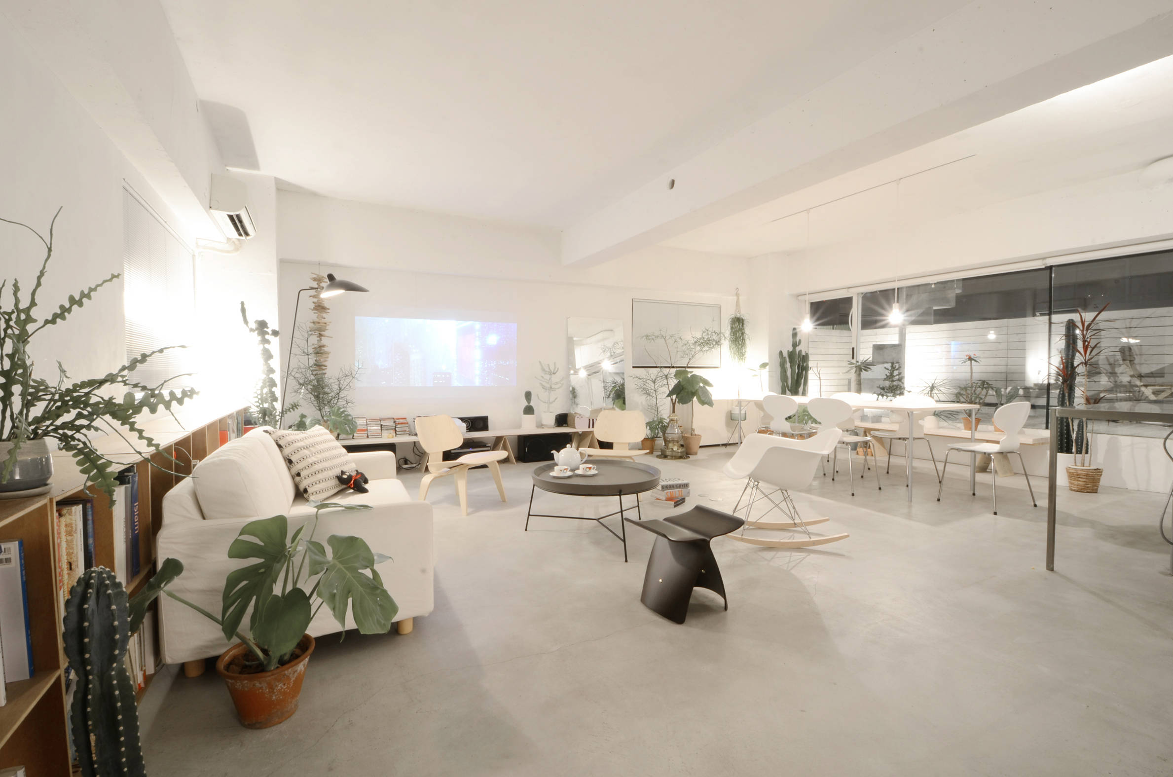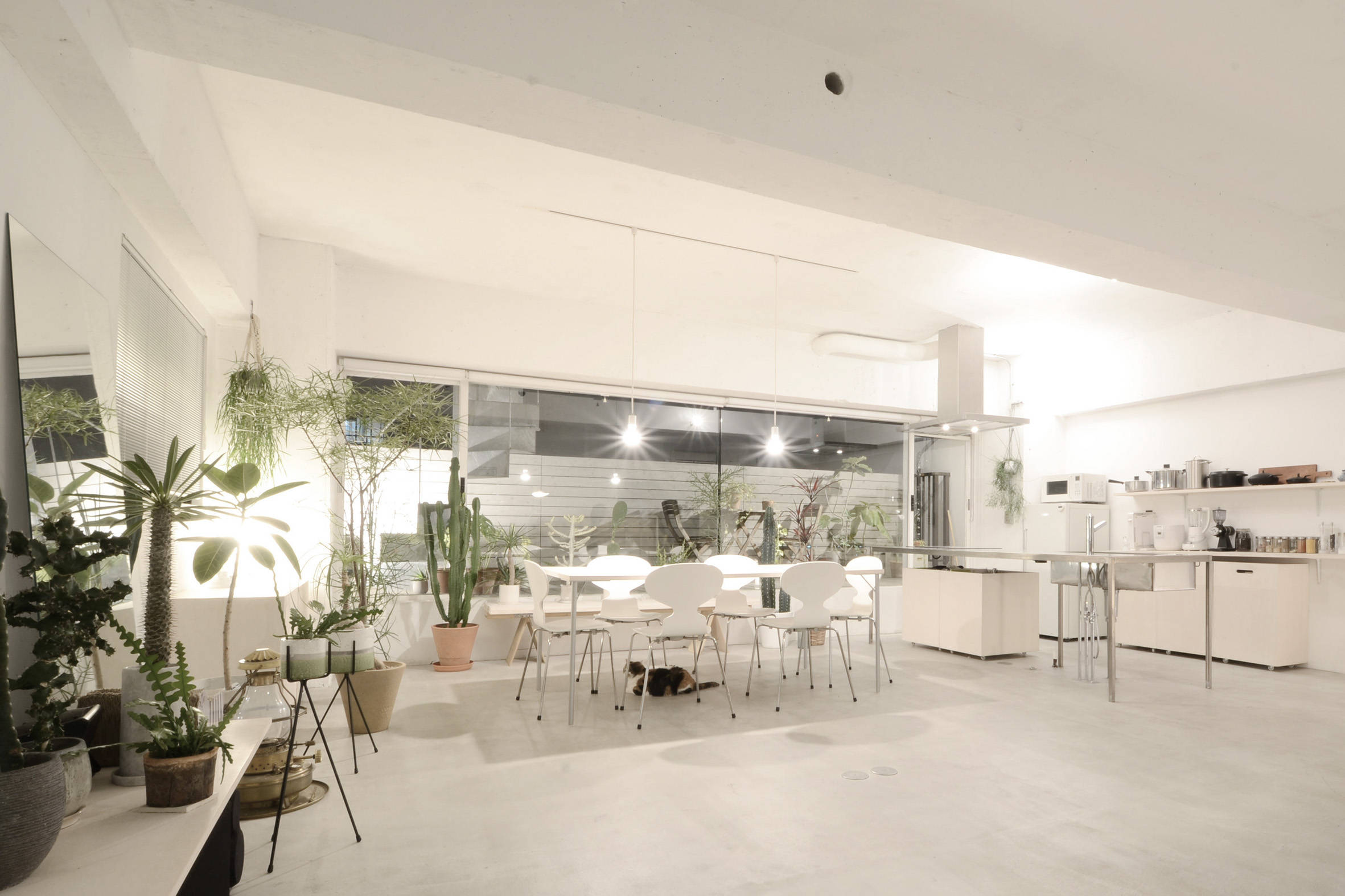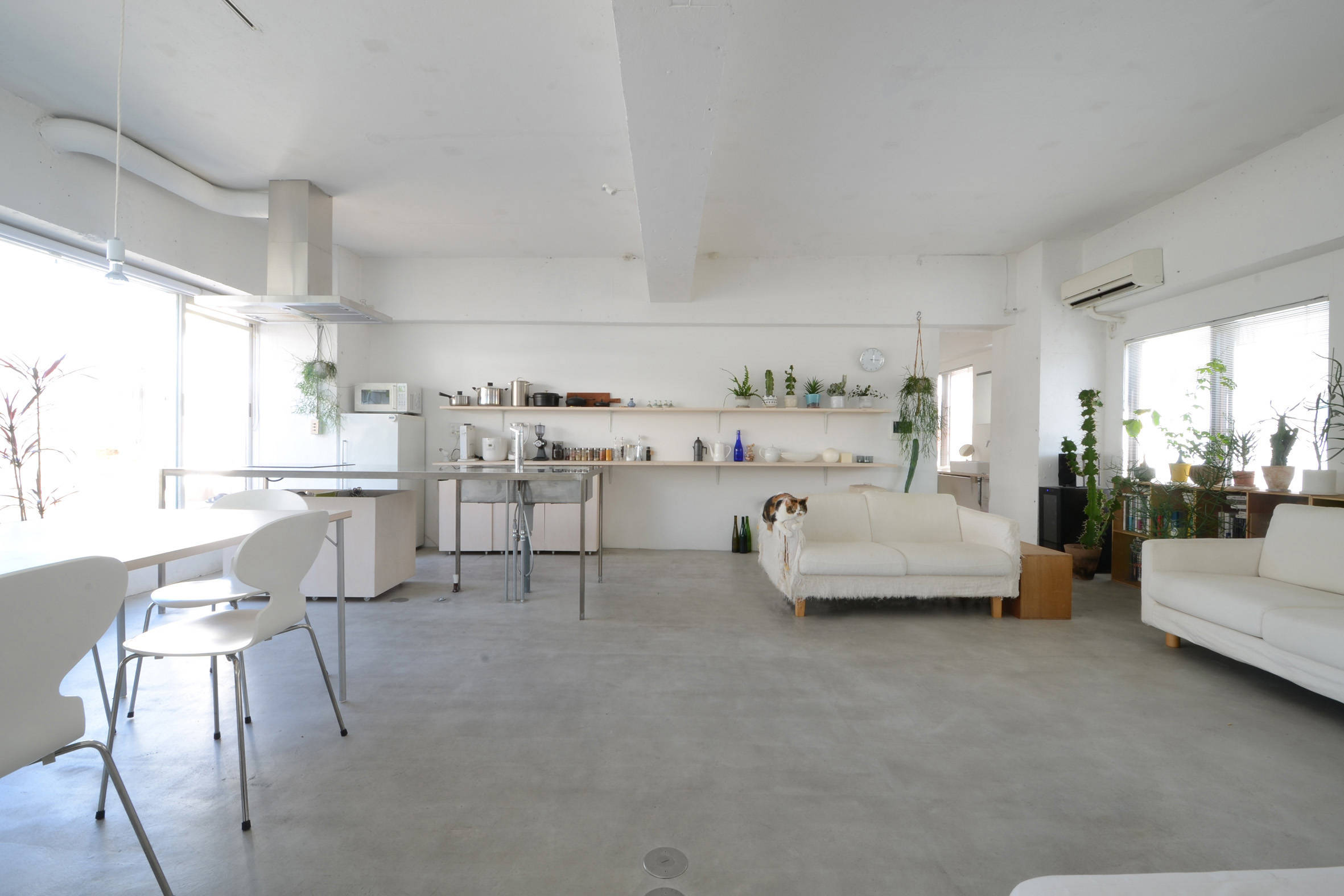 築30年のマンションリフォームです。間仕切を極力減らして天井を取り去ることで大きな空間の広がりを確保し、設備類を注意深く更新することで明るく軽やかな空間へと生まれ変わりました。構造上不要な外壁を一部撤去してテラス開口部を拡大する事で、マンションでありながら外部に開いた明るいLDKを確保しています。洗面所を兼ねた日当たりのいい廊下は温室となって多くの観葉植物を育て、家全体に潤いをもたらしています。