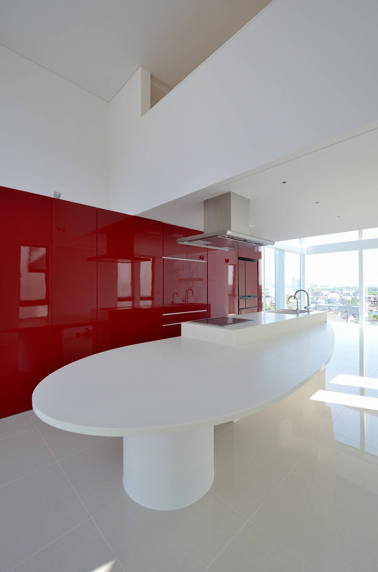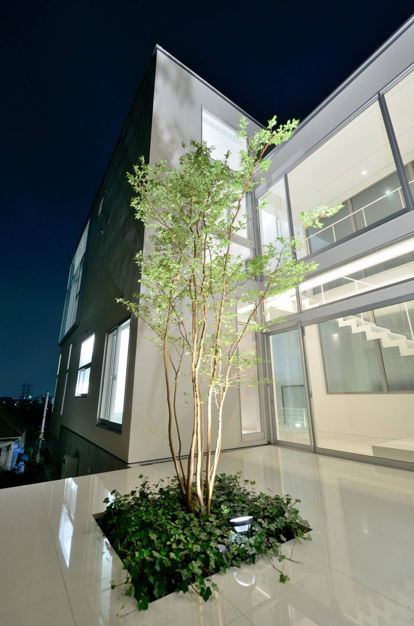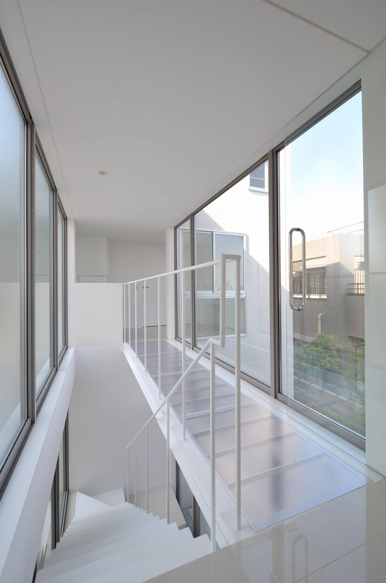 『都心の別荘建築』をクライントとの共通イメージとしています。なんといっても多摩川から横浜まで広がる眺望を得る事が1番の目的です。その為に隣地建物の高さ等からリビングルームに必要な床高を設定しています。リビング・ダイニングから子供室には中庭脇に設けた屋内ブリッジでアクセスしますが、常に中庭を挟んで視覚的には一体化しています。