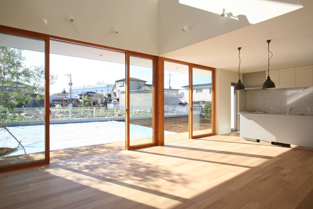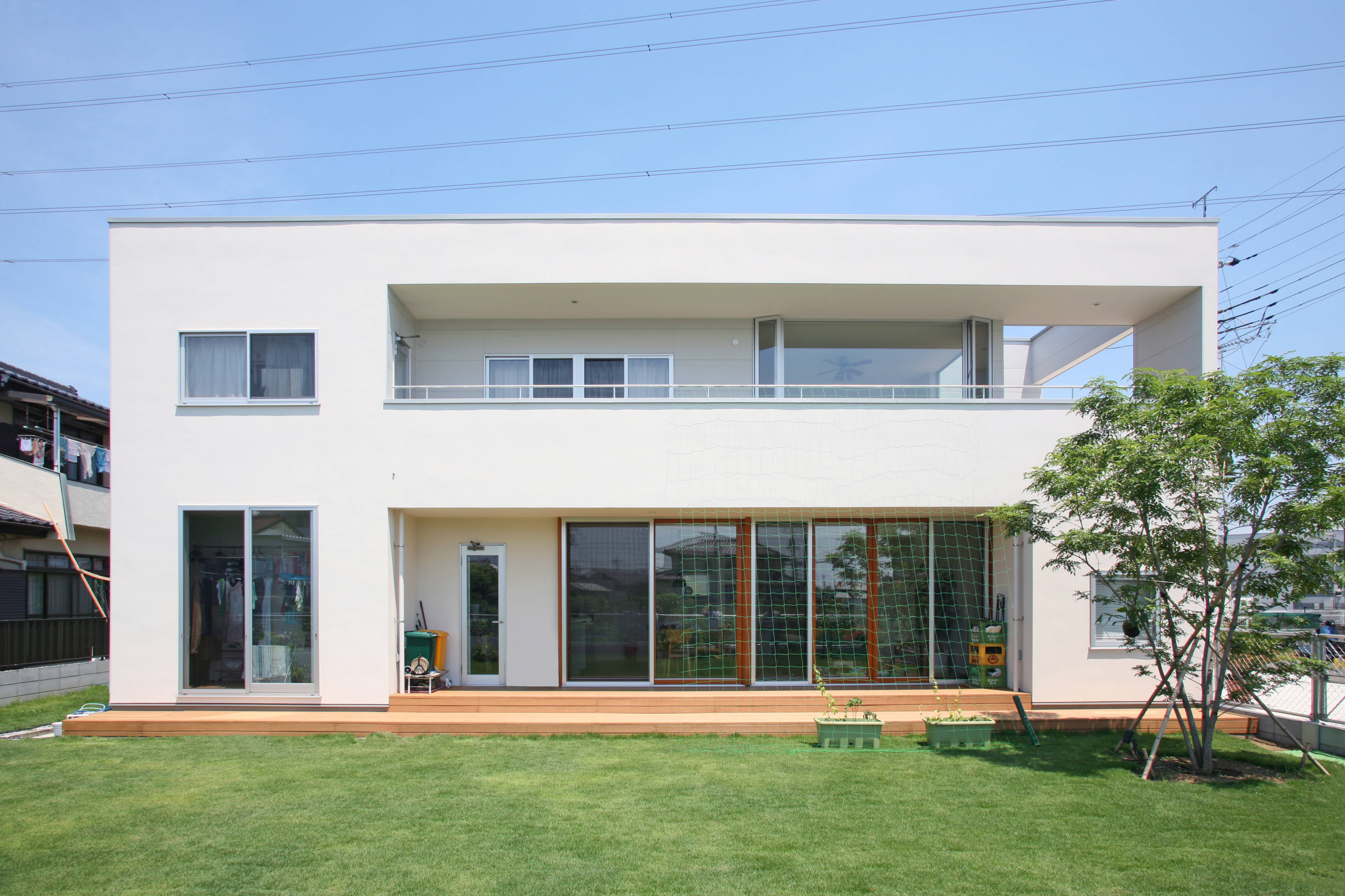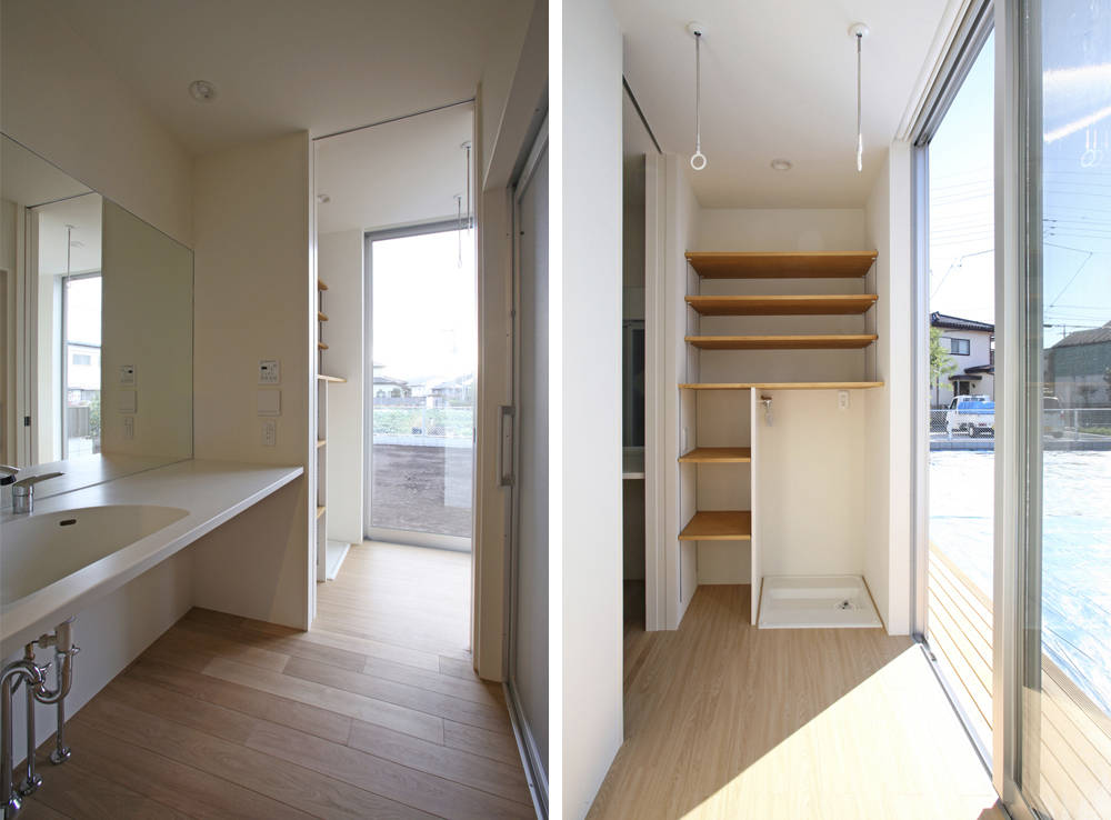 「シンプル、ナチュラル、家族の成長と変化」を家づくりのテーマとした、30代のご夫婦とお子様の住まい。南に広がる大きな庭との一体感を大切にしながら、人が集まり、家族とともに成長し変化していけるこの住まいでは、リビングの吹抜の周りをぐるっと回遊する「くるり」が、大きな特徴になっています。キッチンの近くに水廻りを配置し、洗濯→物干し→たたむ→仕舞うの一連の作業が効率よくできるように計画しています。