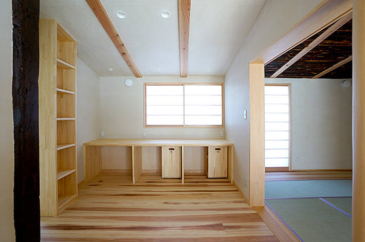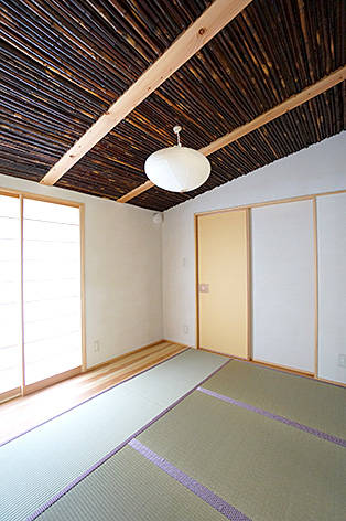 和室。天井に従前建物にあった煤竹を張った。