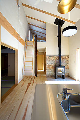 キッチンからダイニング方向を見る。従前建物の柱や飾り板を利用して。