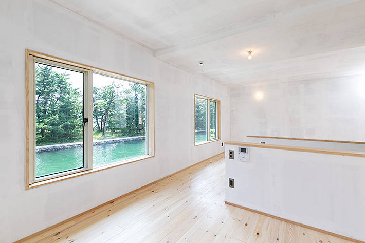 2階は階段を中心にぐるっと回遊できるワンルームに。運河と松林の風景を楽しむことができる。