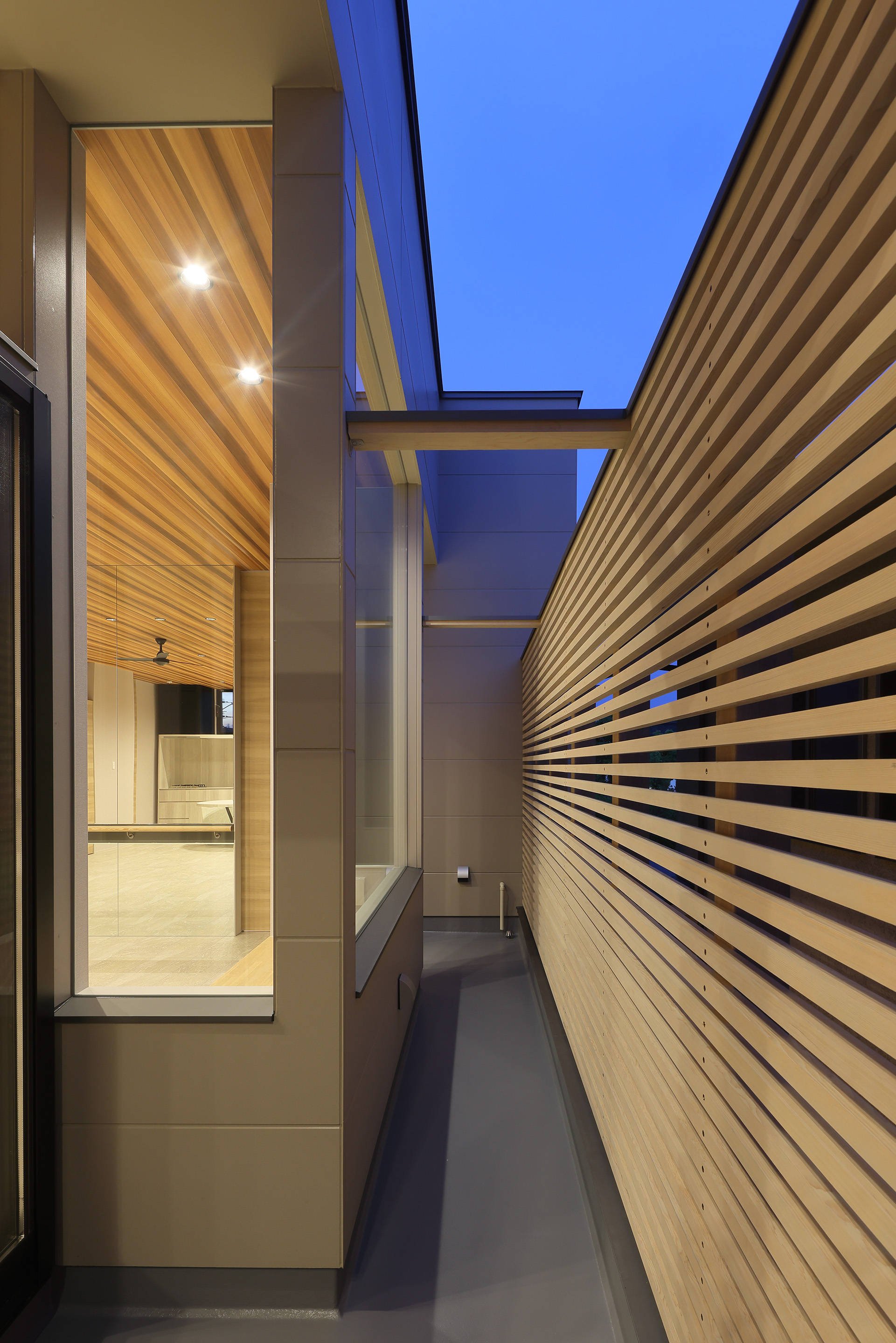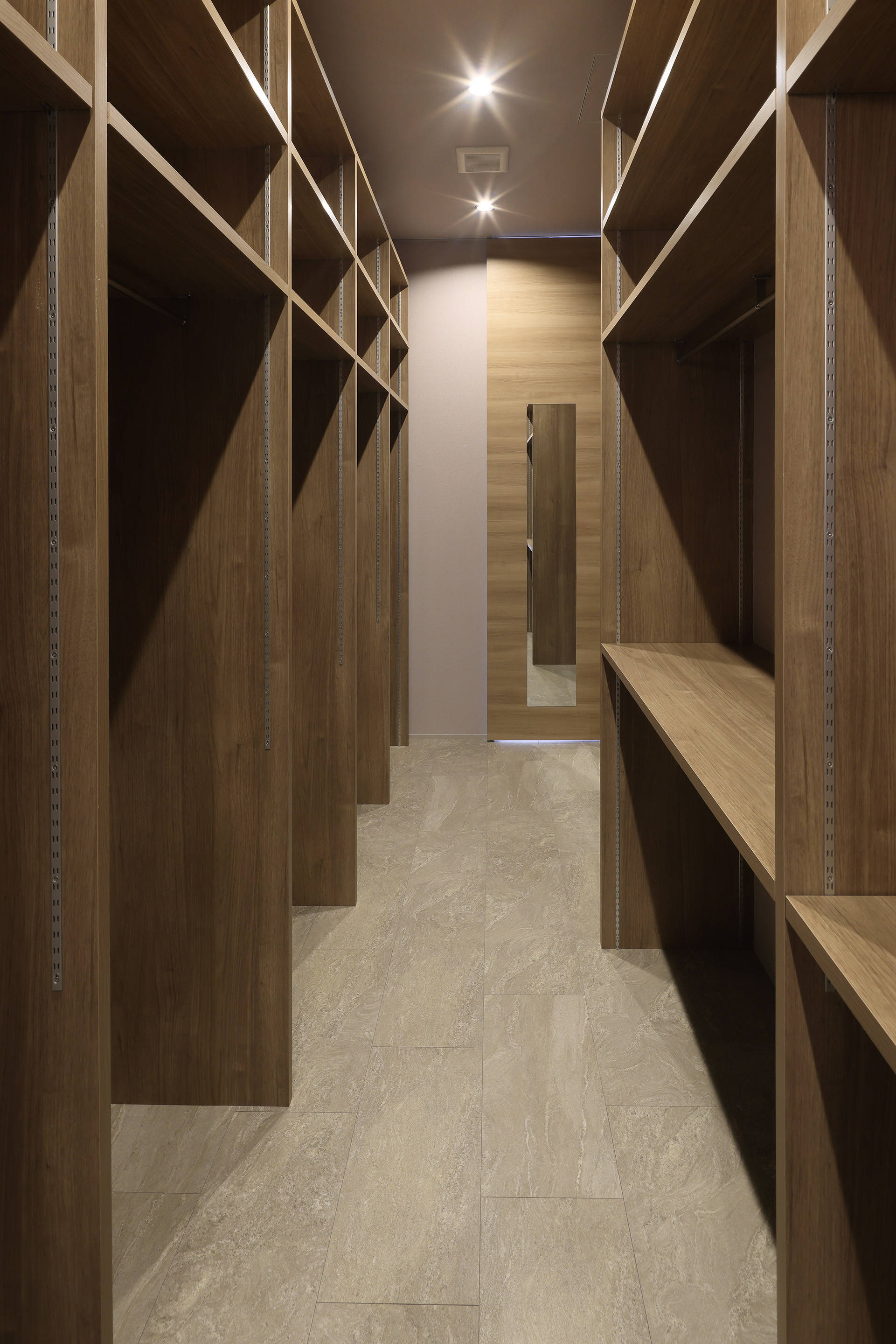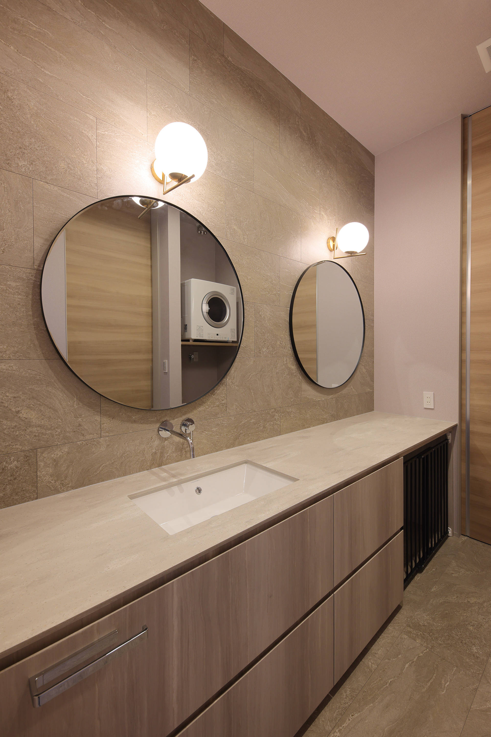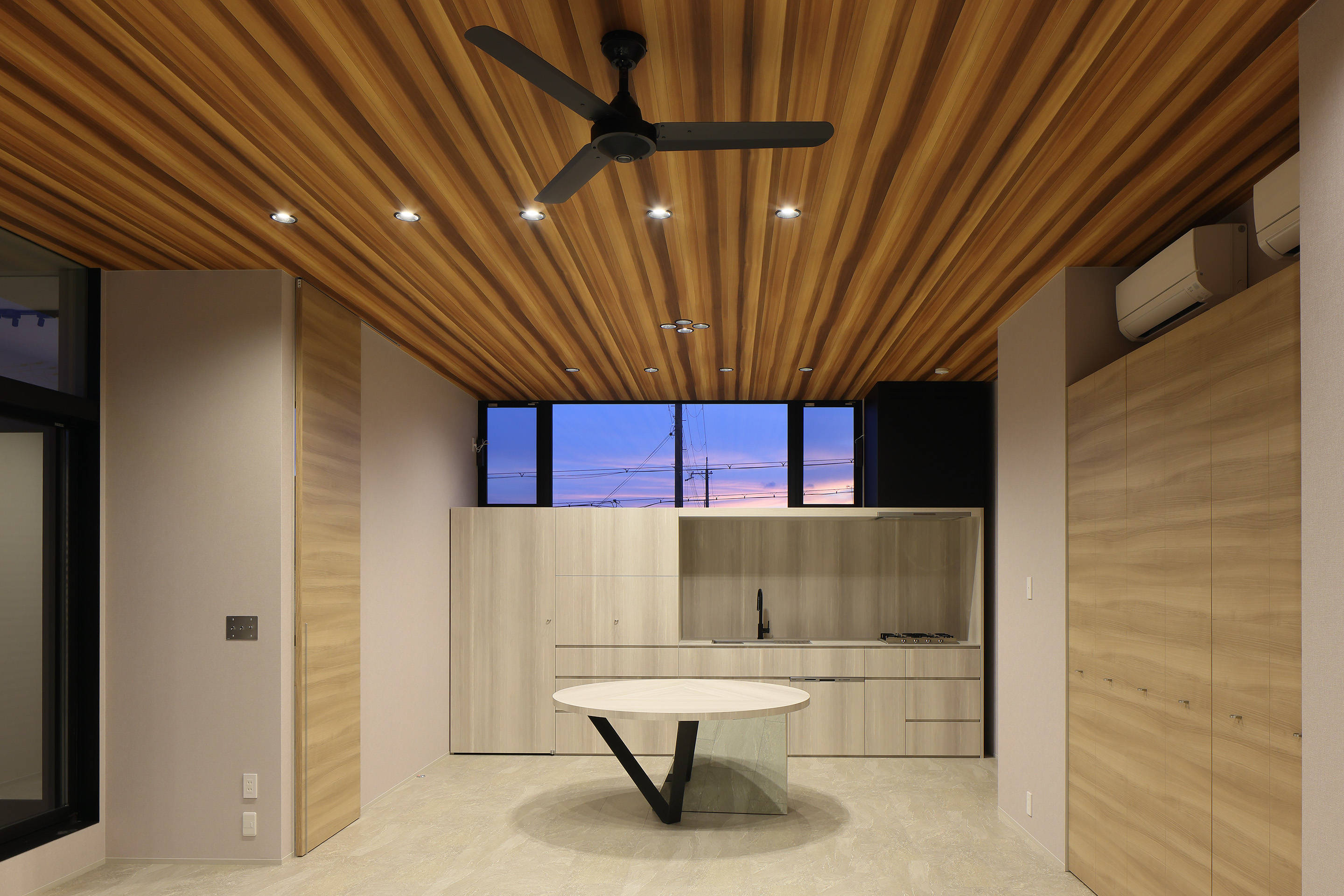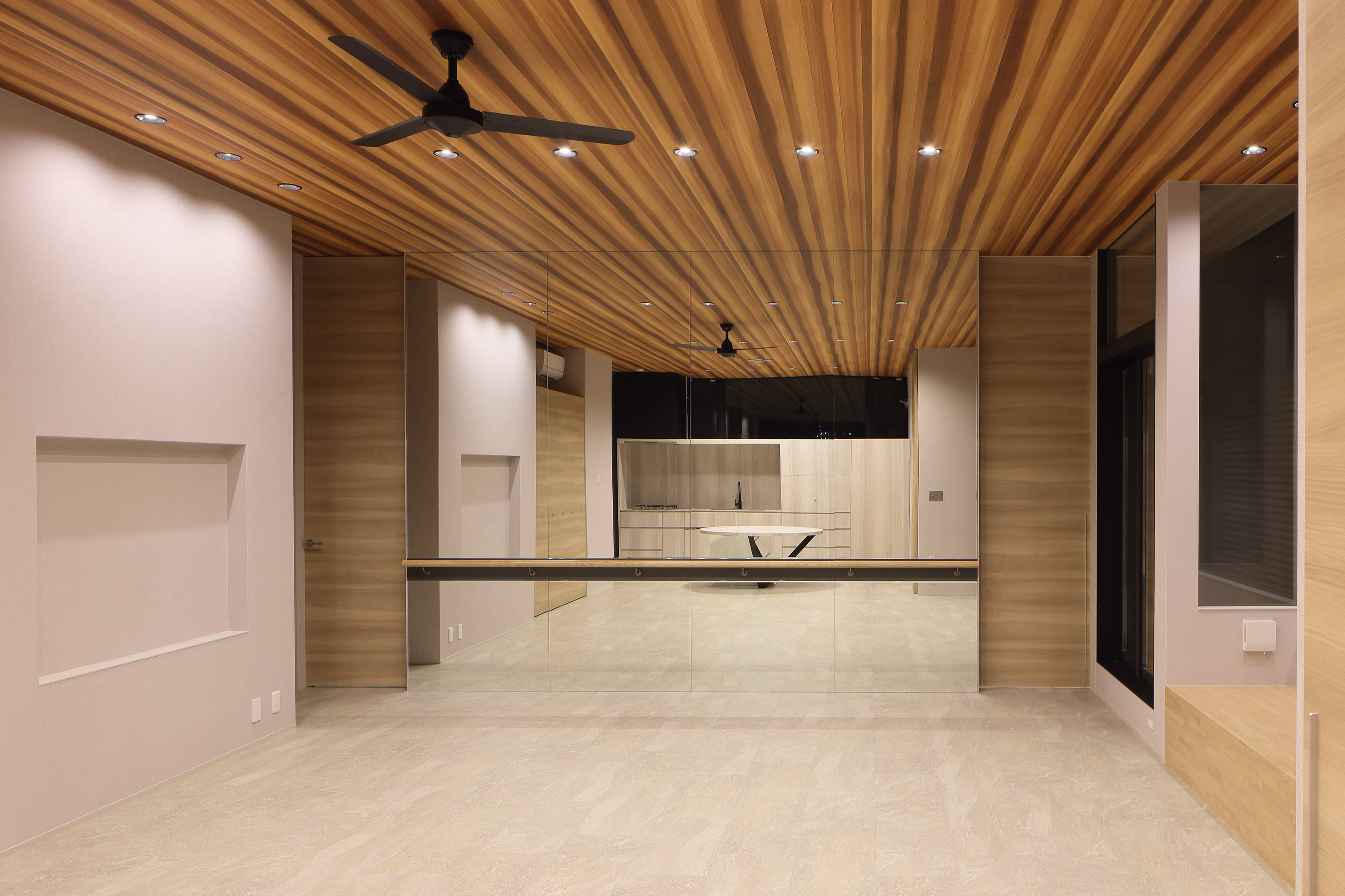 1階は親世帯、2階は子世帯として計画しました。2階が家族の憩いの場となる為、LDK空間をなるべく広く設けました。より広く見えるよう天井高さを3mとし 一面鏡貼りとしています。