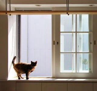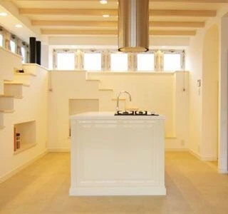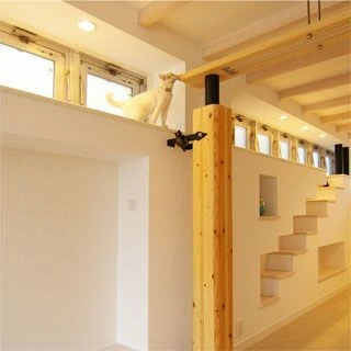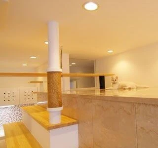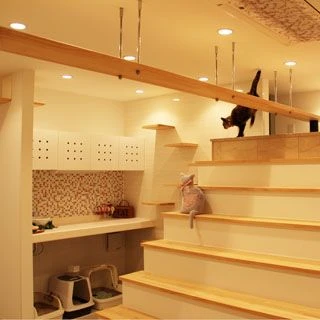 猫大階段と猫壁(階段や飾り棚を掘り込んだ壁面)を最初に導入したプロジェクトです。床は600角セラミックタイルで温水式床暖房を採用。さらに猫大階段の頂上には猫の岩盤浴場があり、冬は自然と猫が集まります。