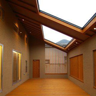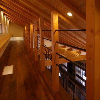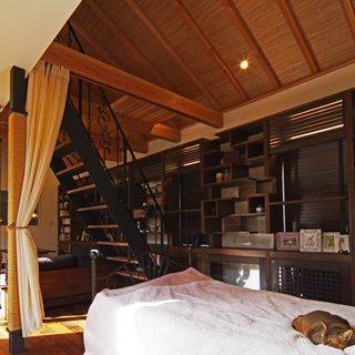 105mm幅の登り梁ではなく、90mmまで細くした梁をあらわしにし、葦で天井を仕上げた空間はその一例で、バリモダンな空間となっています。