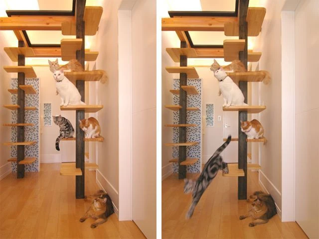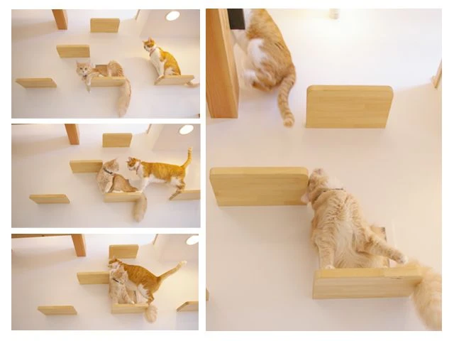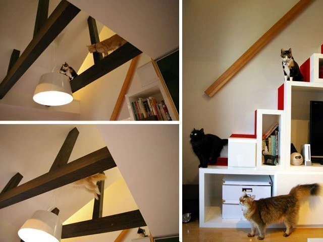 当プロジェクトでは「家」という限られたボリュームの中で、たくさんの猫達が自由にテリトリーを獲得することができるように、回遊性を持ったさまざまな猫専用動線が家屋内に縦横無尽にめぐらされています。それらの装置は個体群密度の調整にも役立つことを意図して計画されました。そして、飼い主は、この猫専用動線を舞台とし、猫たちが自分たちの世界(=秩序)を美しく構成していく過程を、日々楽しく観察できることでしょう。