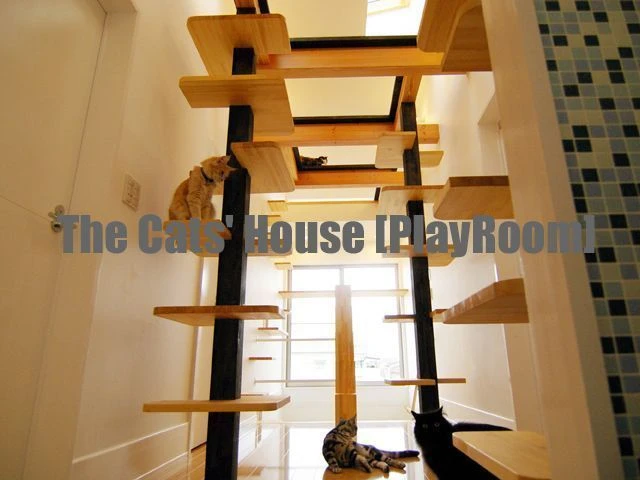 弊社オリジナルのキャットツリー、キャットウォーク、猫トンネル、猫階段、猫ステップ、猫穴、猫家具などの猫専用動線には、ライハウゼン博士の理論を反映した、行動学的に意味のある仕掛けが施されており、それでいて人間が簡単に掃除できるようにも工夫されています。たくさんの犬や猫の世話が楽になるような、気の利いたアイデアも随所に盛り込み、屋上ドッグランもある実験的ペット共生住宅です。