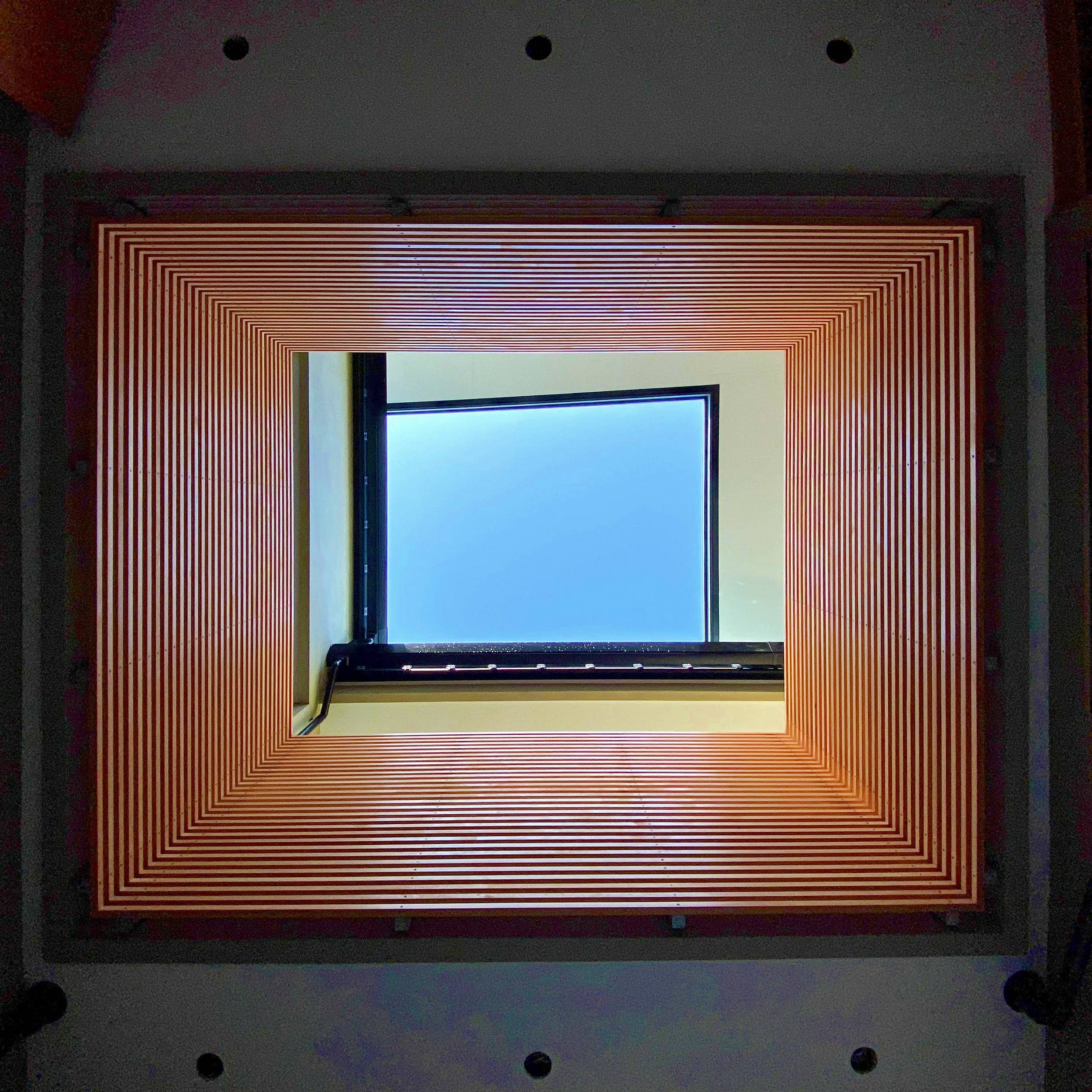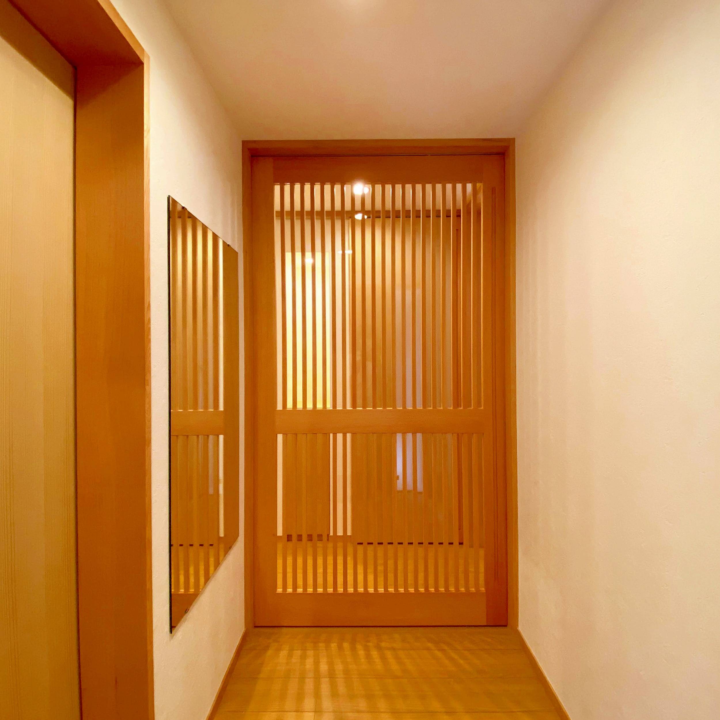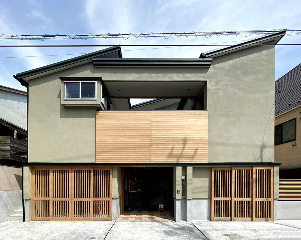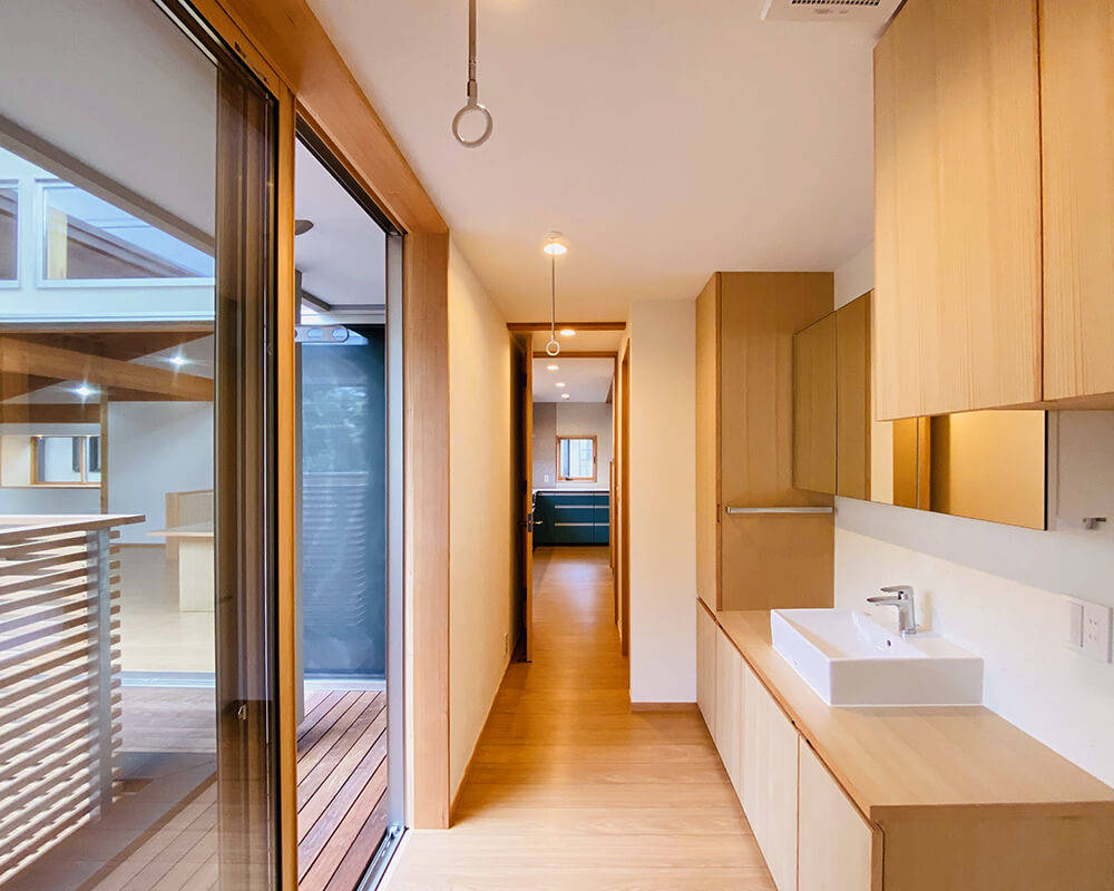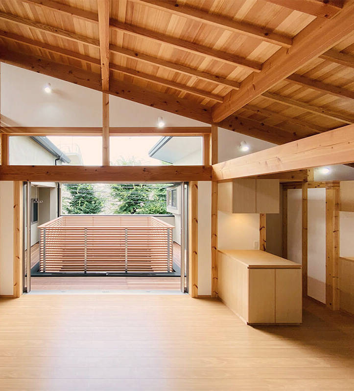 ご要望された屋根勾配を活かせるよう、木組み架構を空まで伸びやかに上昇するように設計しました。外部にも木製建具を使用することで、街並みに対して優しい住まいの印象となることを心がけました。2階の中庭にはLDKや子供室、洗面脱衣室などが大きな窓を通してつなげられ、体感的な広がりは60畳以上にもなります。光や風が導かれる中庭を軸とする住まいは、自然を内部に取りこみつつ豊かな場面を日々演出してくれます。
