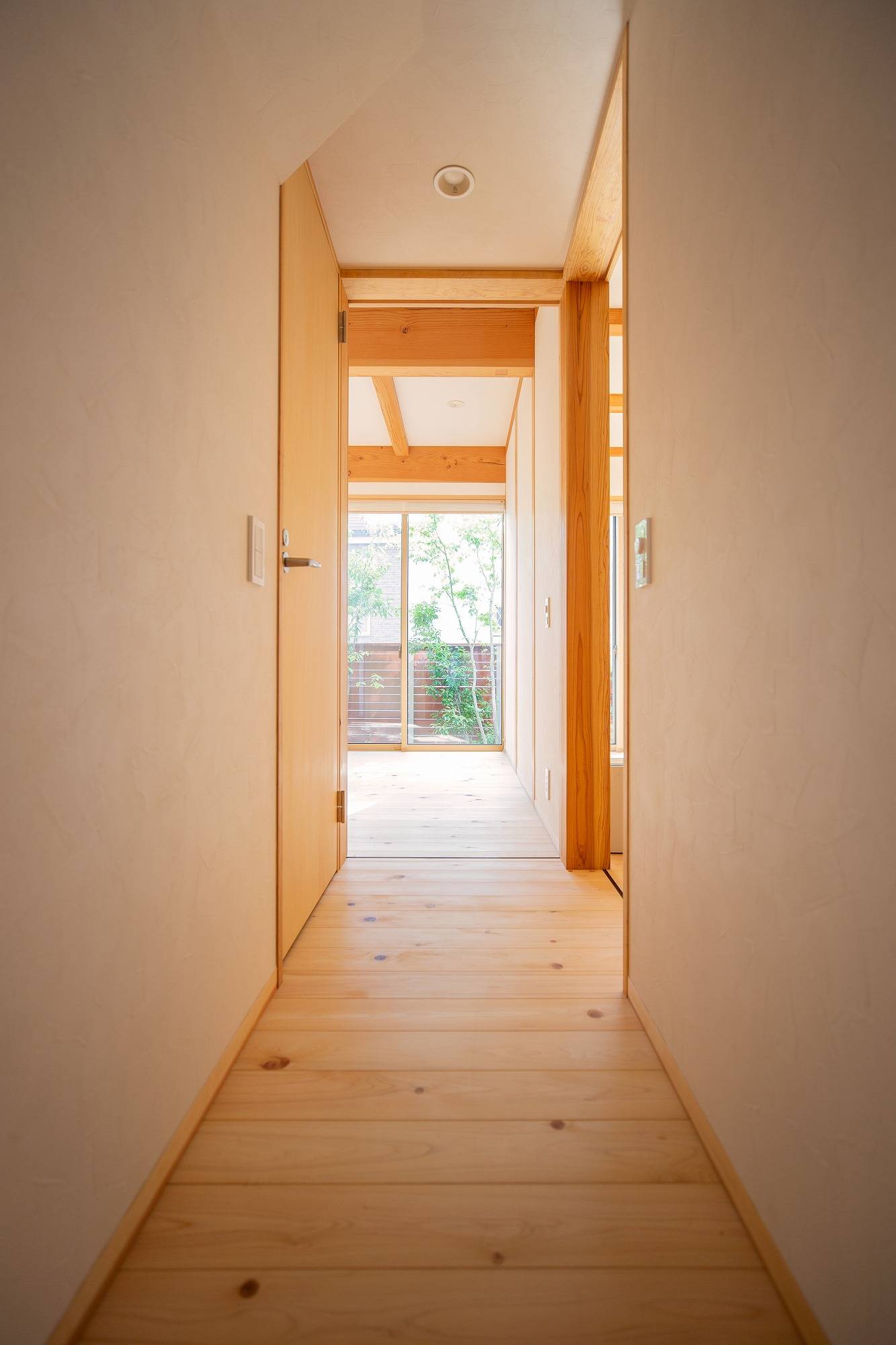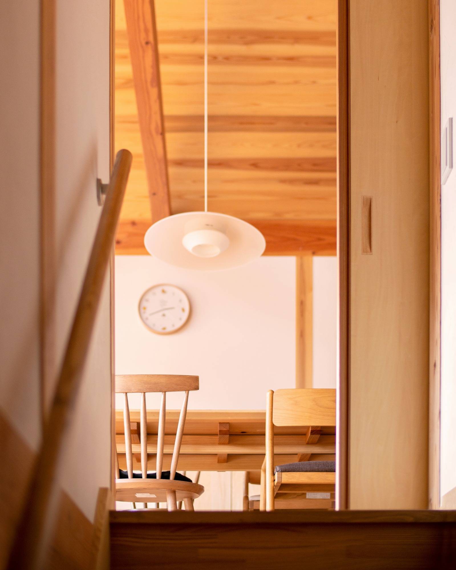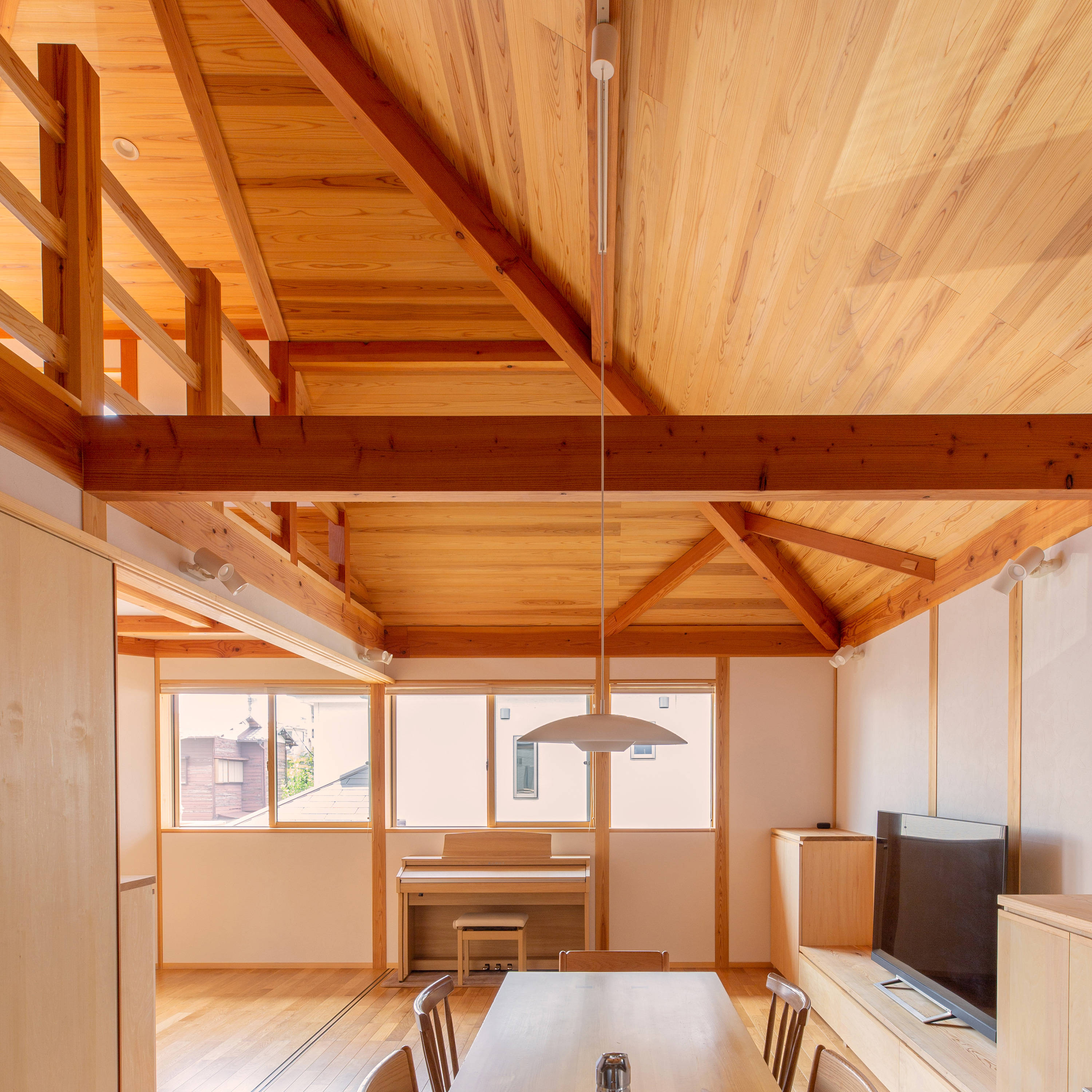 内部の特徴は、日本伝統の木造技術や木の美しさを、住まいの各所に現れるように配慮したことです。構造としての木組みを素直に現しながら、それぞれの部屋に異なる空間が楽しめるようにデザインしました。歩みを進めるごとに力強い空間や上昇性のある空間、遊びのある空間など、多彩に木造り空間・木架構が展開します。木の元来の香りや成分を活かせるよう、乾燥方法にもこだわったものを採用しています。さらに棟梁の動く木材への深い造詣、ピッタリと組まれた部材、時間の流れにも耐える技法と納まりも、住まいを魅せるように配慮。ディテールと伝統木造建築の技術は木組み空間と混然一体となって、住まいに深みを醸し出しています。