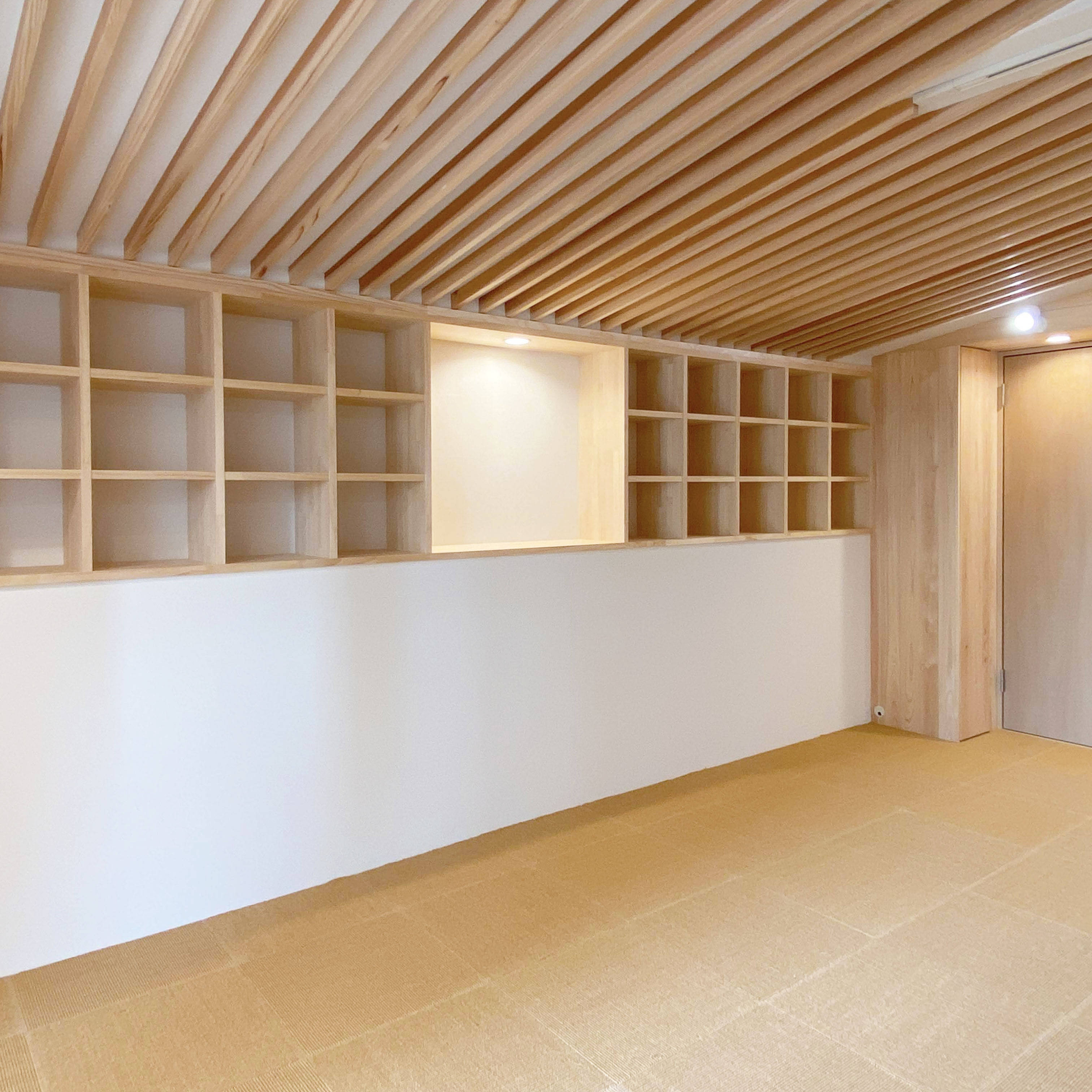 コンセプトから導き出されたのは、身体のストレス低減効果が実証されている、無垢の木を中心につくることです。木は30~50%程度目に見える形で現わすことや、無塗装で仕上げることで、高いリラックス効果が生まれます。左官の珪藻土や天然麻タイルカーペットも無垢の木と合わせて採用することで、調湿や消臭、有害物質の吸着分解などの効果に秀でています。