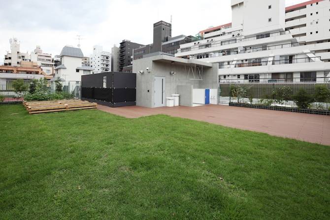 また、街路に面したビオトープがある園庭から階段状にテラスや季節感ある固有種の植栽が屋上まで連なり、屋上の野芝で遊べるキッズフィールドや夏のプール、栽培体験が出来るキッズファーム、ぽかぽか日光浴ができるテラス、外壁を利用したアスレチック、自分たちで育てた収穫物や多国籍の食材で料理に挑戦出来るキッズキッチン、オススメの絵本を紹介している隠れ家の様な階段下のキッズライブラリー、音楽や絵画造形に特化したキッズスタジオ等、子どもの好奇心を刺激する遊び場を内外の各所にちりばめている。