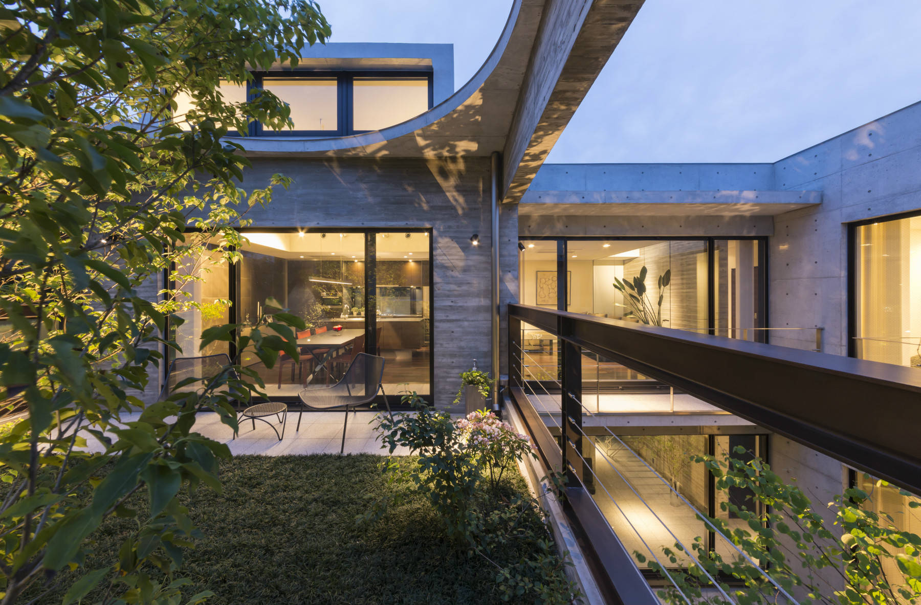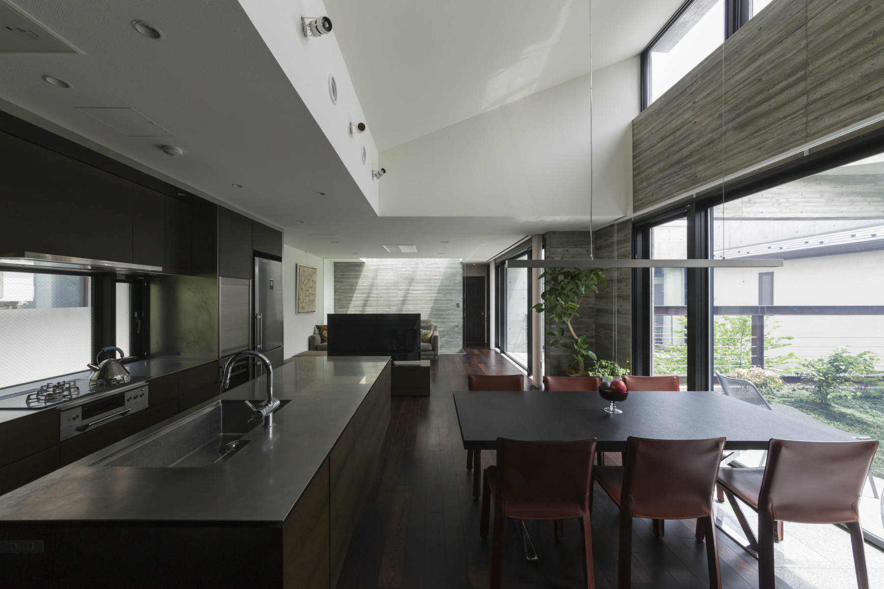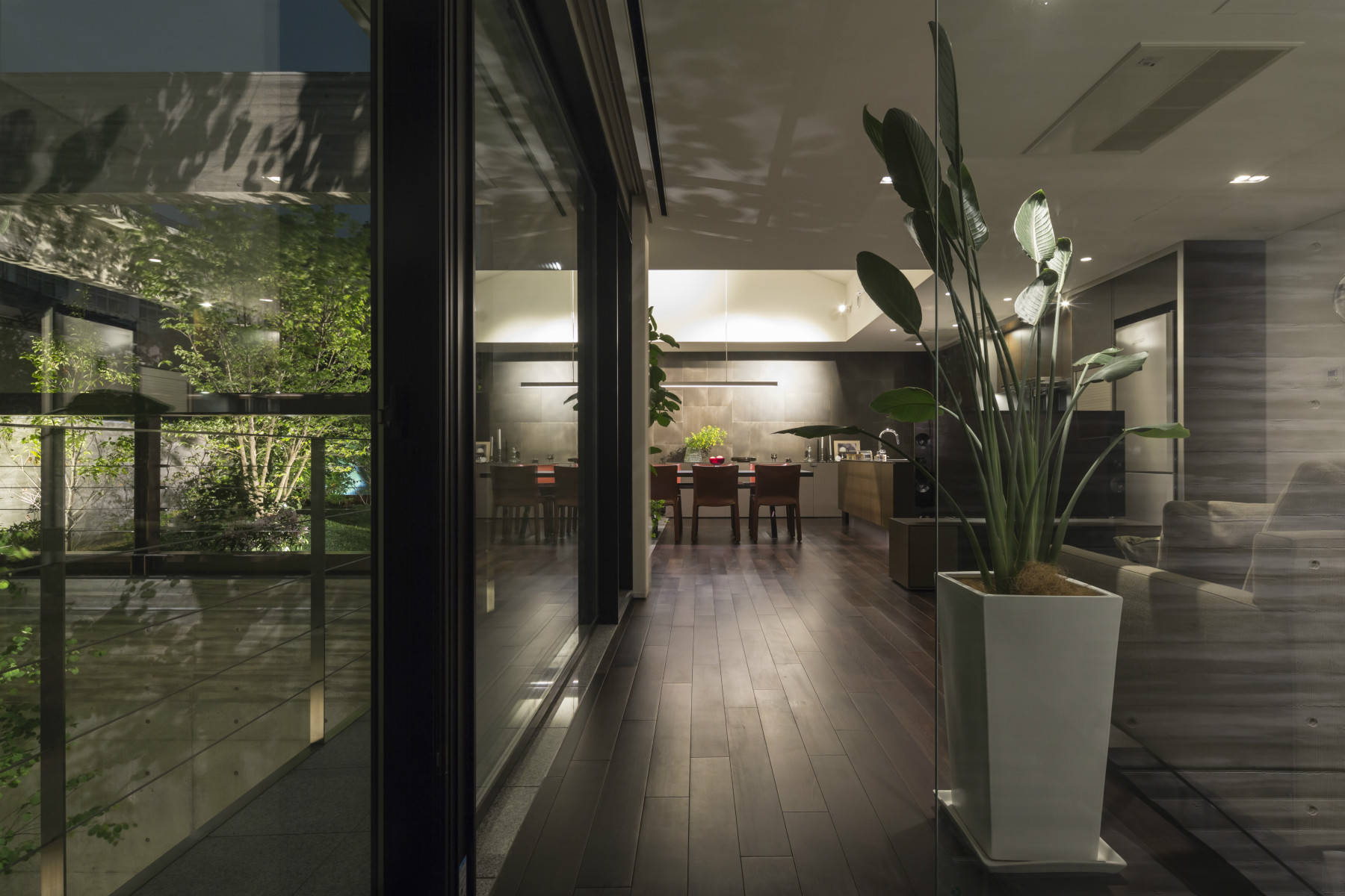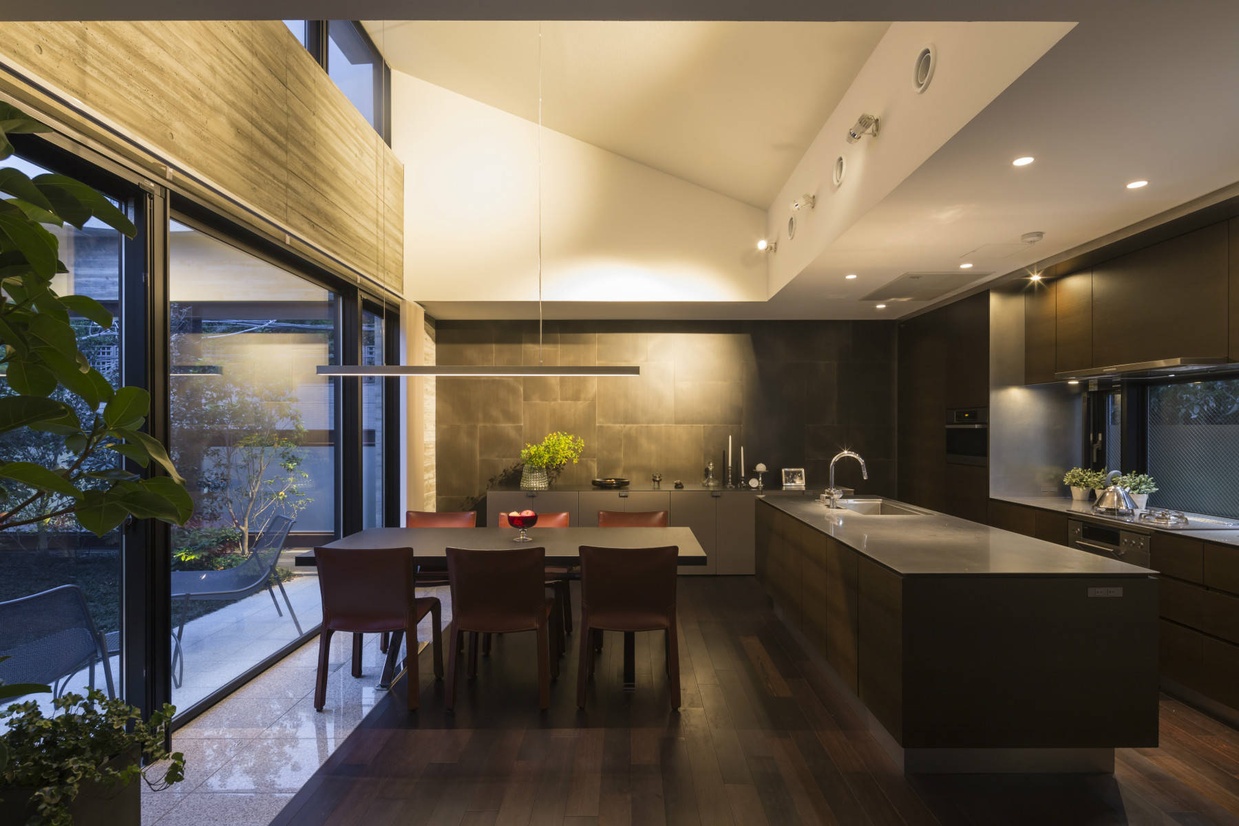 1階には子供室と予備室、2階は主寝室とリビングダイニングという構成になっている。階段を上がると1階から2階へと連続する樹木の緑が広がっている。部屋の奥にある特殊な金属で仕上げた壁が、視線を奥へと誘導する。そして、その奥の2階レベルにある庭は、上部の丸くくり貫いた穴から、樹木の枝が空へと延びてゆき、意識を天 空へと向かわせる。