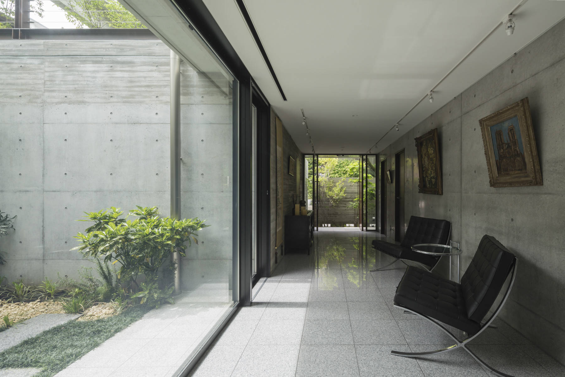 道路からのアプローチは、狭く効果的に緑化された玄関ポーチを通り、コンクリート壁やコールテン鋼の天井により、僅かに圧迫感を与える様に意図的に行った。そして、コールテン鋼製の玄関ドアを開けると、広いギャラリー空間により意識が解放される。その視覚の先には硝子とステンレス製の階段、そして、それを明るく照らし出すトップライトからの光と中庭からの自然光。中庭の樹木と杉型枠のコンクリート壁そして光、といったシークエンスが心地よく出迎えてくれる。