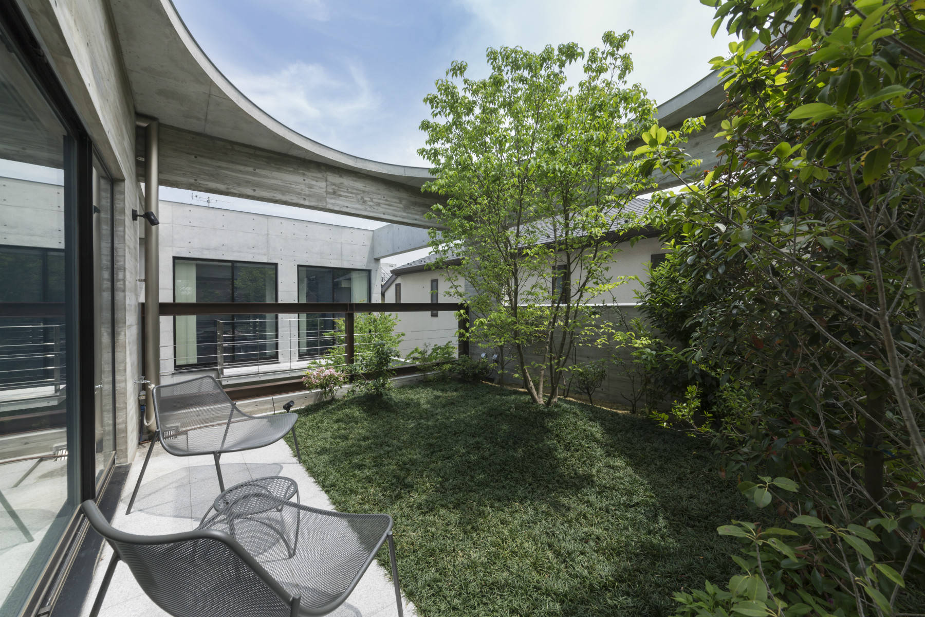 中心部に中庭を設け、隣り合う2階レベルの庭と二層に樹木を配することにより、道路越しにある高い隣地の樹々と視覚的に繋げることで借景となり、豊かな緑に囲まれていると感じることができる様に、小さな庭を配置した。