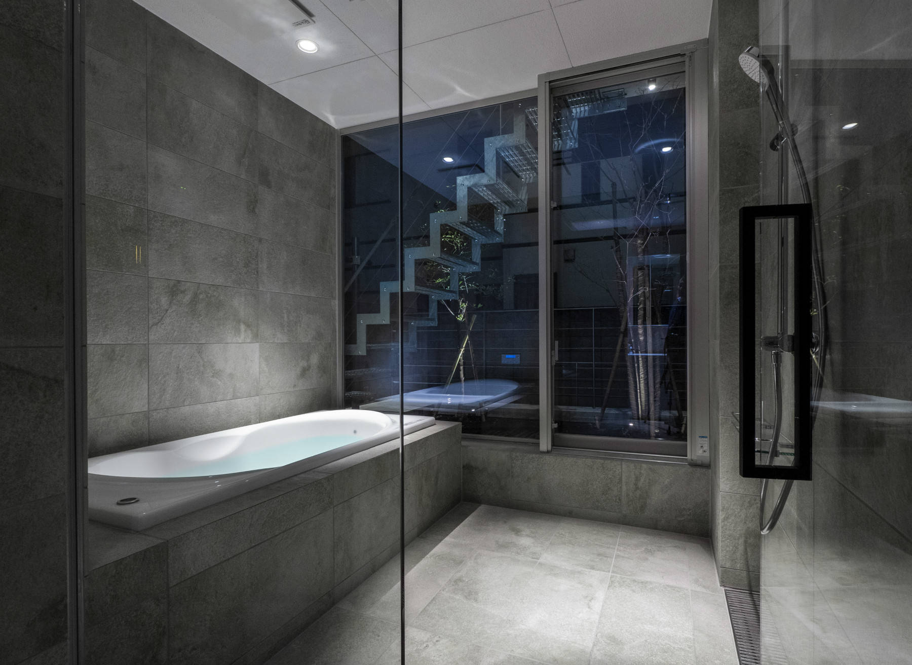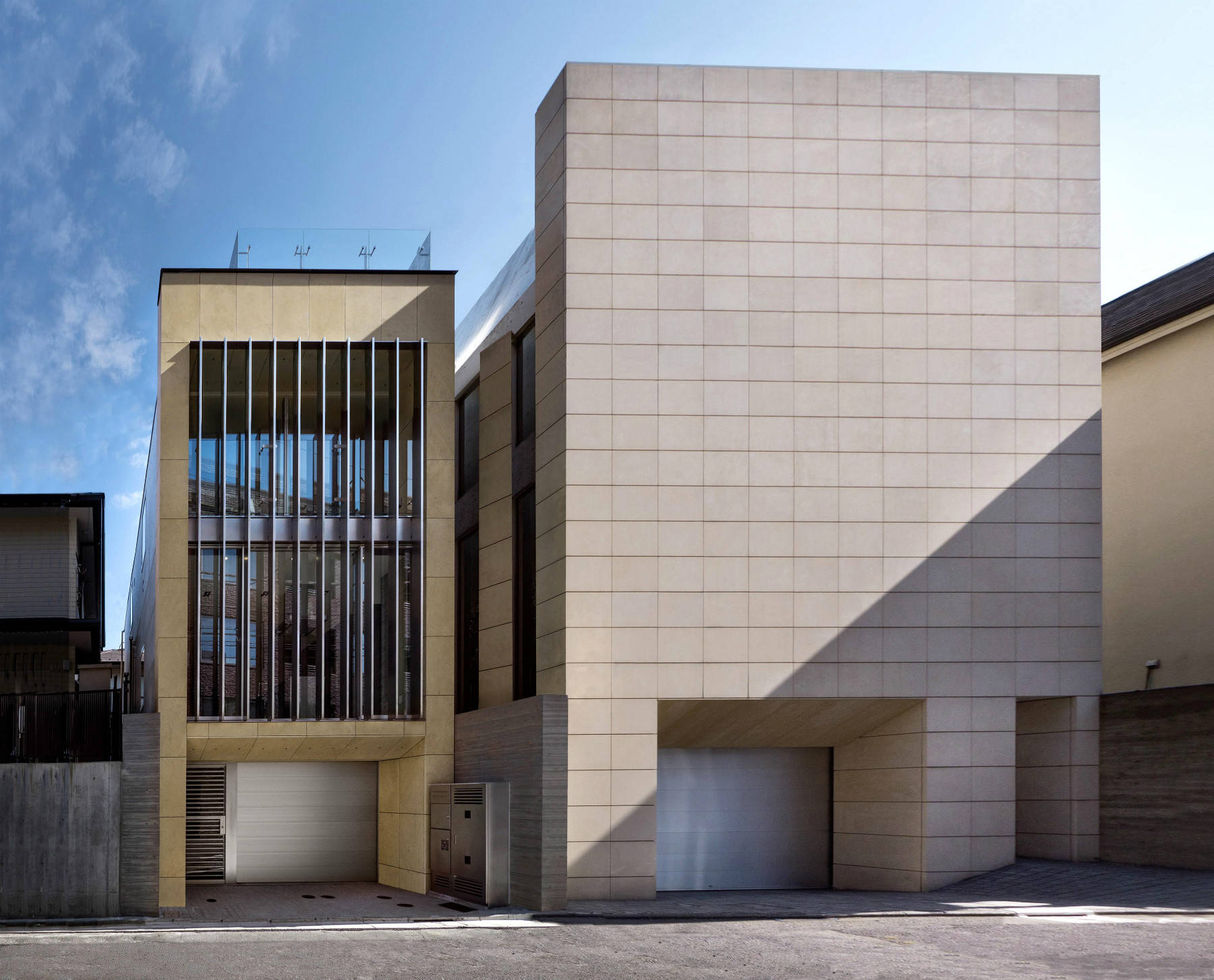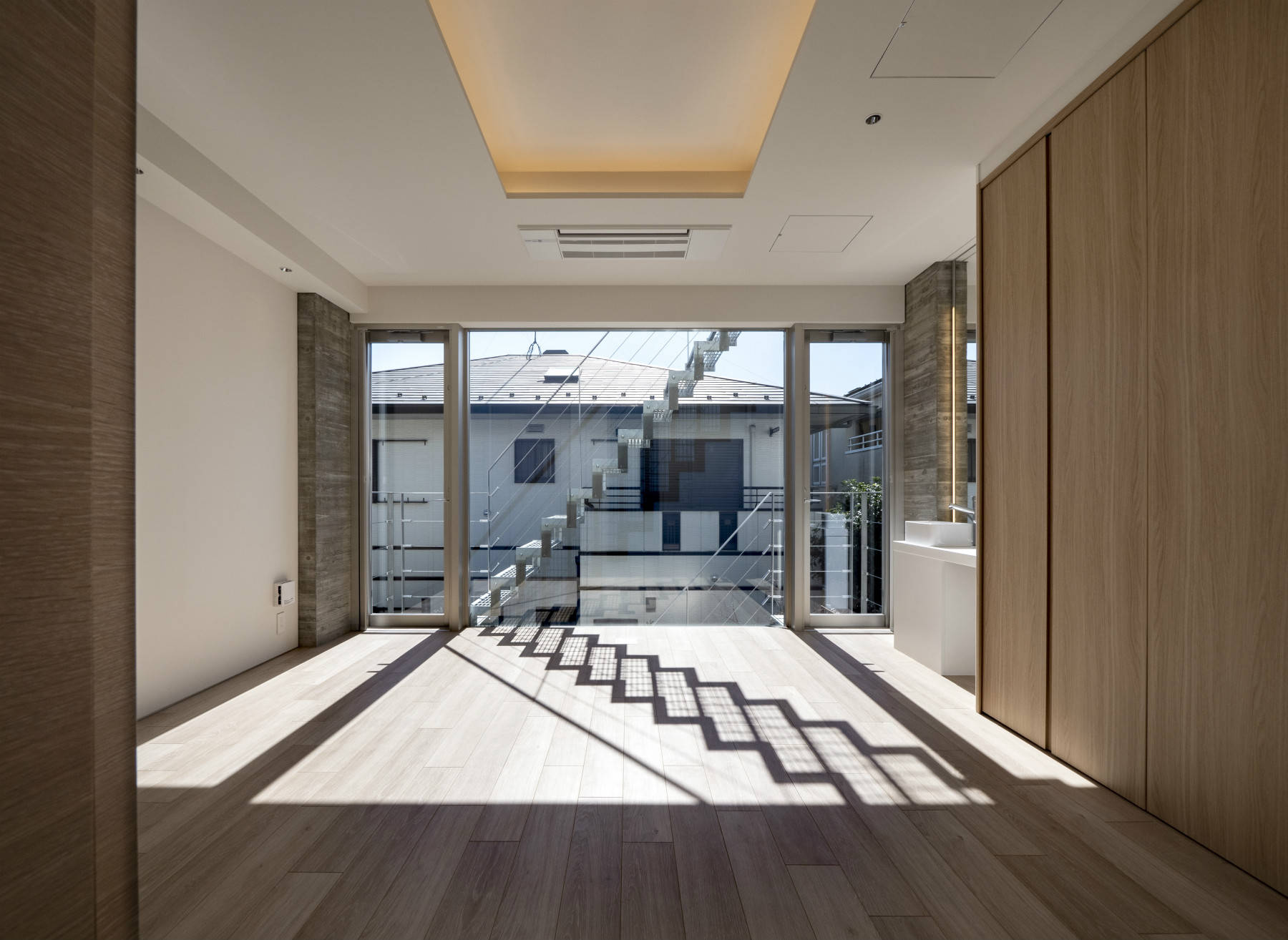 また、建物の間口を広くする目的で、二棟の間のほぼ敷地境界線上に寄せて建てた。その結果、建物の間口を50㎝広くすることができた。その他にも、室内に階段とエレベーターを設けるとプラン的に要求された部屋が確保出来ない為、階段を外階段とし、建築面積から除外してコンパクトなホーム用エレベーターのみで非常時以外は移動するという、かなり思い切った手法を採っている。これにより、広々とした空間を確保することができた。