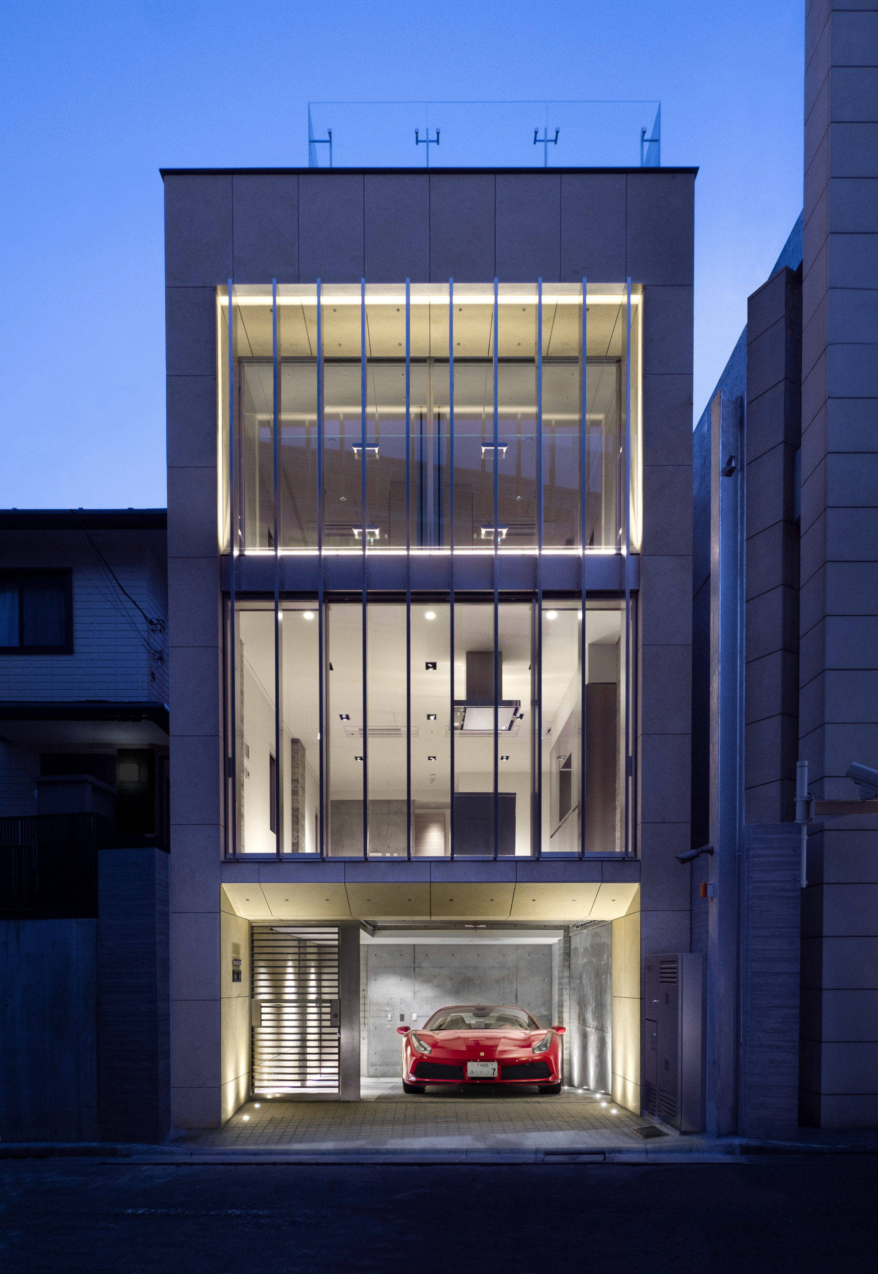 また、敷地の高低差を利用して地下に車庫を設け、その横に玄関アプローチを設けている。しかし、この狭い間口に大型のSUVを納める車庫は難易度の高い条件であった。