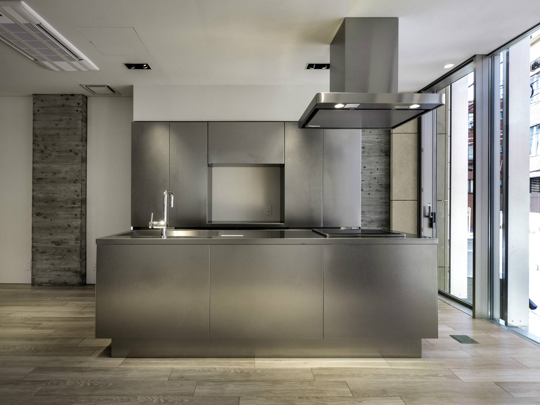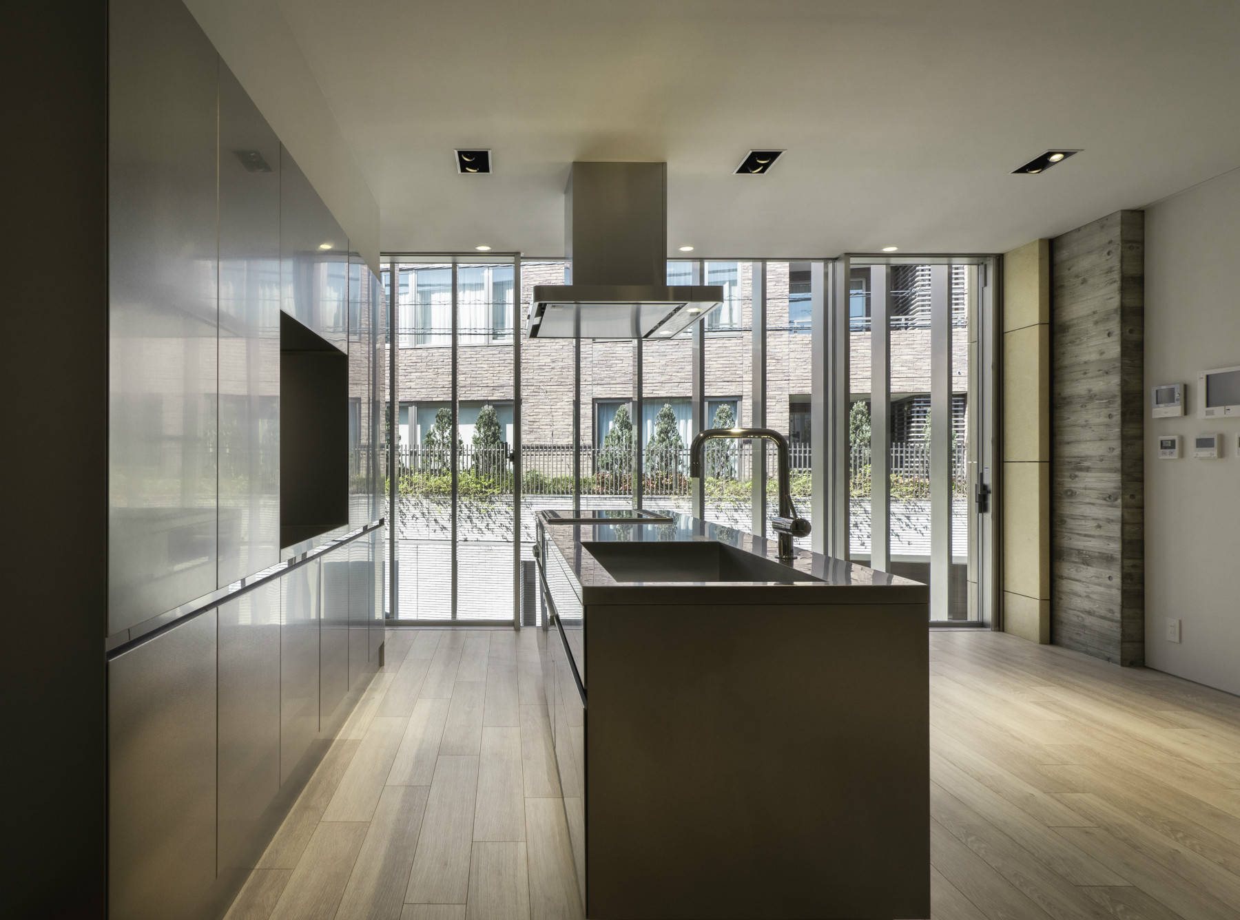 敷地は閑静な高級住宅街にあり、北側の道路から2m程上がっている。間口が5m程、奥行き17m、プランとしてはかなり難易度の高い条件であった。この敷地条件から当初、南と北側を全開口したチューブの様な構造を考えた。これを可能にするために、計画当初は柱と梁を幅60㎝、厚み30㎝の構造フレームを4本並べた薄肉ラーメン構造で架構することにした。しかし、短辺方向の構造壁を適宜バランス良く配置することにより、壁式構造で成立させる事ができた。
