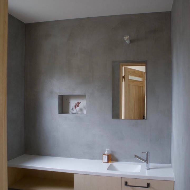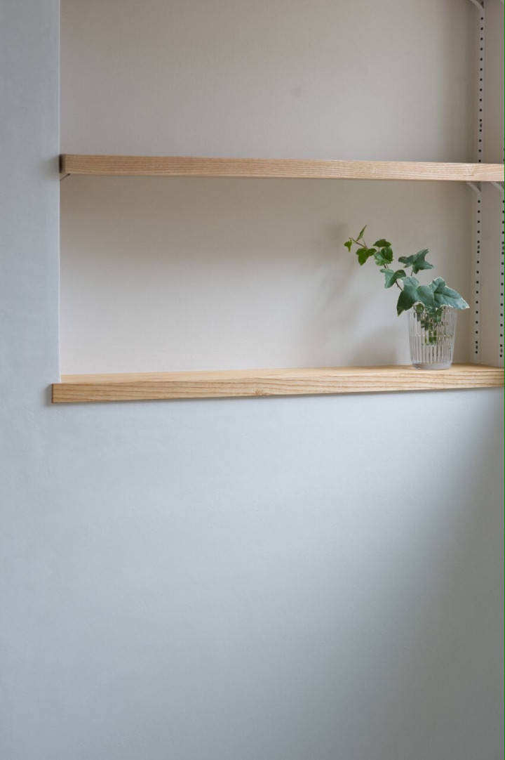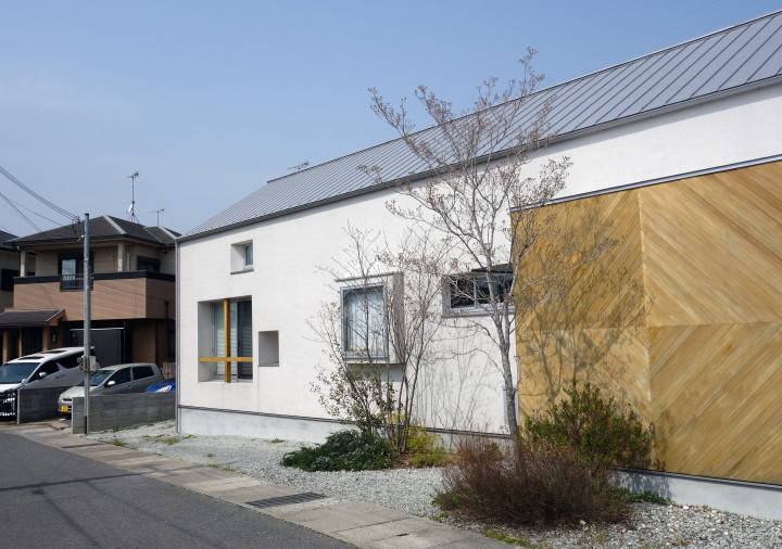 建物は、前面道路に沿って長いボリュームですが、高さが周りより少し低い分、とてもやさしい印象となりました。新築ですが、昔かららひっそり建っていたかのようです。周りの環境へも配慮された家は、一つの風景となっています。